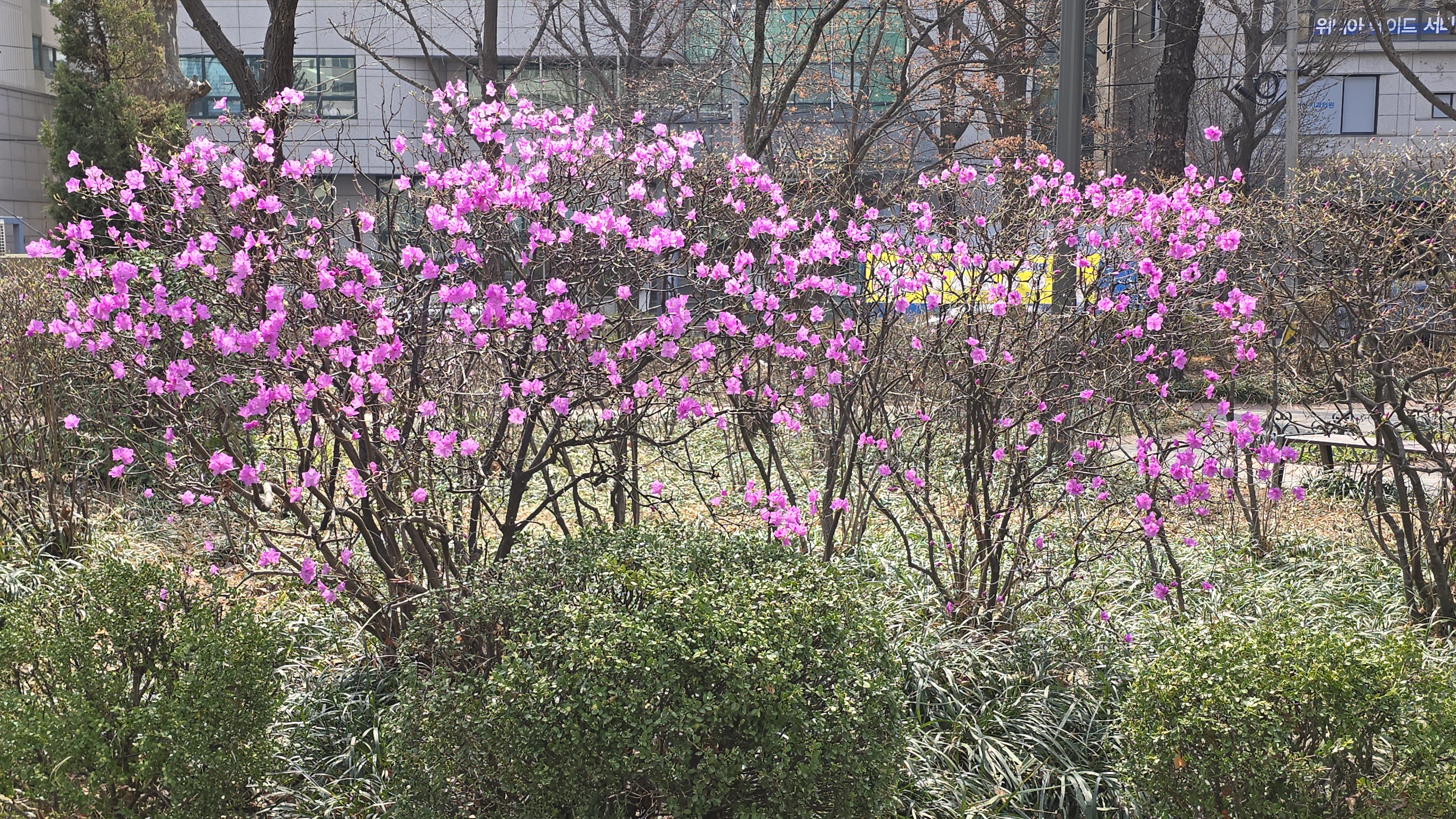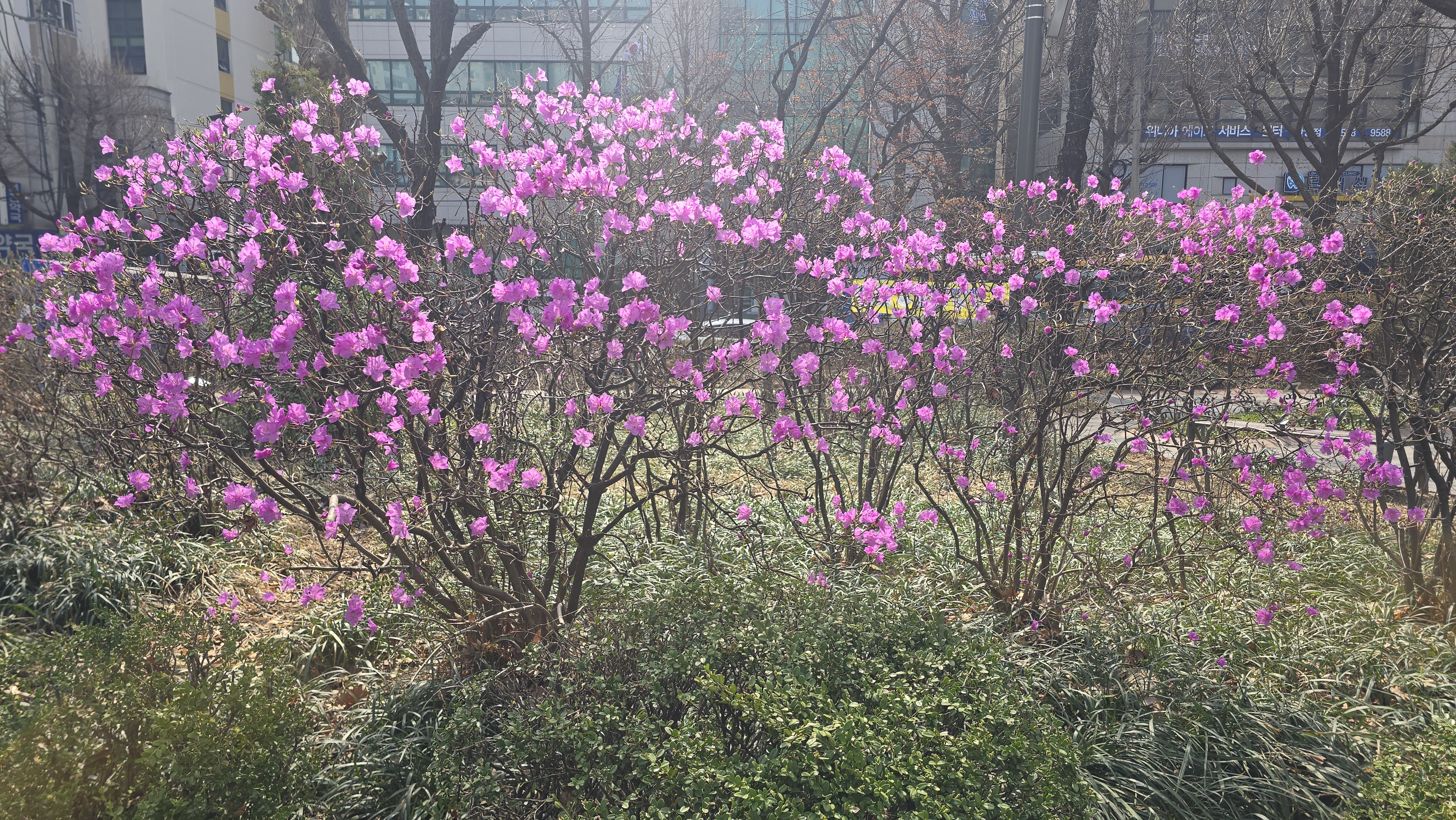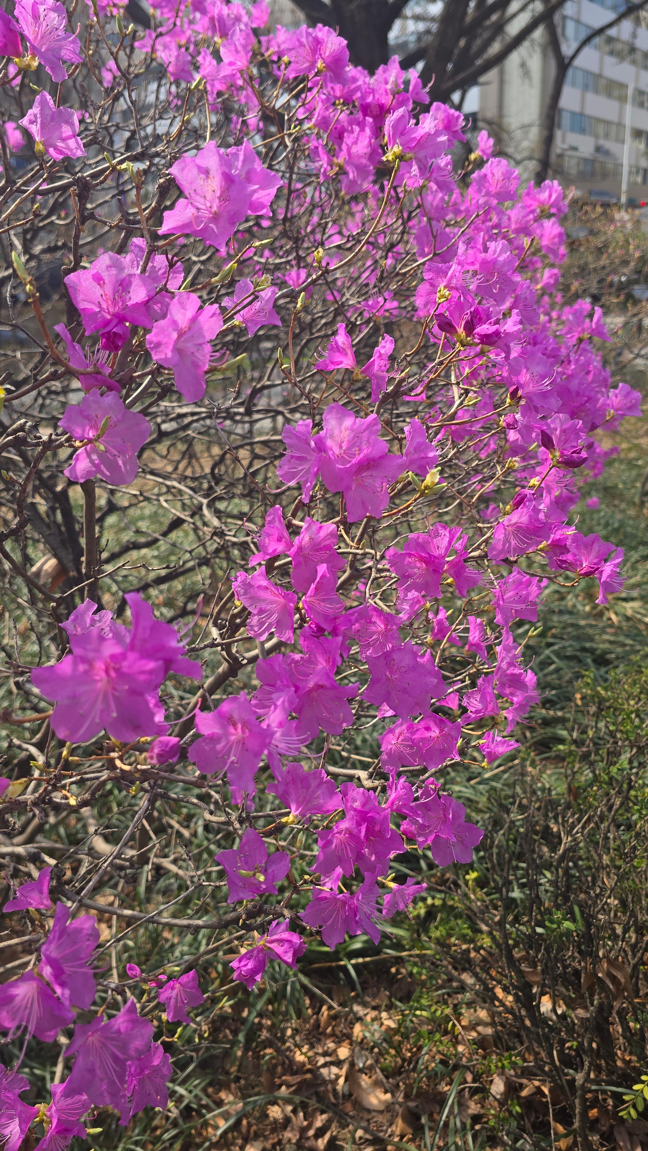 2025.03.24/ #도시기록 #안양 #진달래꽃 #만안구청/ 안양에서 진달래꽃이 가장 빨리 피는 만안구청 앞 마당. 꽃몽오리가 터지면서 진분홍빛 꽃이 화사하게 고개를 내밀기 시작했습니다. 진달래꽃이 피었다는 입소문을 듣고 사진 찍으러 오는 분들이 제법 많네요.