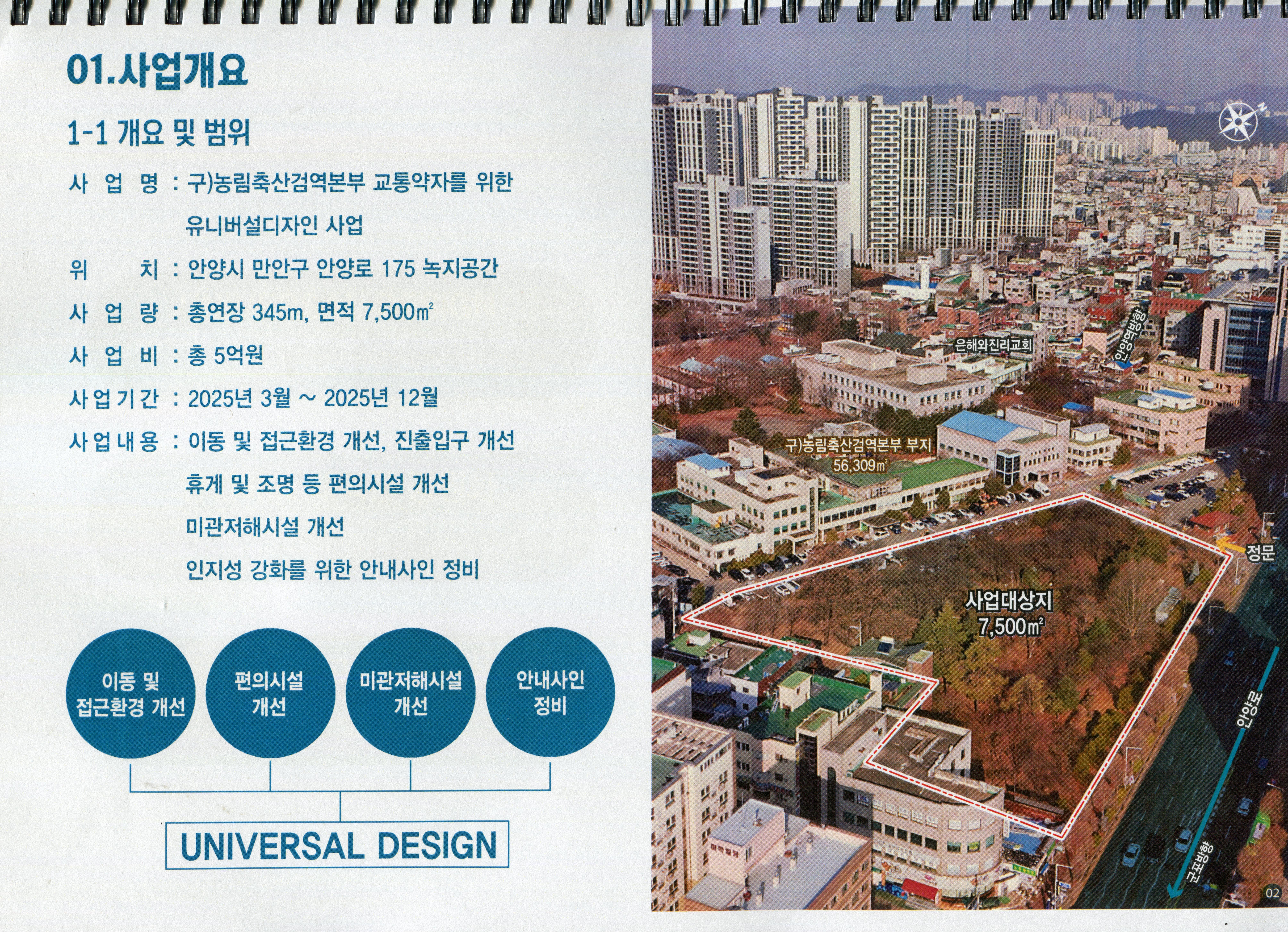 이번 유니버셜디자인사업은 본관 건물앞 정원을 대상지로 하여 2025년 경기도 공모사업에 선정되어 도비 30%(1억5천만원)를 지원받아 총 5억원을 투입하는 사업으로, 자연과 인간이 함께 공존하고 공생할 수 있는 환경으로 조성한다는 계획이다.