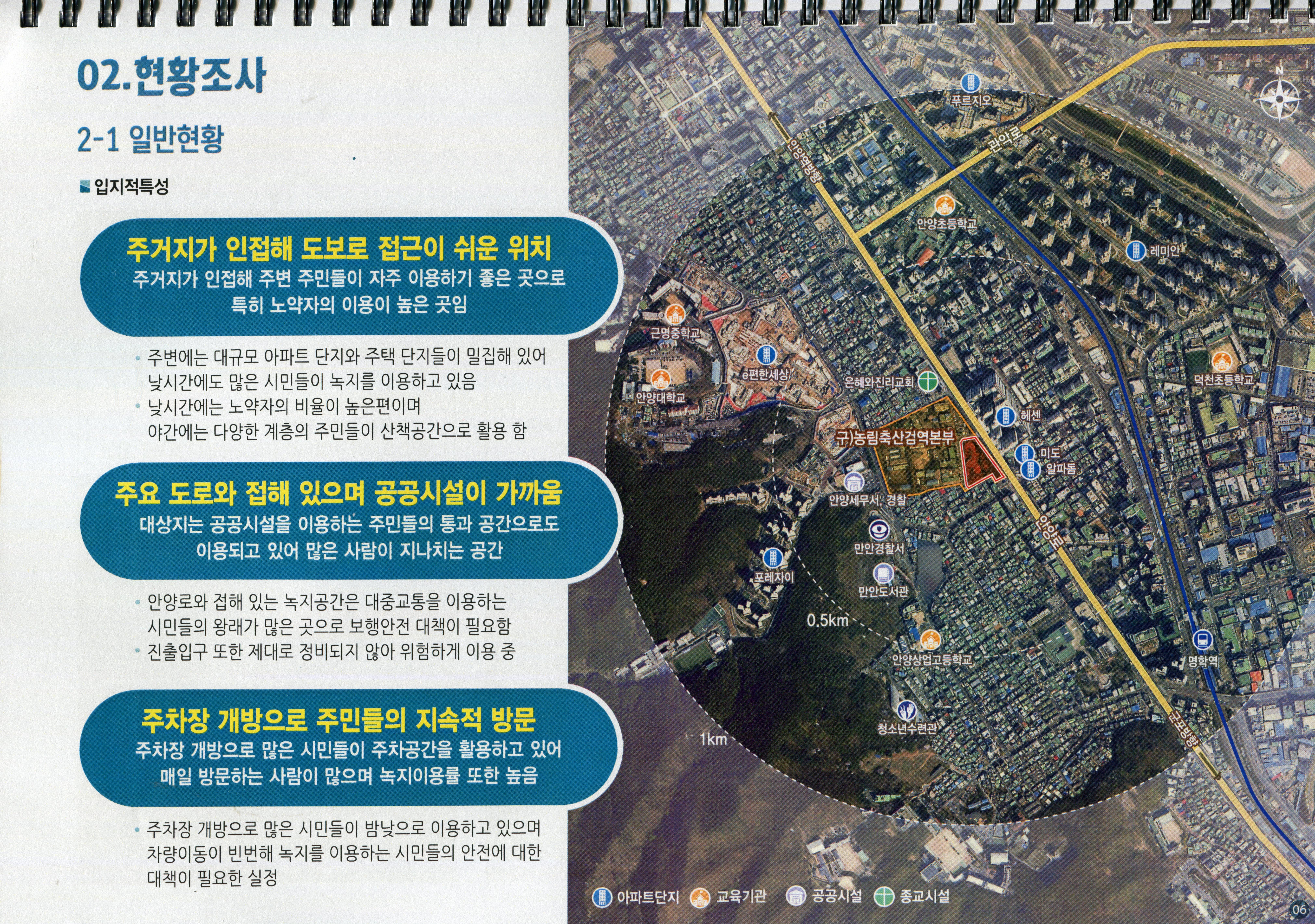 구)농림축산검역본부 부지는 현재 안양시청사 이전과 관련하여 부지 활용 방안을 검토중인 곳으로 검역원 전체 부지를 안양시가 부지를 매립한후 주민에게 정원과 일부 지역을 무료주차장으로 개방했다. 특히 본관동앞 정원은 자연환경이 뛰어나지만 시설 환경개선이 거의 이루어지지 않아 매우 불편하고 열악한 공간으로 끊임없는 민원과 개선 요구가 제기돼 왔다.