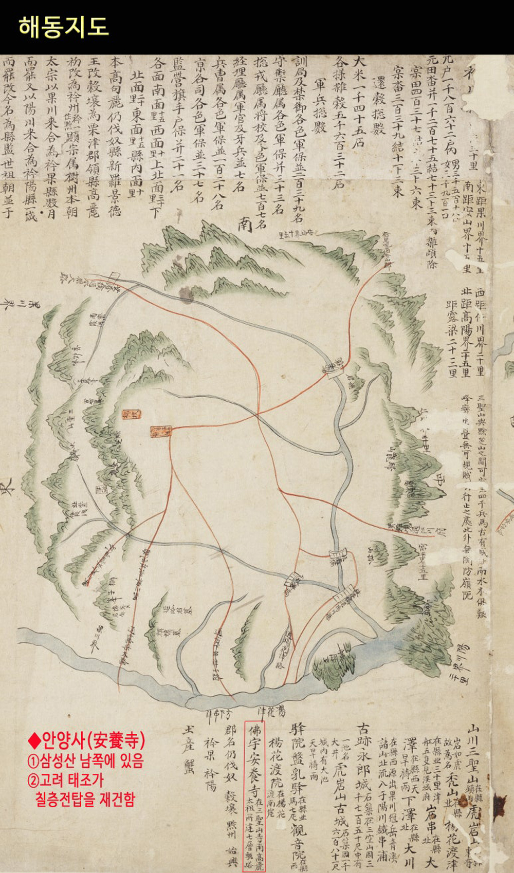 ⓖ 해동지도(18세기, 1724~1776년 사이에 발간)에 안양사가 삼성산 남쪽에 있고 고려 태조가 7층 전탑을 재건했다고 적혀있음