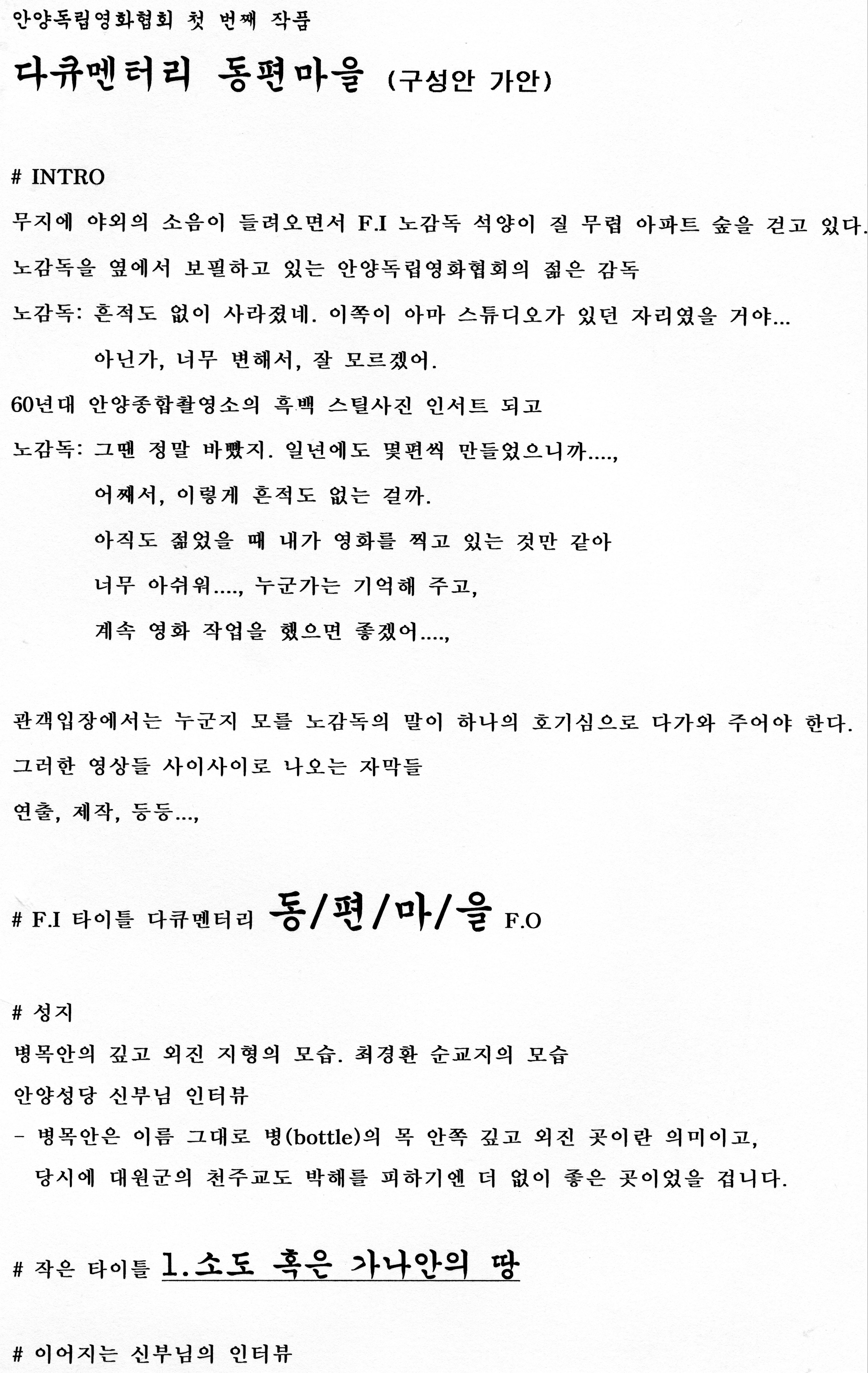 책장과 박스속의 오래된 옛 자료들을 정리하면서 발견한것은 2005년 안양에서 제작하려던 다큐멘터리 영화 '동편마을' 작품 개요와 시놉시스 그리고 당시 신문 기사의 자료들이다. 지난 2004년 영화에 관심있거나 관계하는 젊은 청년 영화인들이 안양에서 안양독렵영화협회를 출범( 총무 김병옥)하고는 변방영화제를 두차례 열기도 했다.