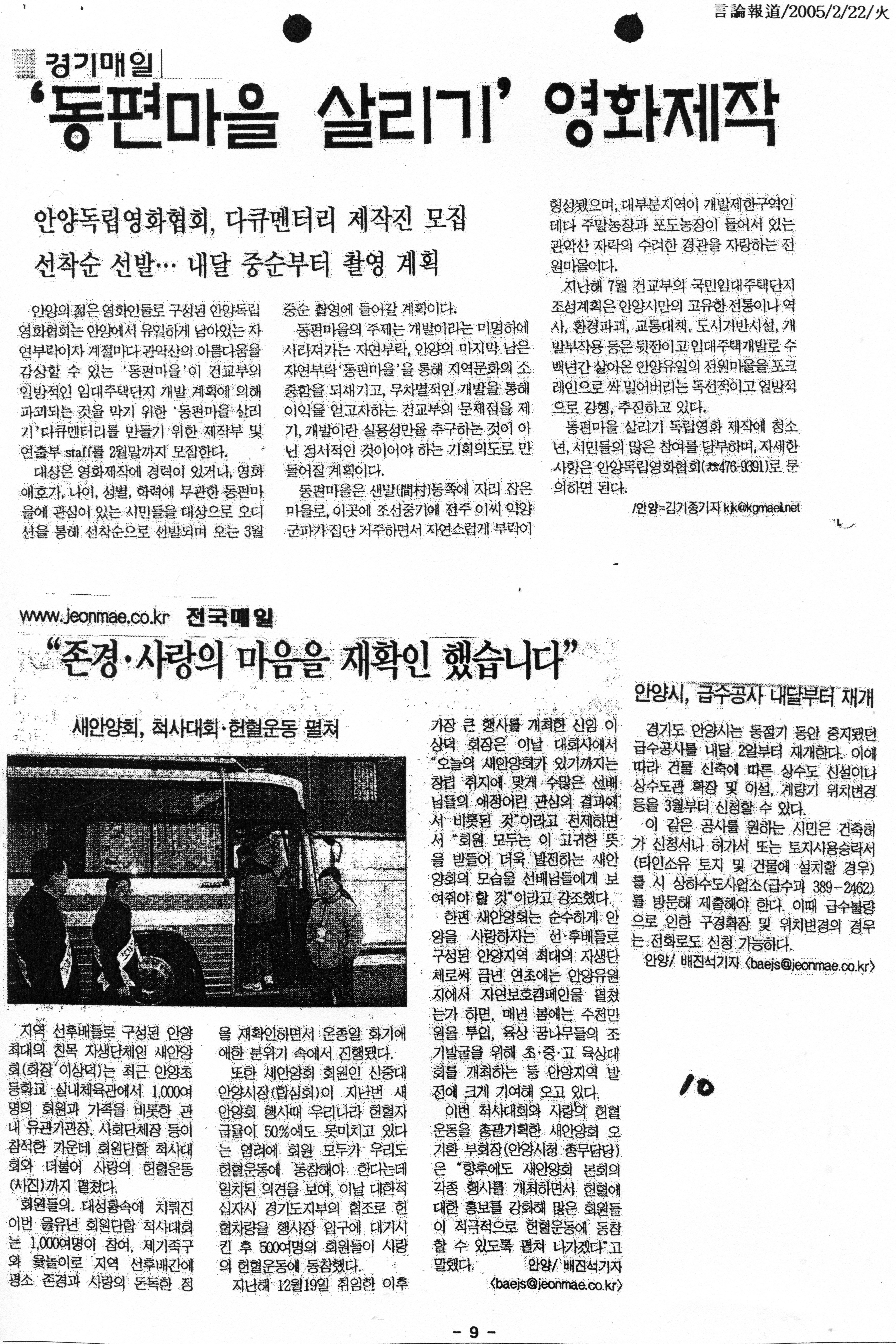 책장과 박스속의 오래된 옛 자료들을 정리하면서 발견한것은 2005년 안양에서 제작하려던 다큐멘터리 영화 '동편마을' 작품 개요와 시놉시스 그리고 당시 신문 기사의 자료들이다. 지난 2004년 영화에 관심있거나 관계하는 젊은 청년 영화인들이 안양에서 안양독렵영화협회를 출범( 총무 김병옥)하고는 변방영화제를 두차례 열기도 했다.