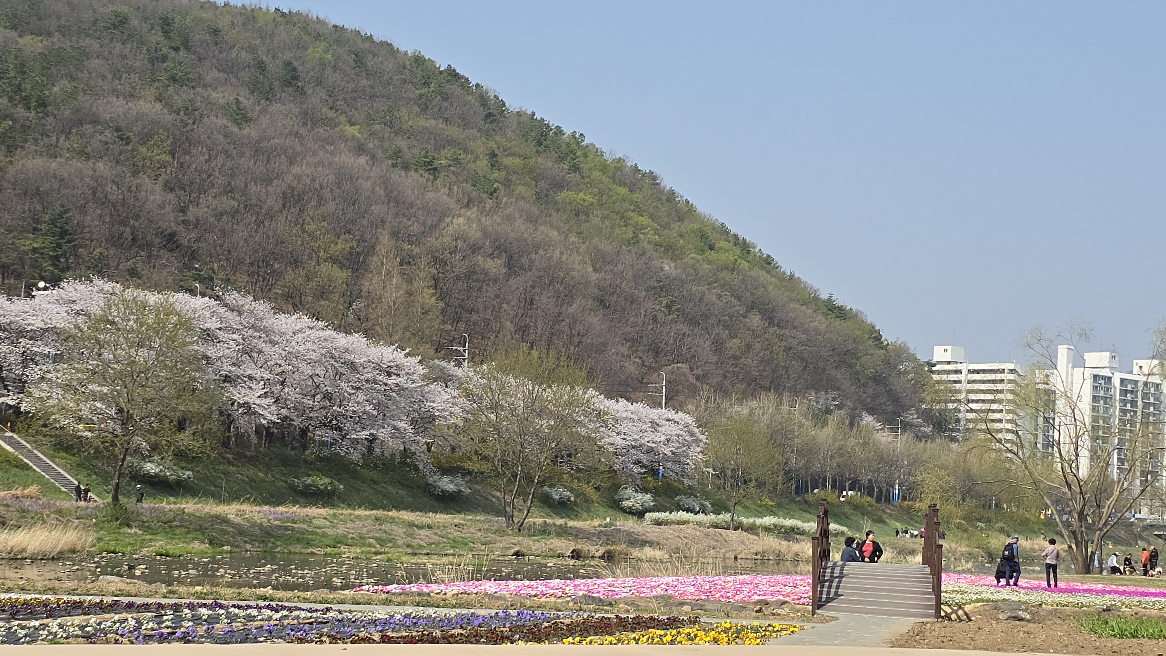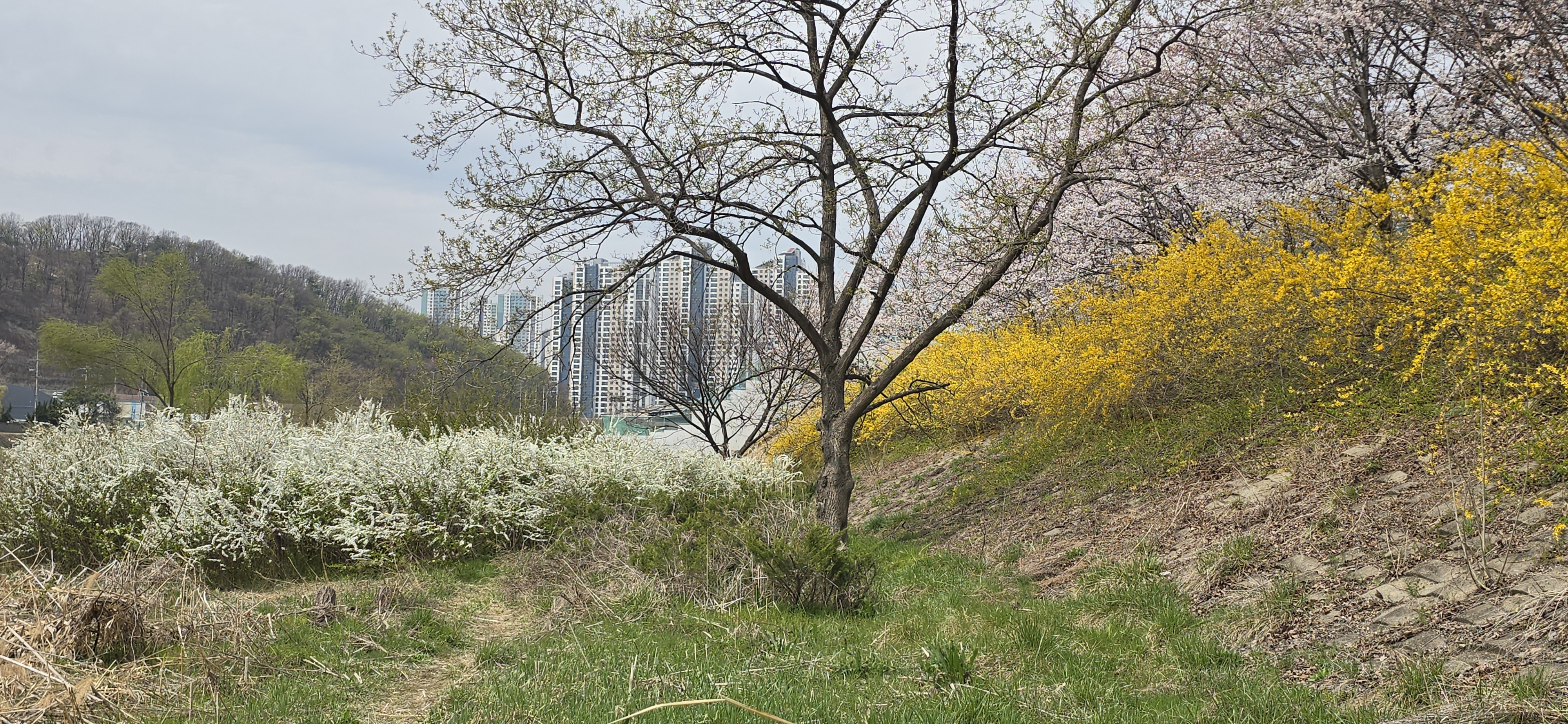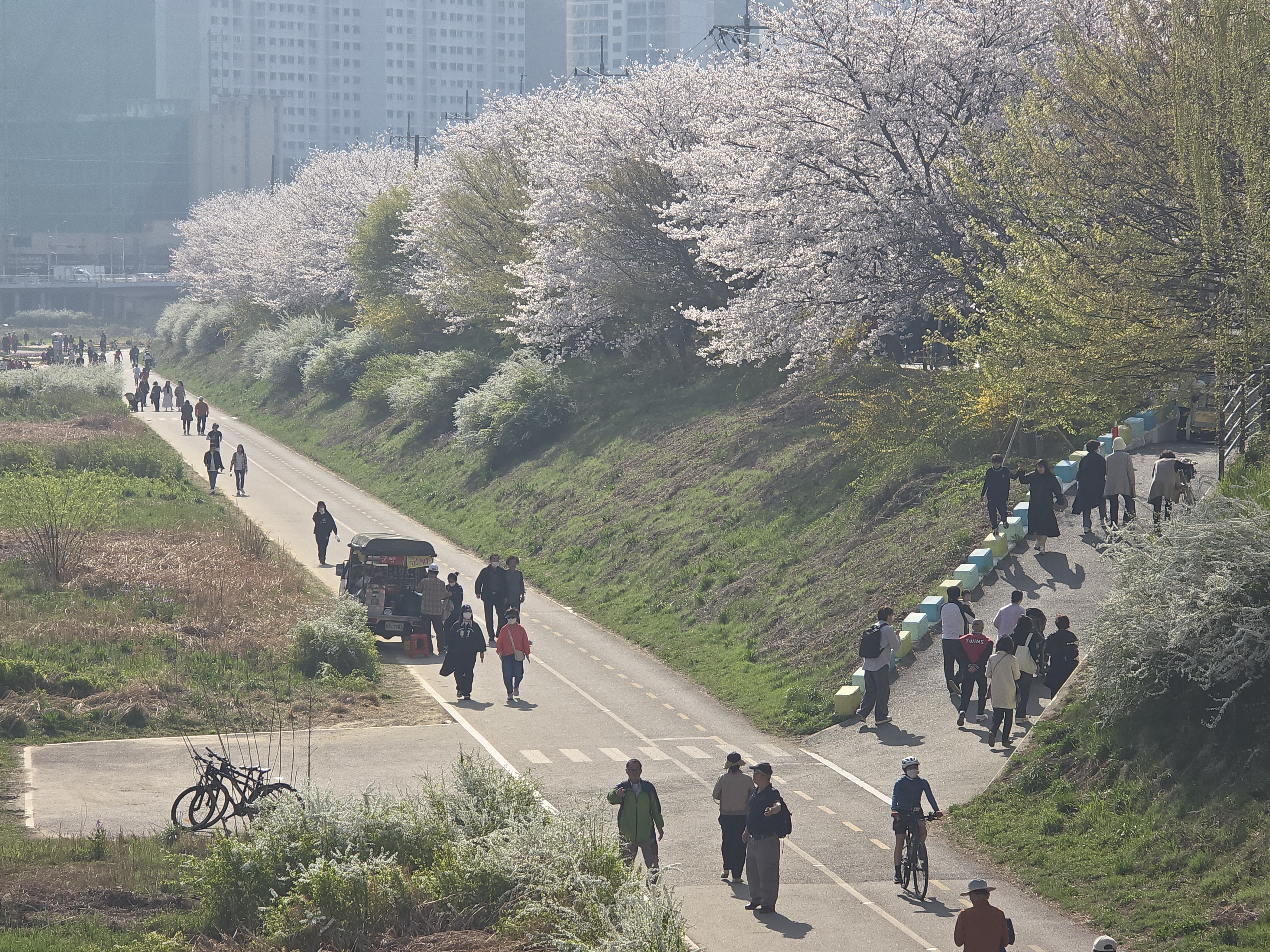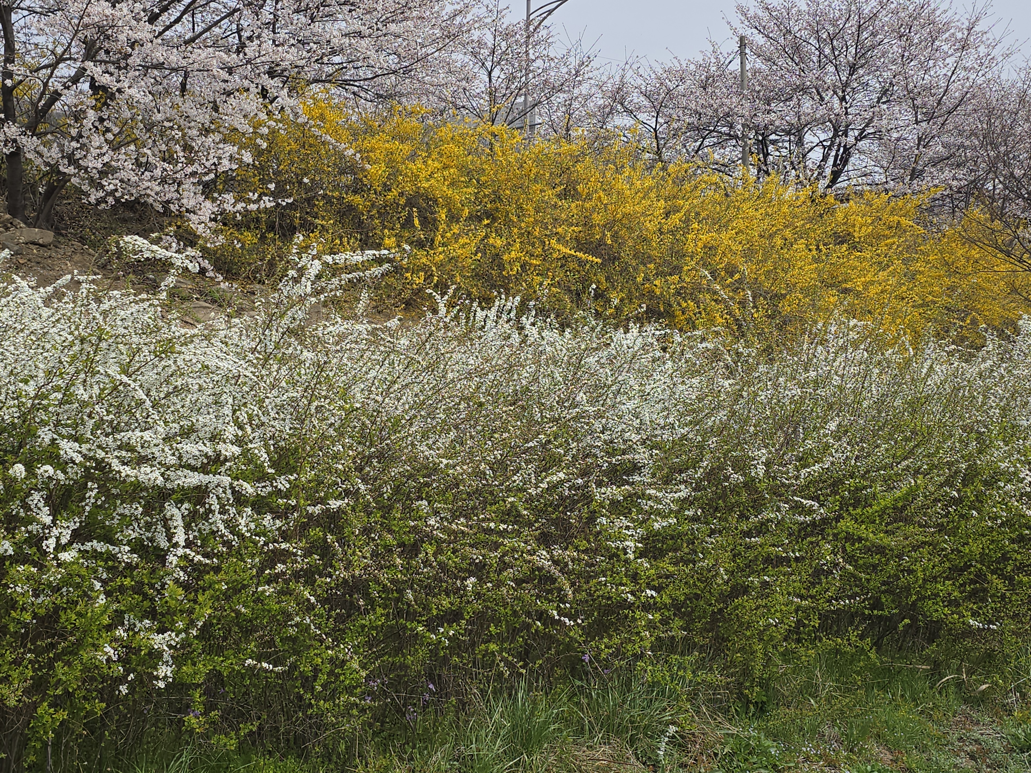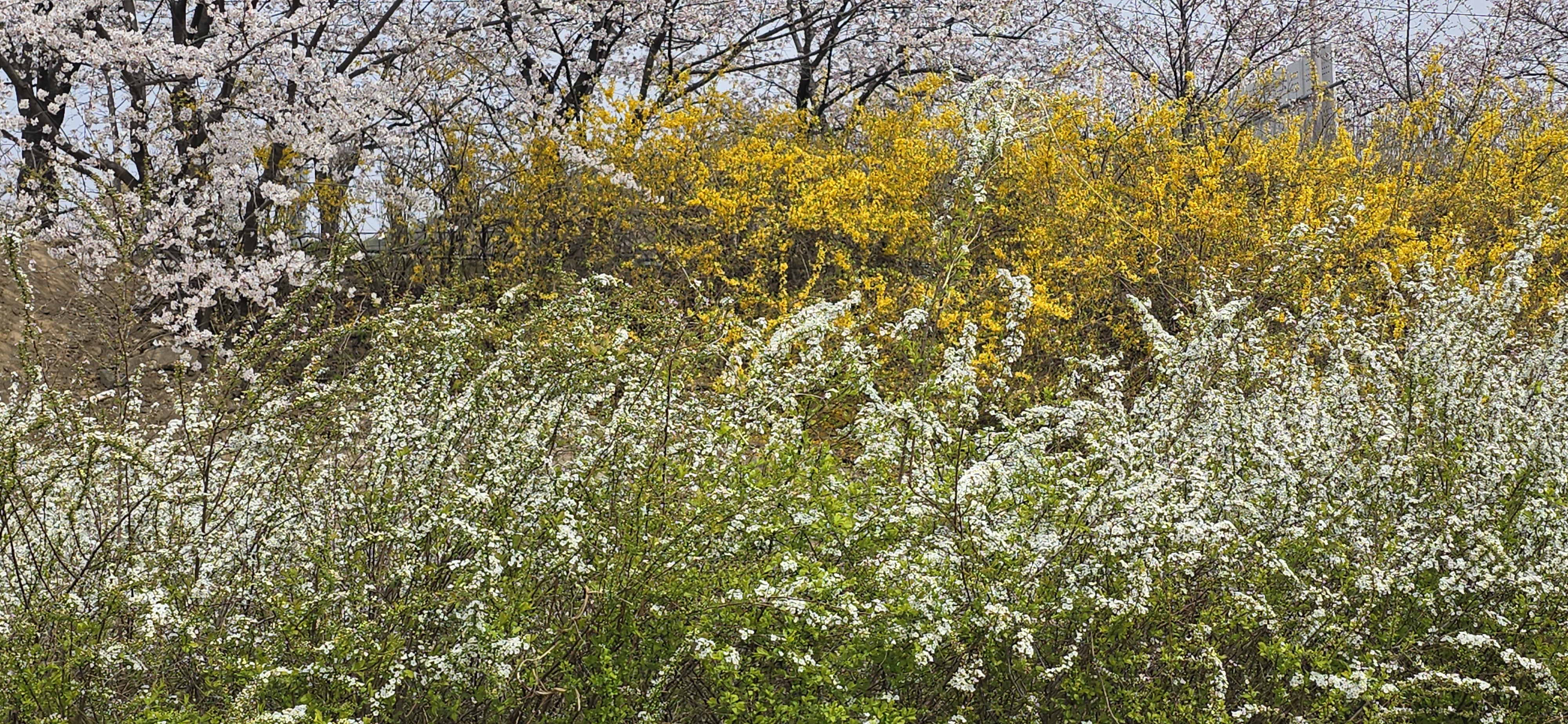 축제가 끝나고 이틀이 지나니 꽃이 만개했다. 충훈벚꽃길 특징은 하얀 벚꽃과 조팝나무꽃 그리고 노란 개나리꽃이 어우러져 핀다는 것이다. 특히 금년에는 안양천 시민정원 조성 사업이 시작되면서 천변에 다양한 꽃들로 화려한 정원을 만들엇다.