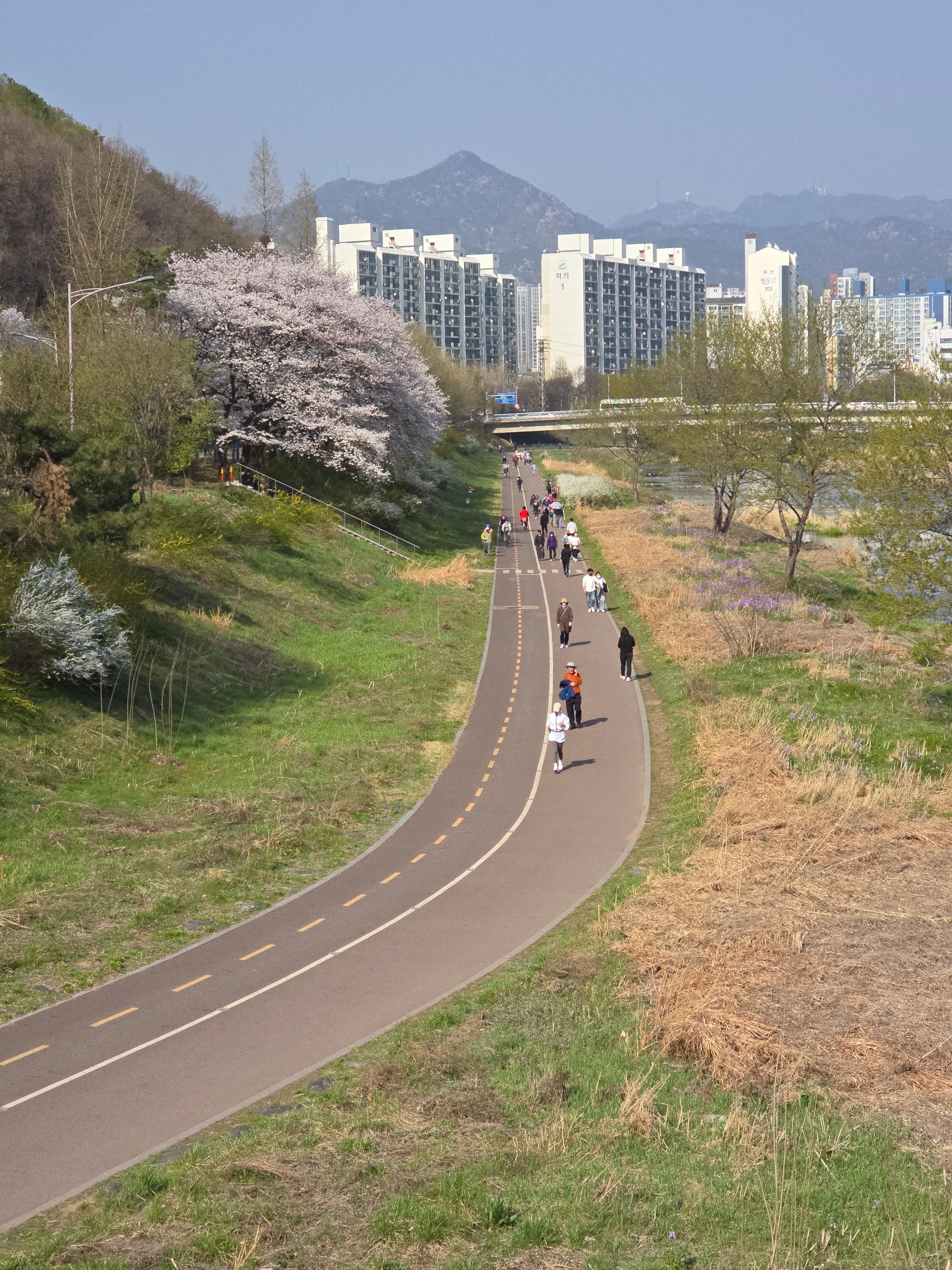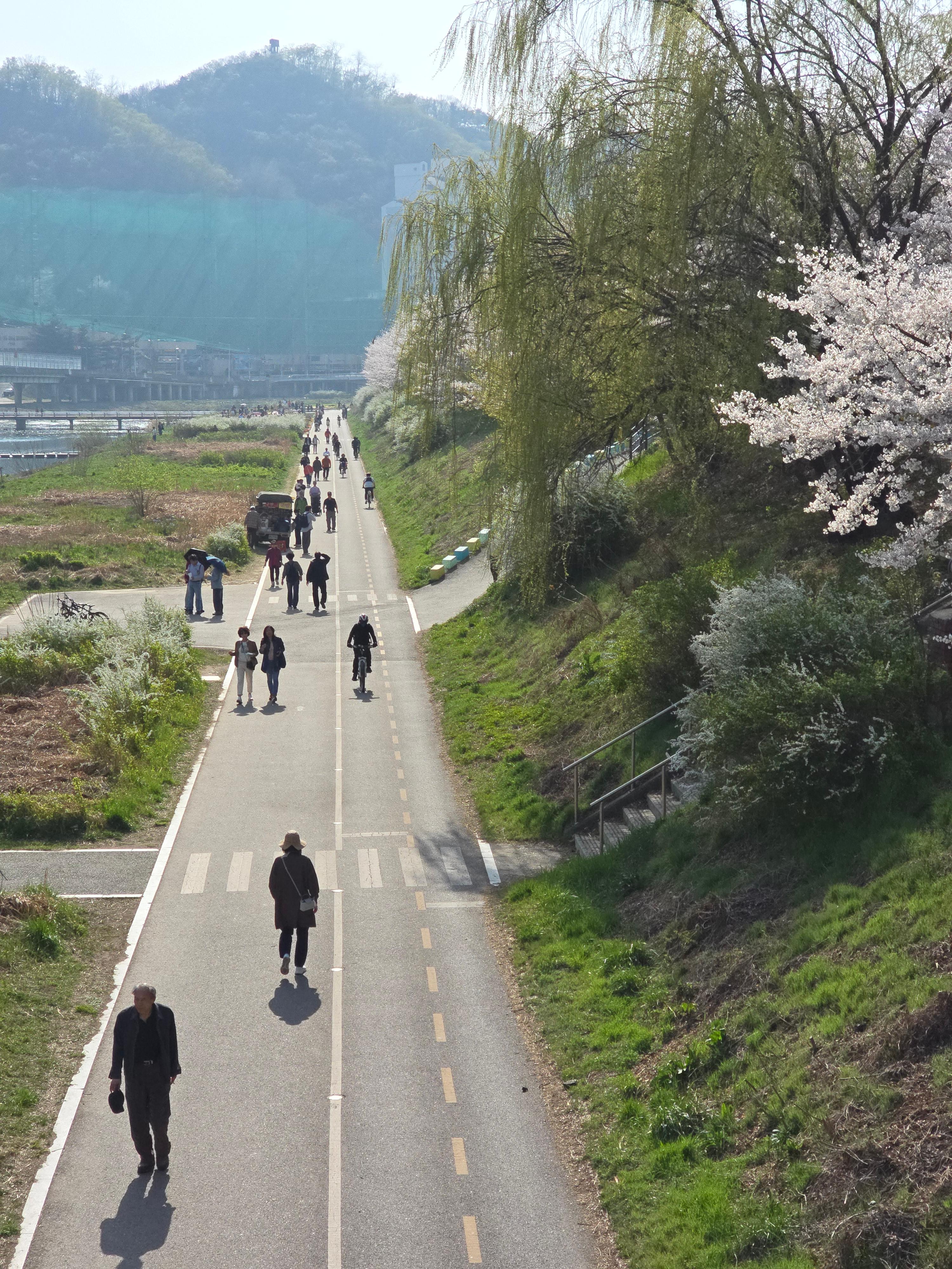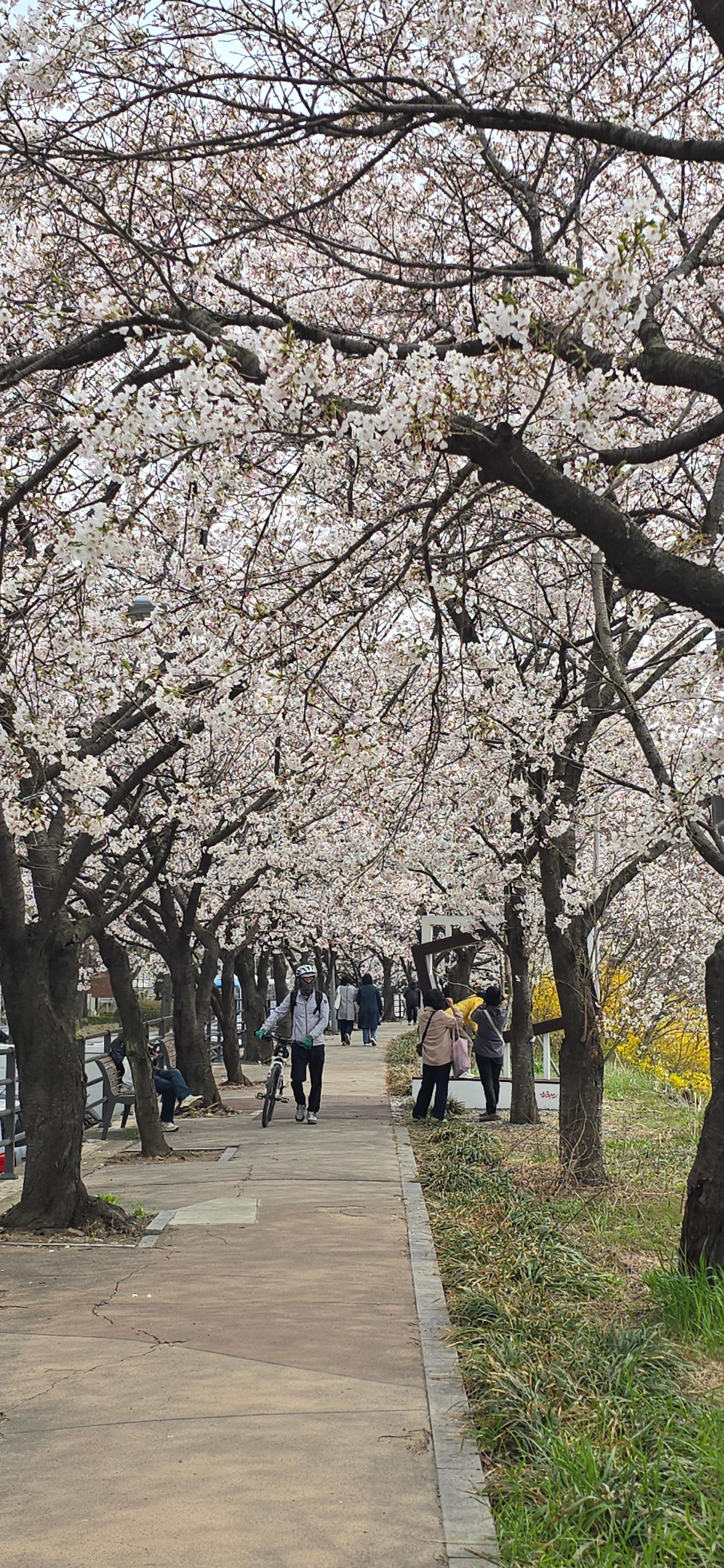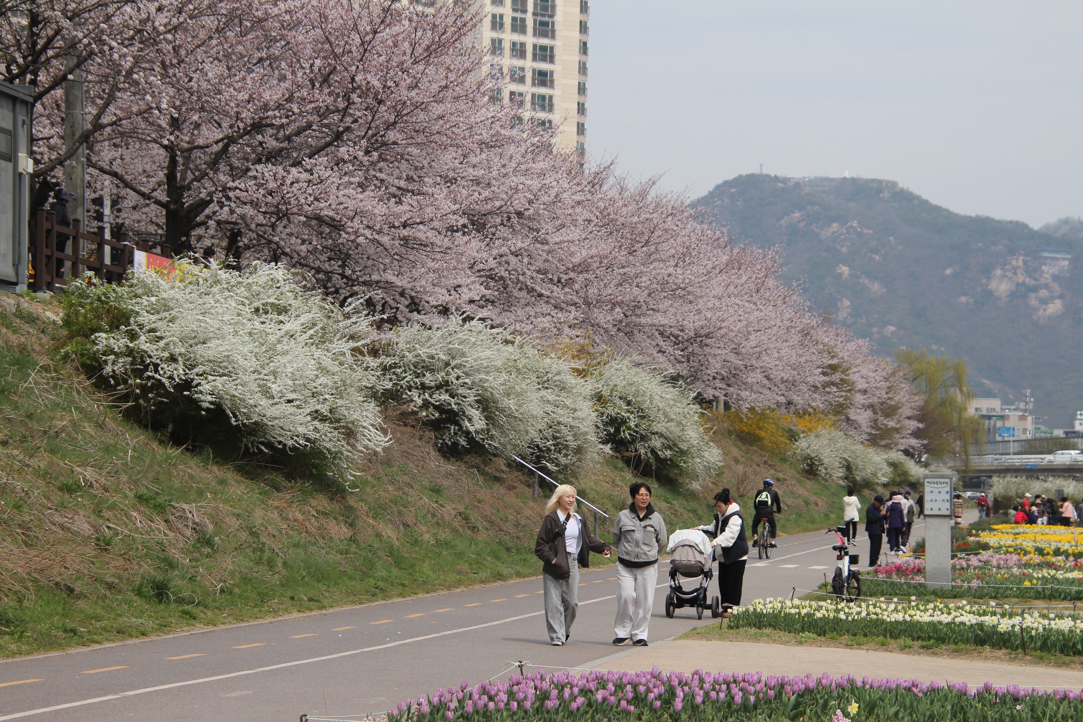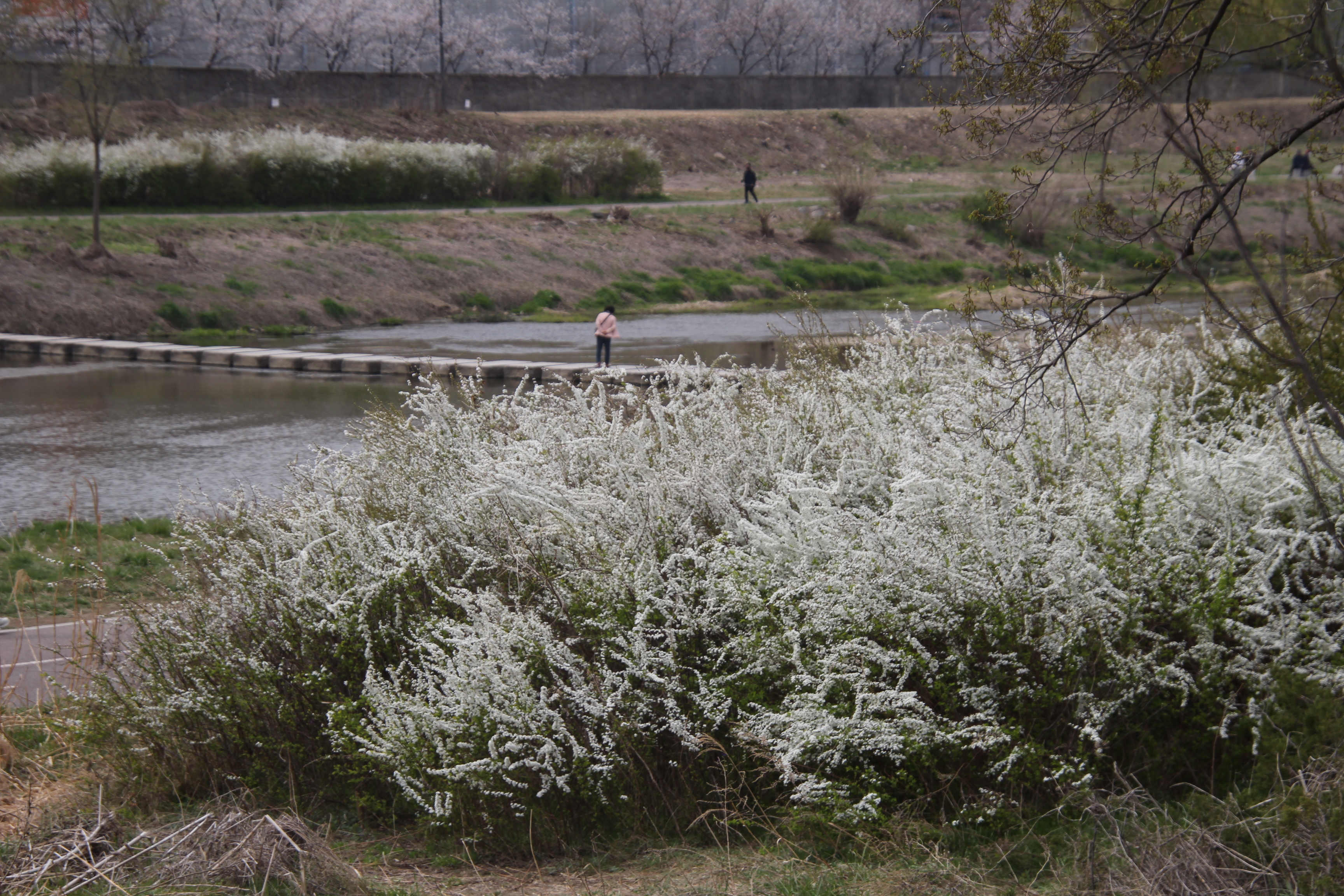 축제가 끝나고 이틀이 지나니 꽃이 만개했다. 충훈벚꽃길 특징은 하얀 벚꽃과 조팝나무꽃 그리고 노란 개나리꽃이 어우러져 핀다는 것이다. 특히 금년에는 안양천 시민정원 조성 사업이 시작되면서 천변에 다양한 꽃들로 화려한 정원을 만들엇다.