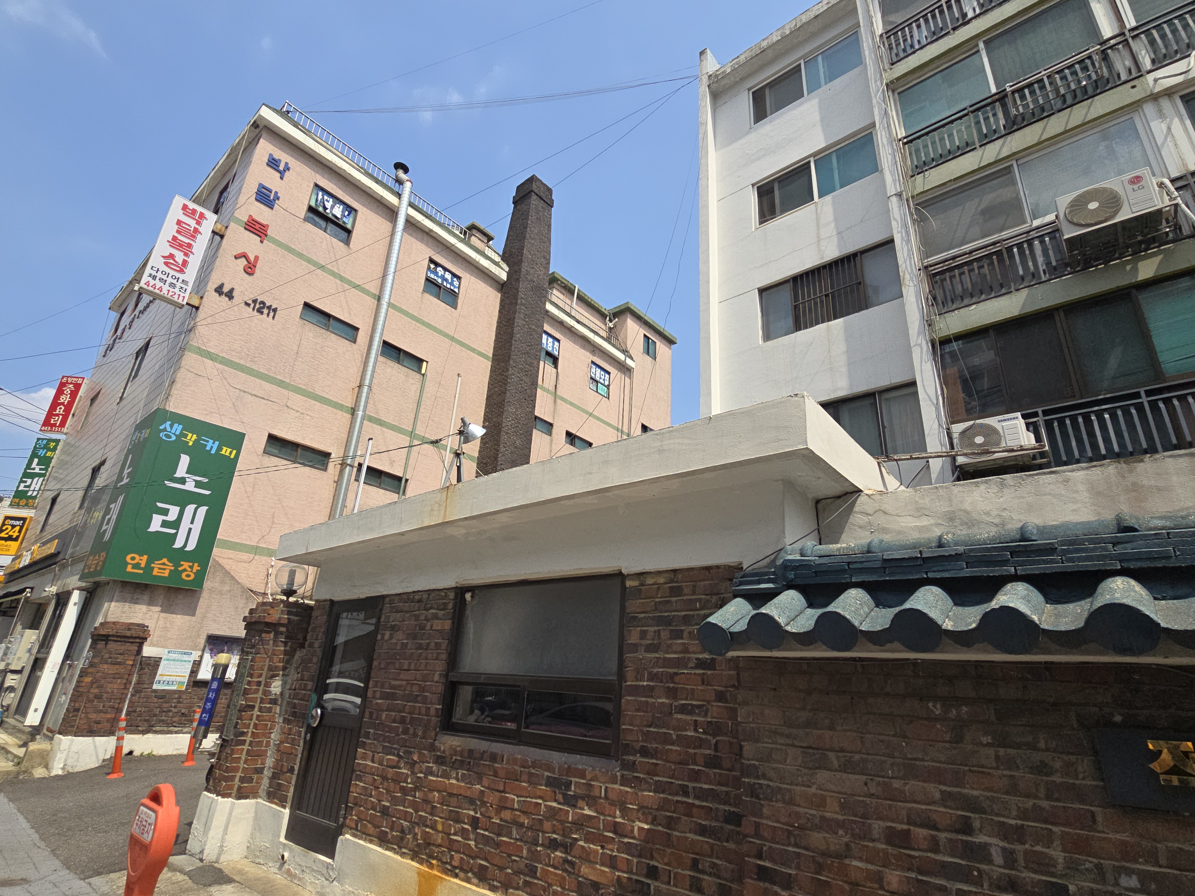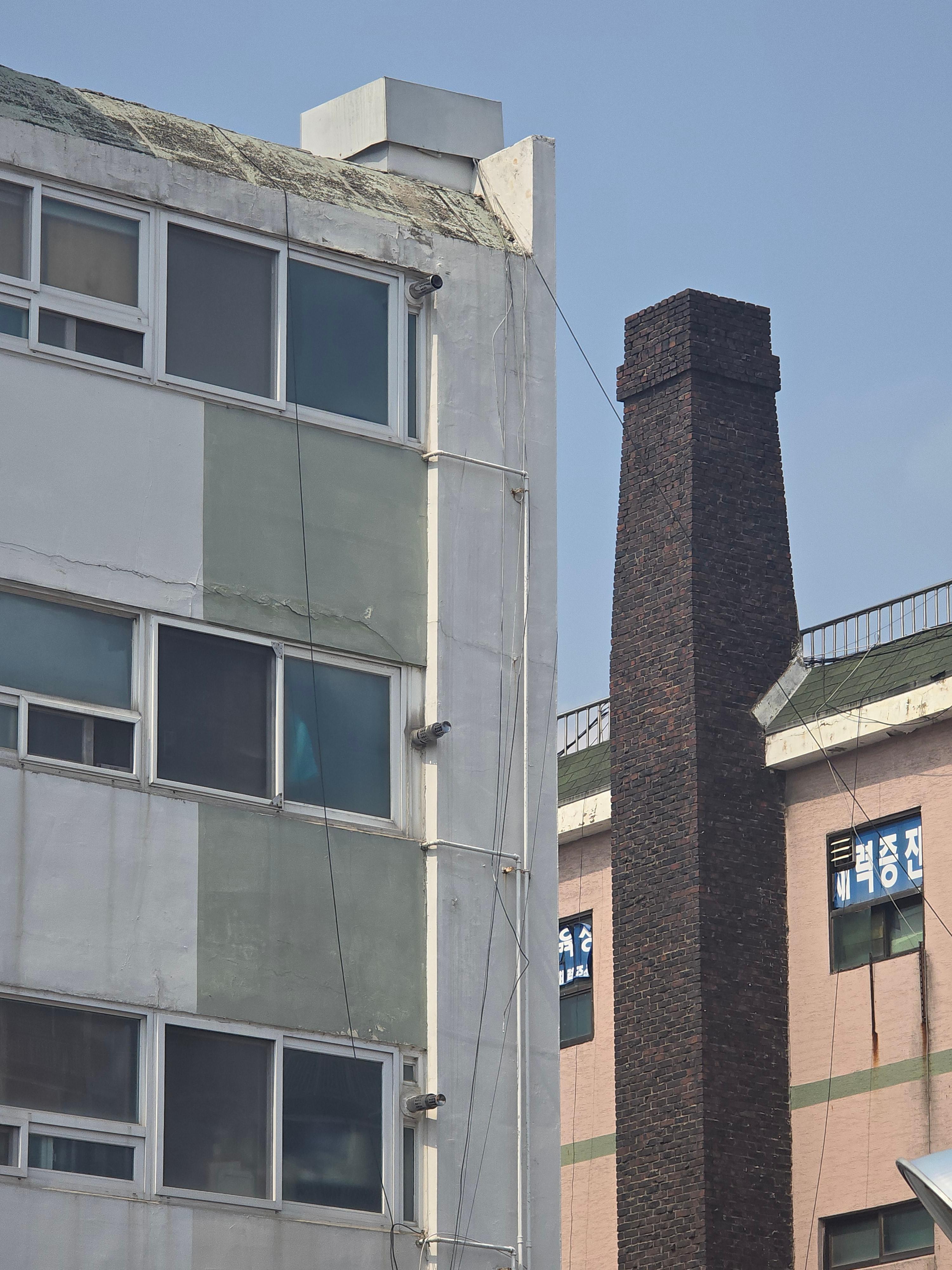 2025.04.10/ #도시기록 #동네목욕탕 #굴뚝/ 안양 박달1동에 갔다가 골목길에 자리한 적성 5차아파트 상가 옥상위로 보이는 굴뚝. 목욕탕 굴뚝 같아 동네 주민에게 물어보니 이 건물 2-3층에 적성목욕탕이 있었으며 지하에는 보일러실이 있었다고 한다.