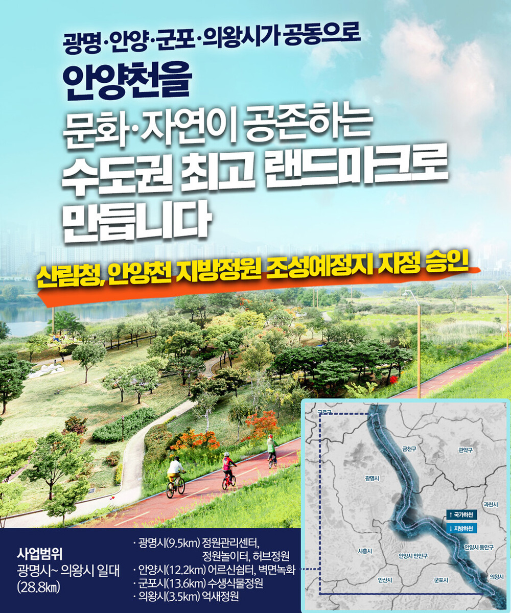 앞서 지난 2024년 안양・군포・의왕・광명 등 경기권 4개 지자체는 안양천 국가 정원 지정 추진사업을 위한 공청회 개최와 함께 5월에는 안양・ 의왕・군포・광명(경기권)과 금천・구로・양천・영등포(서울권) 등 총 8개 지자체가 안양천을 국가정원으로 만들기 위한 ‘안양천 명소화·고도화 협약’을 맺고, '안양천 국가 정원 지정 지방정부 협의회'를 출범시킨 바 있다.