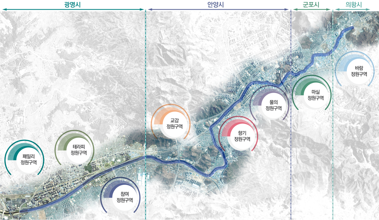 지방정원 조성예정지 주요 계획에 따르면, 사업면적은 39만7000㎡, 연장은 28.8km에 이른다. 4개 도시를 연결하는 기본구상을 토대로 △광명시(9.5km) 정원관리센터-정원놀이터-허브정원 △안양시(12.2km) 어르신쉼터-벽면녹화 △군포시(13.6km) 수생식물정원 △의왕시(3.5km) 억새정원 등이 조성될 예정이다.