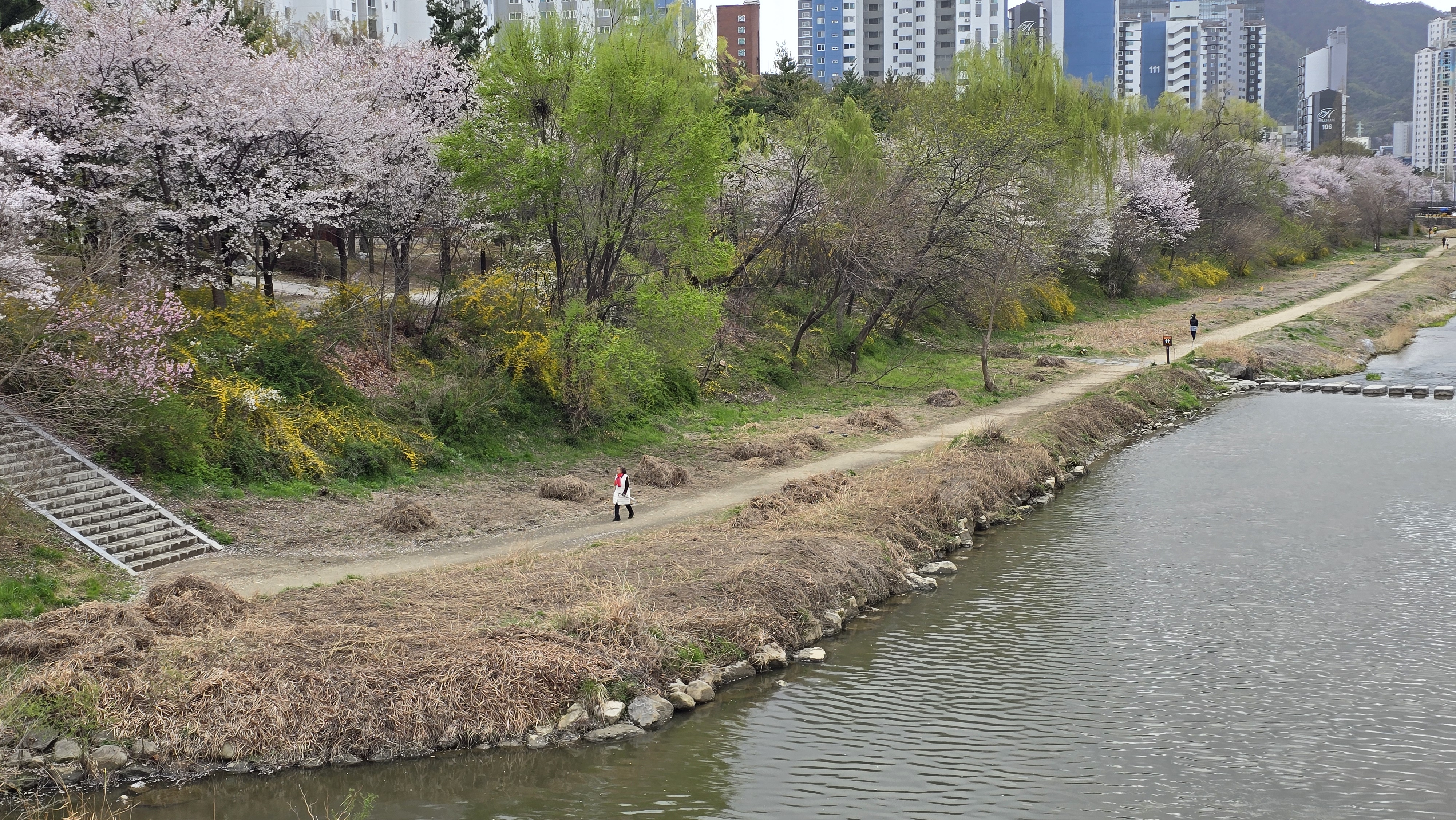 이곳 학운교 다리옆 산책로에는 짙은 핑크빛으로 시선을 사로잡는 벚꽃나무가 있어 사진 찍는 명소로 입소문 난 스팟이 있다.