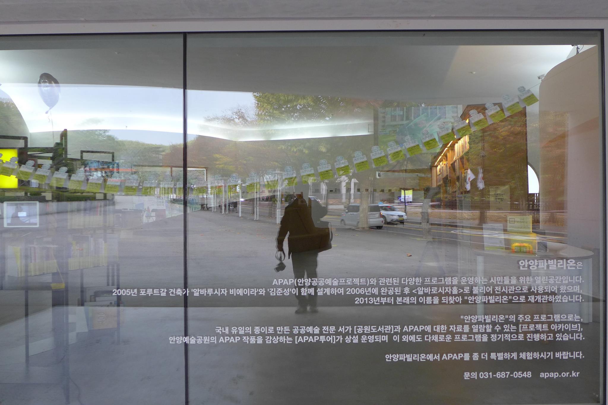 참고 안양파빌리온 소개: 안양공공예술프로젝트 홈페이지(www.apap.or.kr) l APAP 투어 이용안내 수~일: 오전 10시~ 오후 6시 목: 오전 10시~ 오후 9시 (월요일, 화요일 휴무/ 1월 1일, 구정 및 추석 당일 휴무) l 안양파빌리온에는 별도 입장료가 없다.