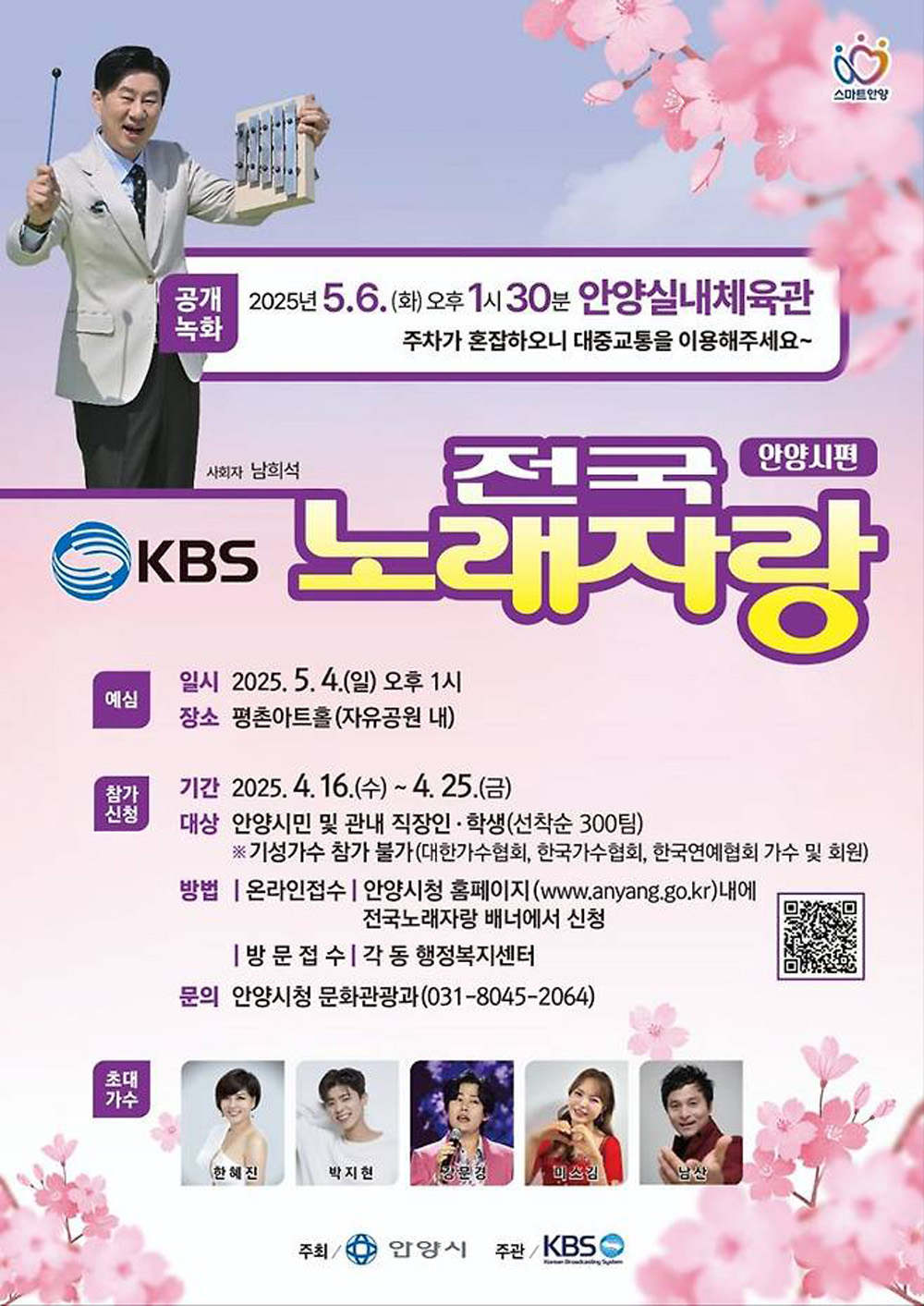 최장수 오락 프로그램인 'KBS 전국노래자랑' 안양시편 공개녹화가 오는 5월 6일 오후 1시 30분 안양실내체육관에서 열린다.