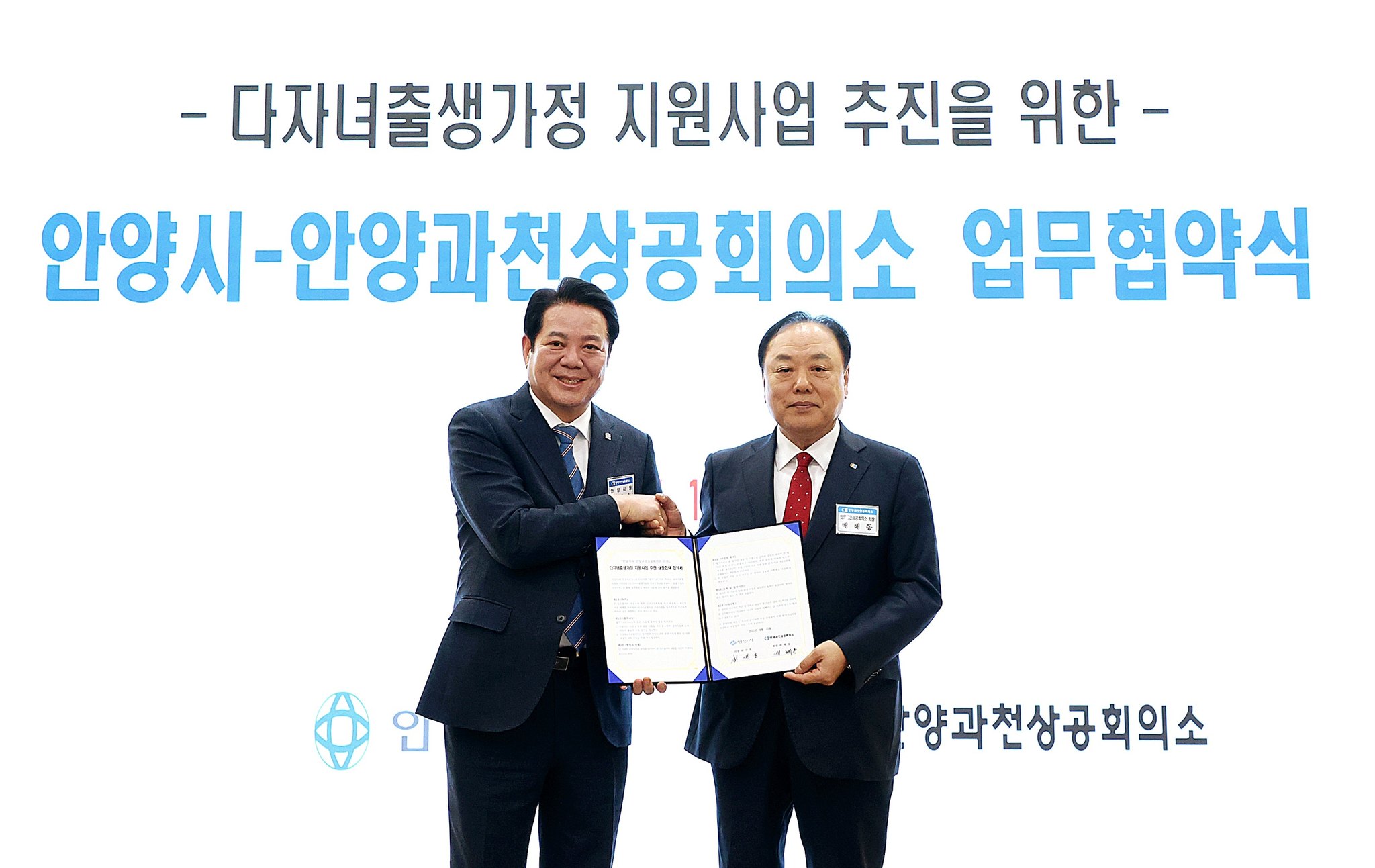 안양시와 안양과천상공회의소는 15일 안양과천상공회의소 강당에서 최대호 안양시장, 배해동 안양과천상공회의소 회장을 비롯한 관내 기업체 대표 등이 참석한 가운데 관내 세쌍둥이 및 다섯째아 이상 출생 가정을 지원하기 위한 '다자녀 출생가정 지원사업 추진 상호협력 업무협약'을 15일 체결했다.