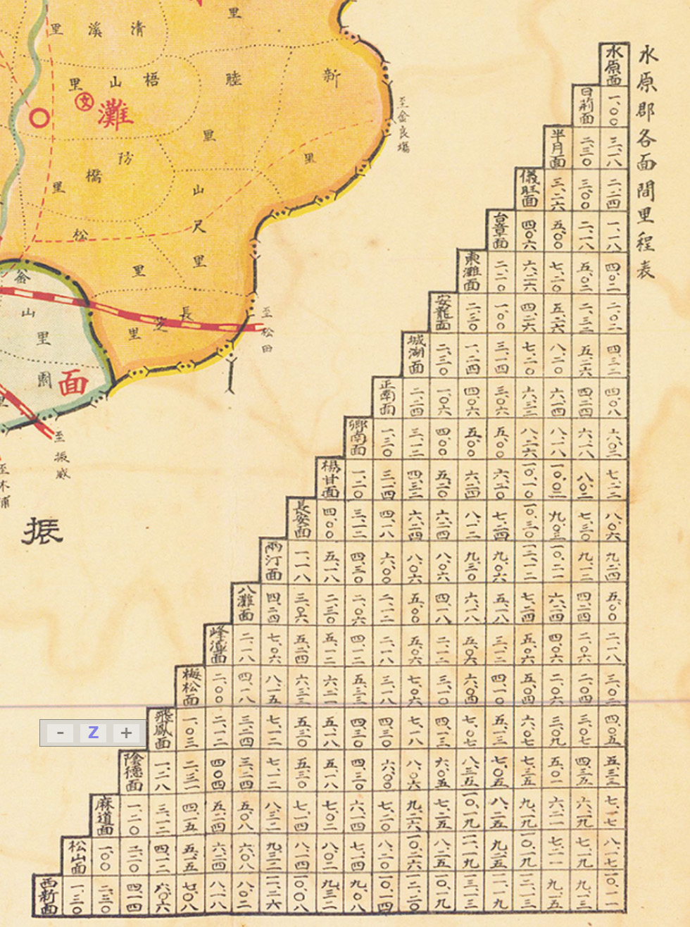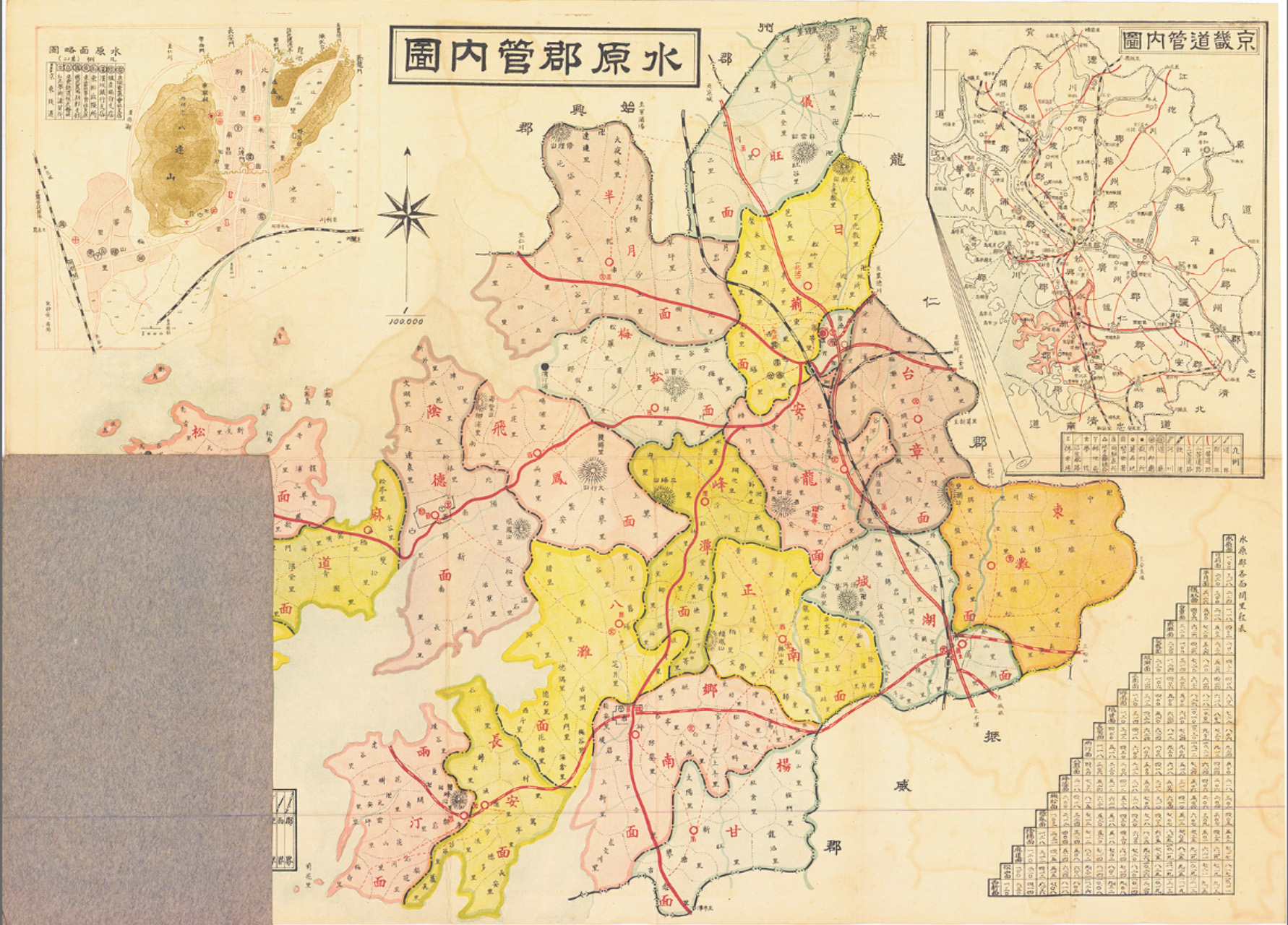 수원군 관내도상 예하 면단위 구분 지도로 주요 관공서 및 기관들을 표기하고 주요지간 이정거리도표가 있으며 수원군의 연혁 교통 사회 산업 상업 현황과 주요 관공서 현황이 있다