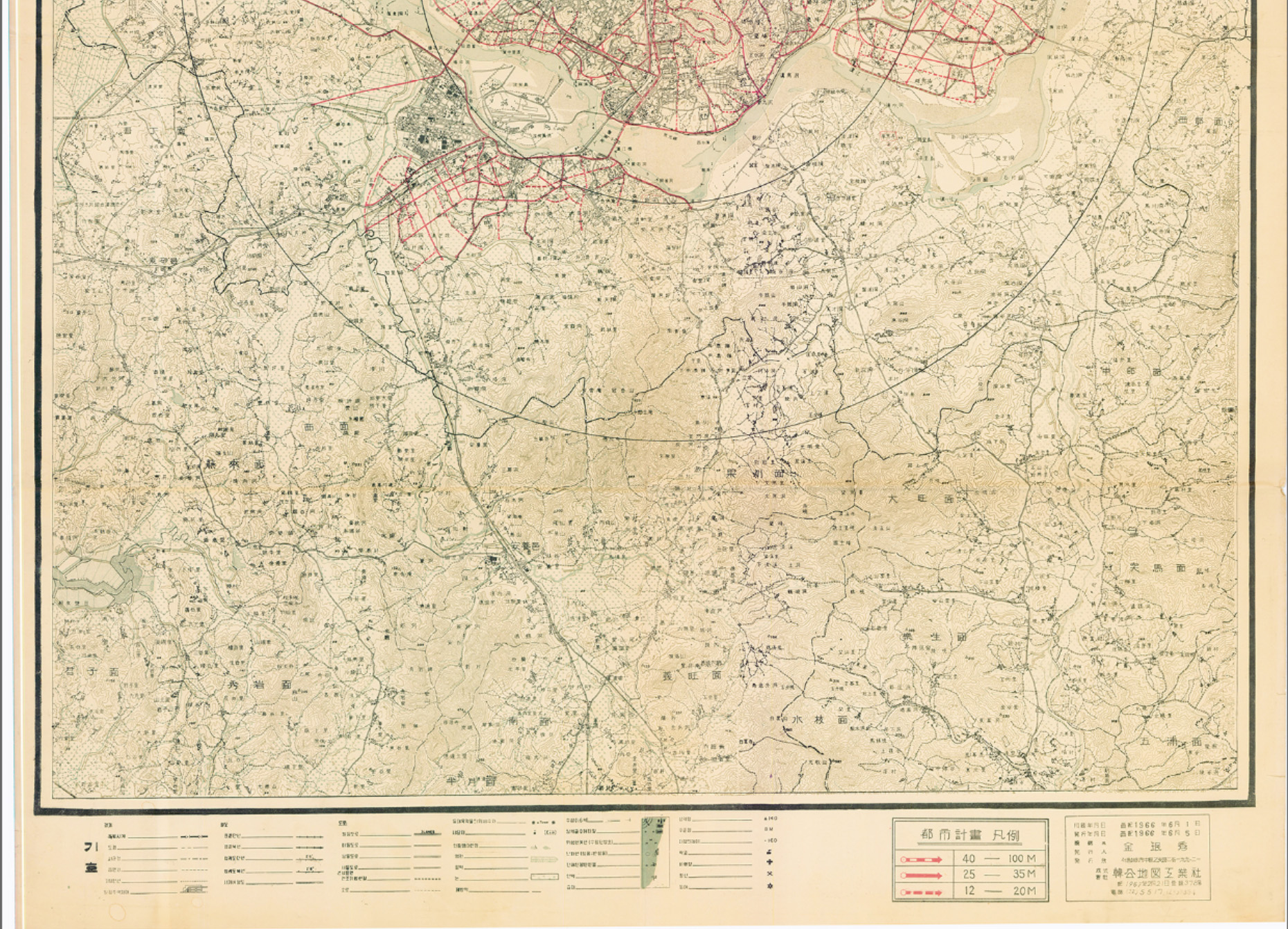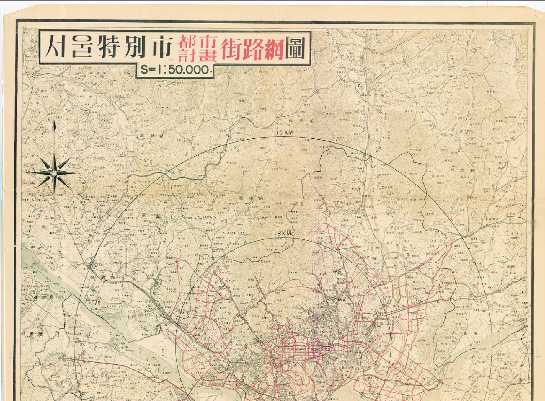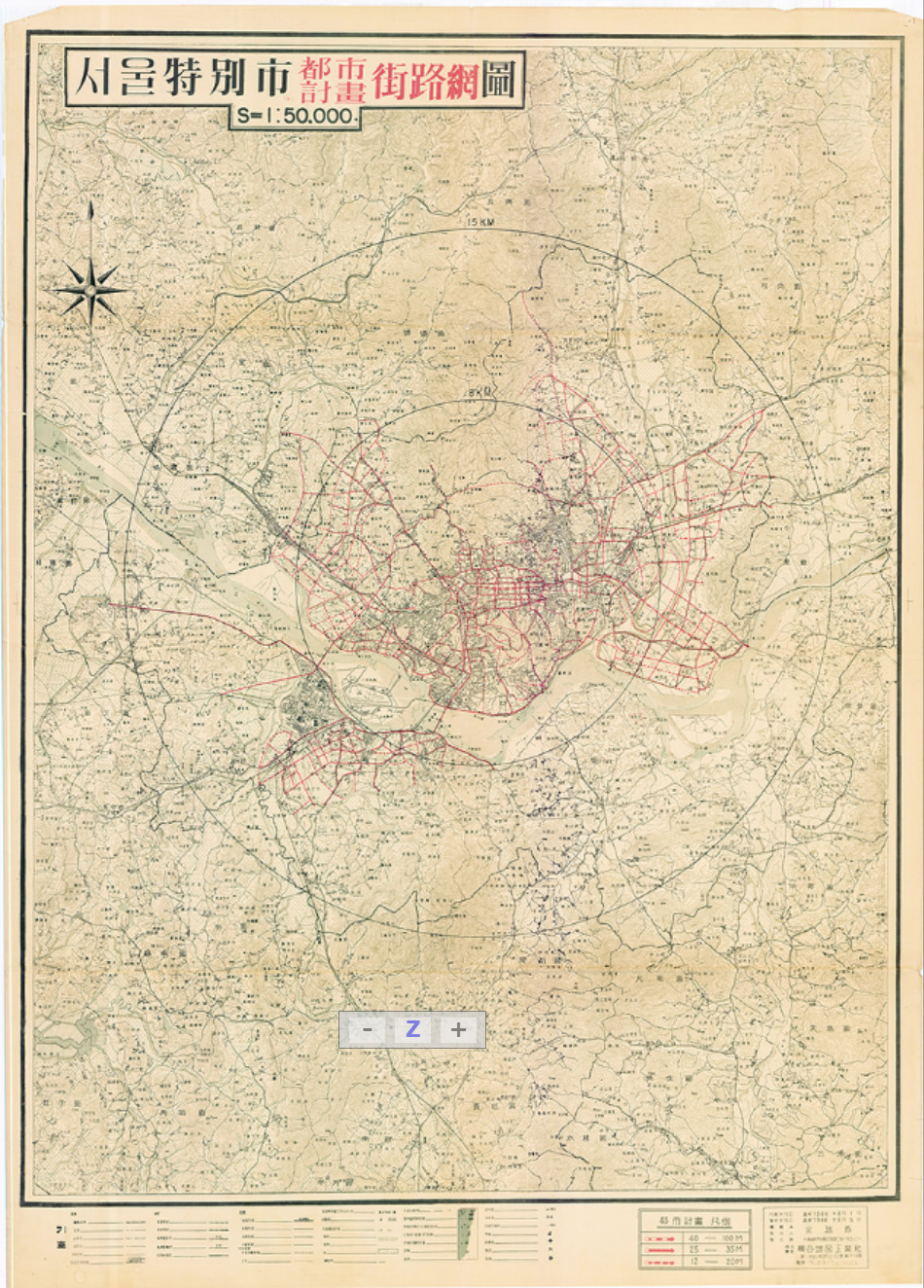 1966년 6월 5일 한국지도공업사에서 발행한 서울특별시도시계획행정망도는 1:50.000만 지도로 서울중심부로 부터 8키로,15키로 반경내 행정망 계획도를 나타내고 있으며 시 도 읍간 경계, 철도, 도로와 지형현화에 대한 참고 범례를 표기하고 있다.