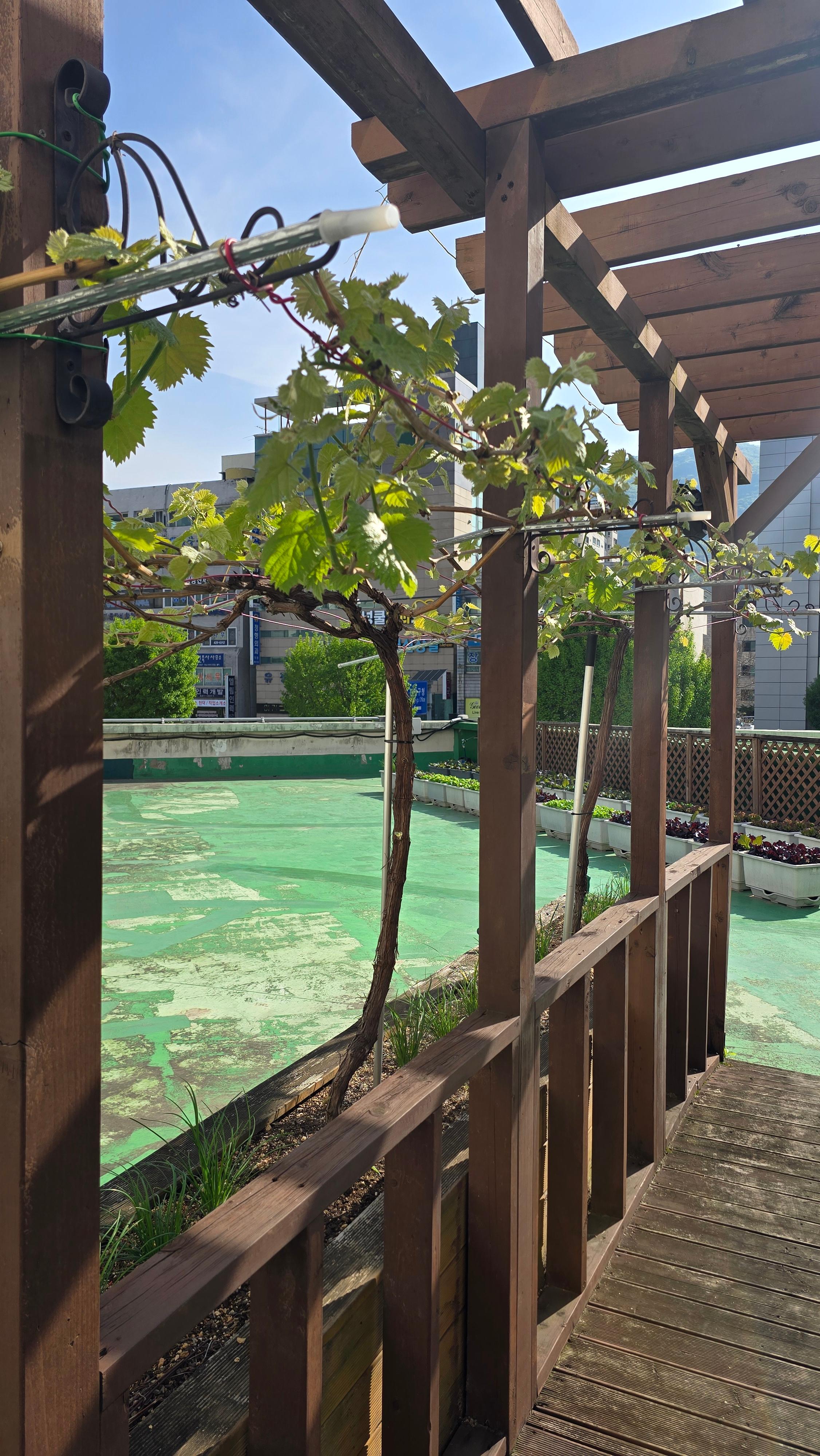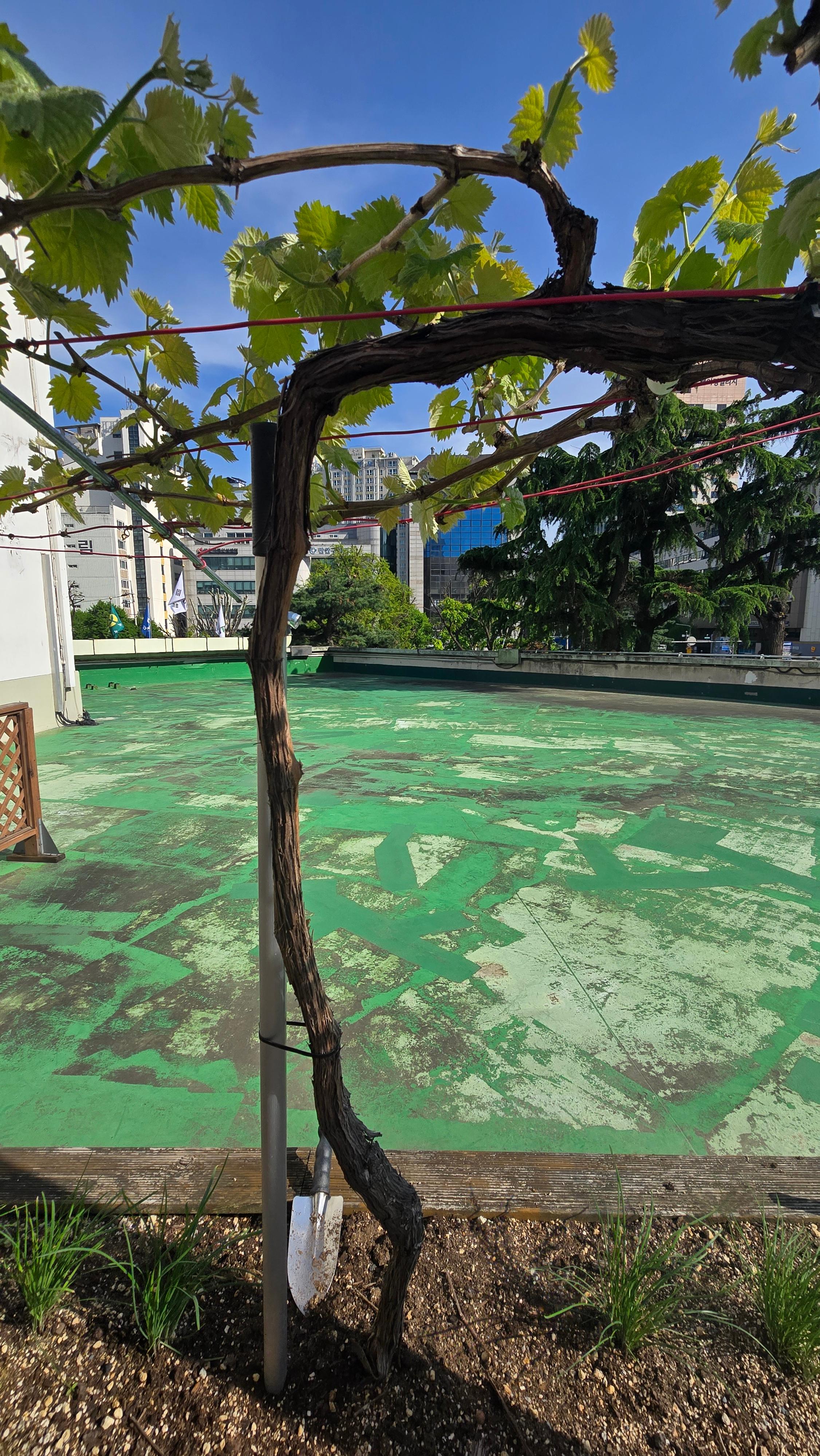 2025.04.24/ #도시기록 #안양포도/ 만안구청 2층 베란다 텃밭에 심어진 포도 묘목 4그루중 3그루가 잘 자란다. 포도농가 대부분이 없어진 안양포도는 사실상 소멸됐으나 이렇게 흔적만 이어지고 있다.