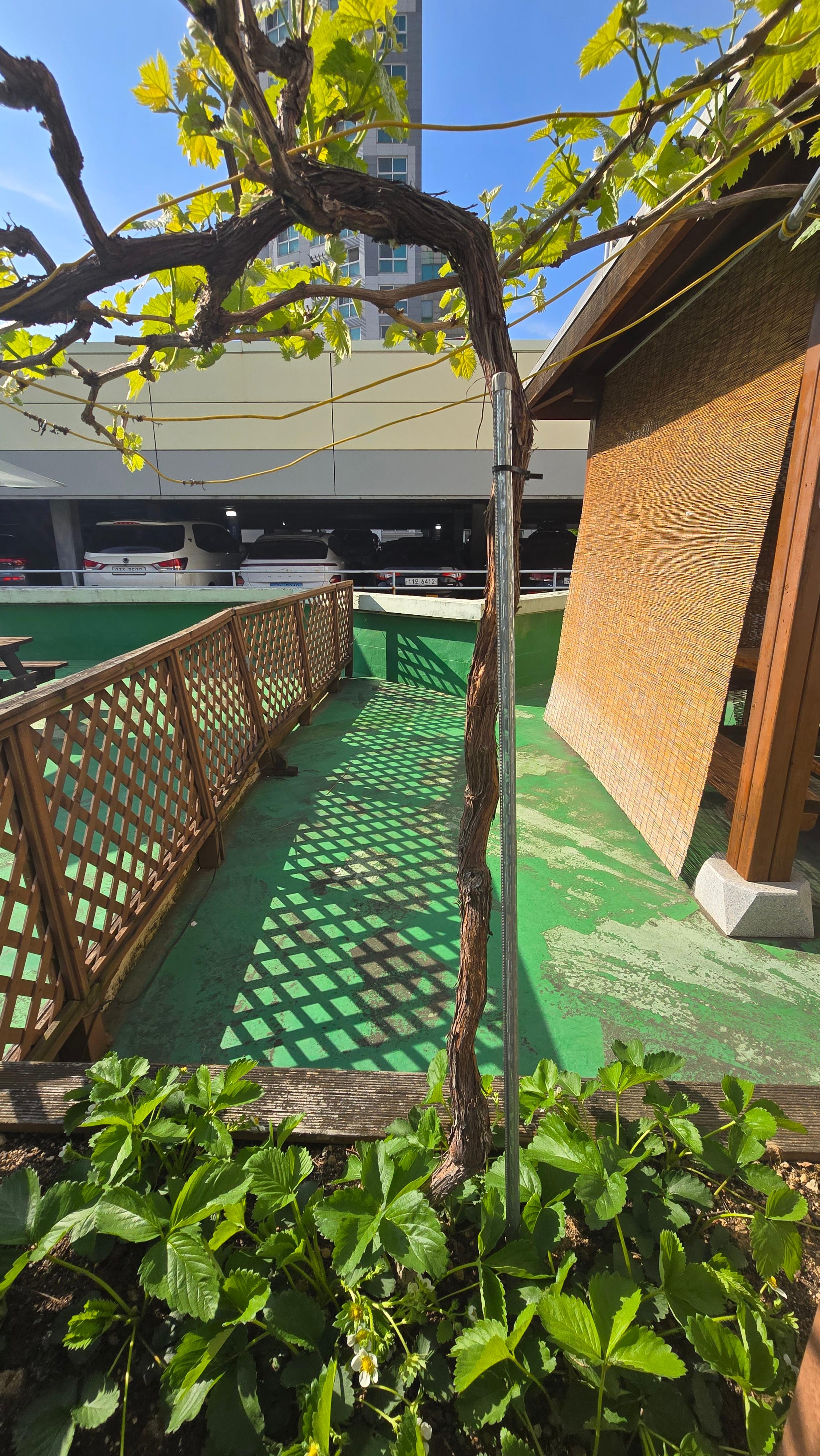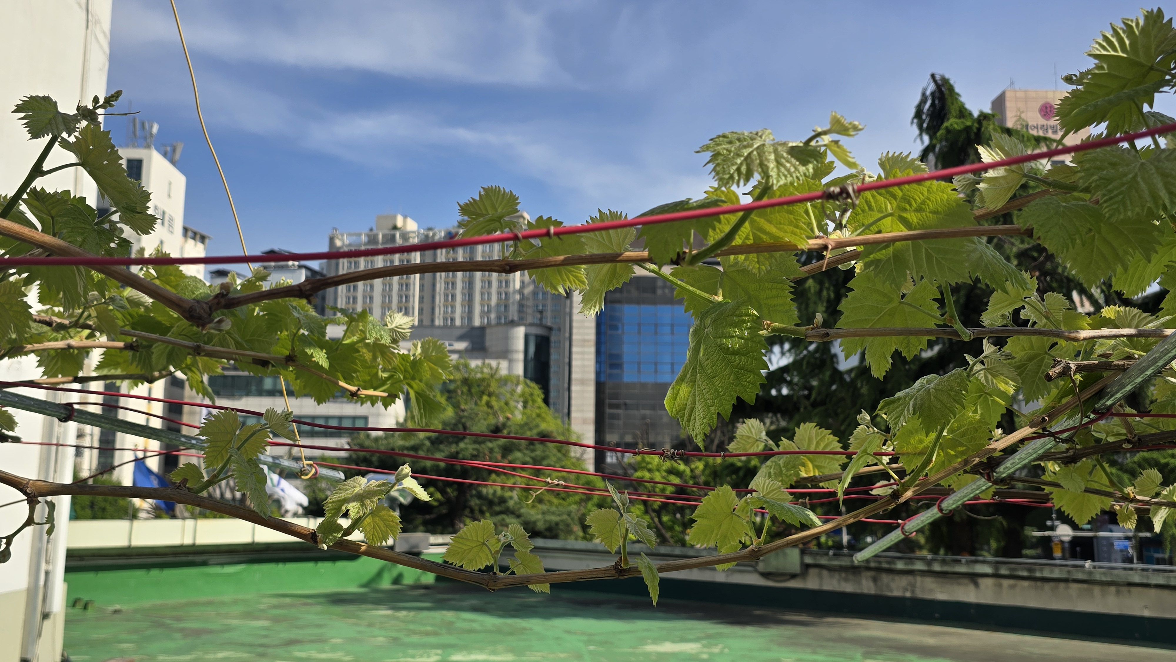 2025.04.24/ #도시기록 #안양포도/ 만안구청 2층 베란다 텃밭에 심어진 포도 묘목 4그루중 3그루가 잘 자란다. 포도농가 대부분이 없어진 안양포도는 사실상 소멸됐으나 이렇게 흔적만 이어지고 있다.