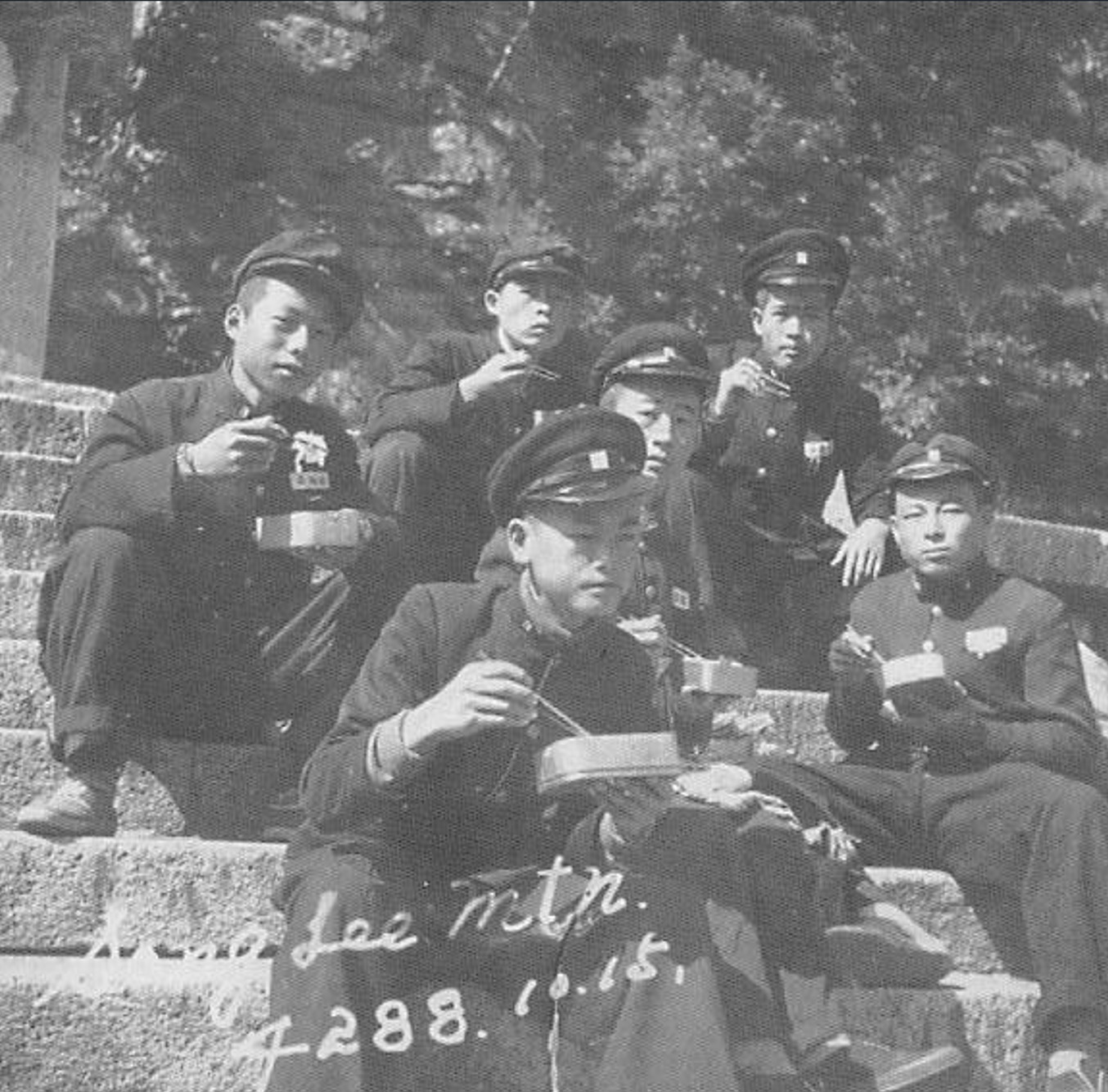 단기 4288년(1955년) 10월 15일 안양풀(현 안양예술공원)로 가을 소풍에 나섰던 안양중학교 학생들의 식사 시간인듯 노란 양은도시락 뚜껑을 열고 밥들을 먹고 있다. 평소 학교에 갈때 혼합보리밥과 반찬 한가지를 담겨 있던 양은도시락에 소풍 갈때는 어머니가 정성스럽게 만들어주신 김밥이 담겨있던 추억의 노란 양은도시락이다.