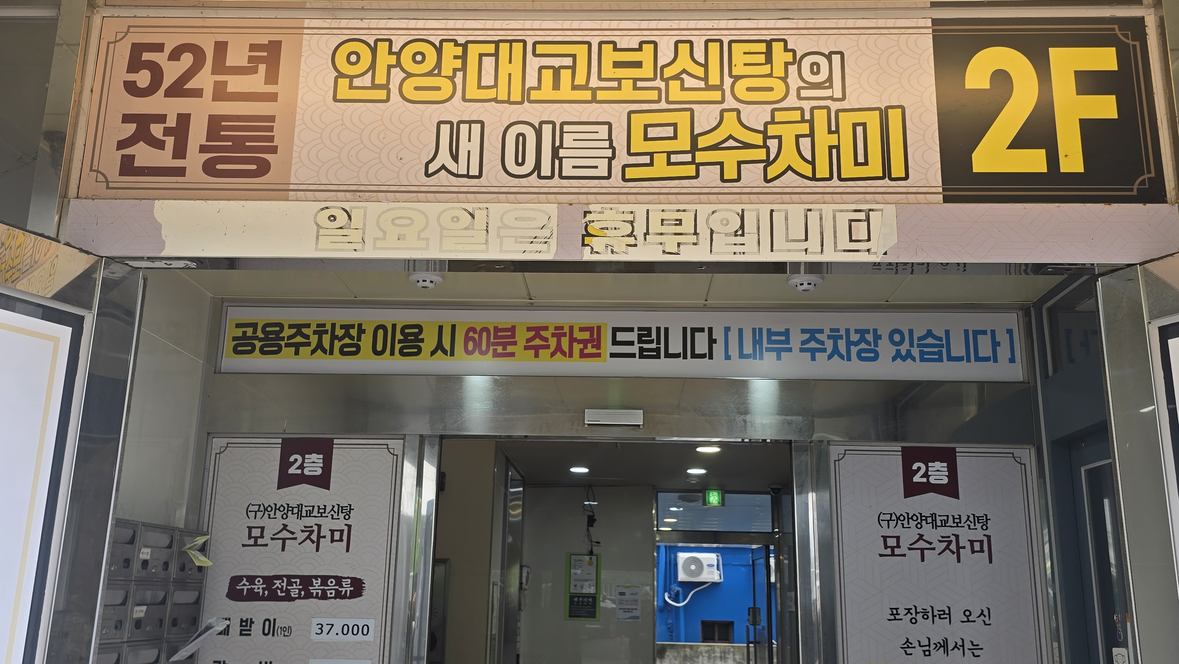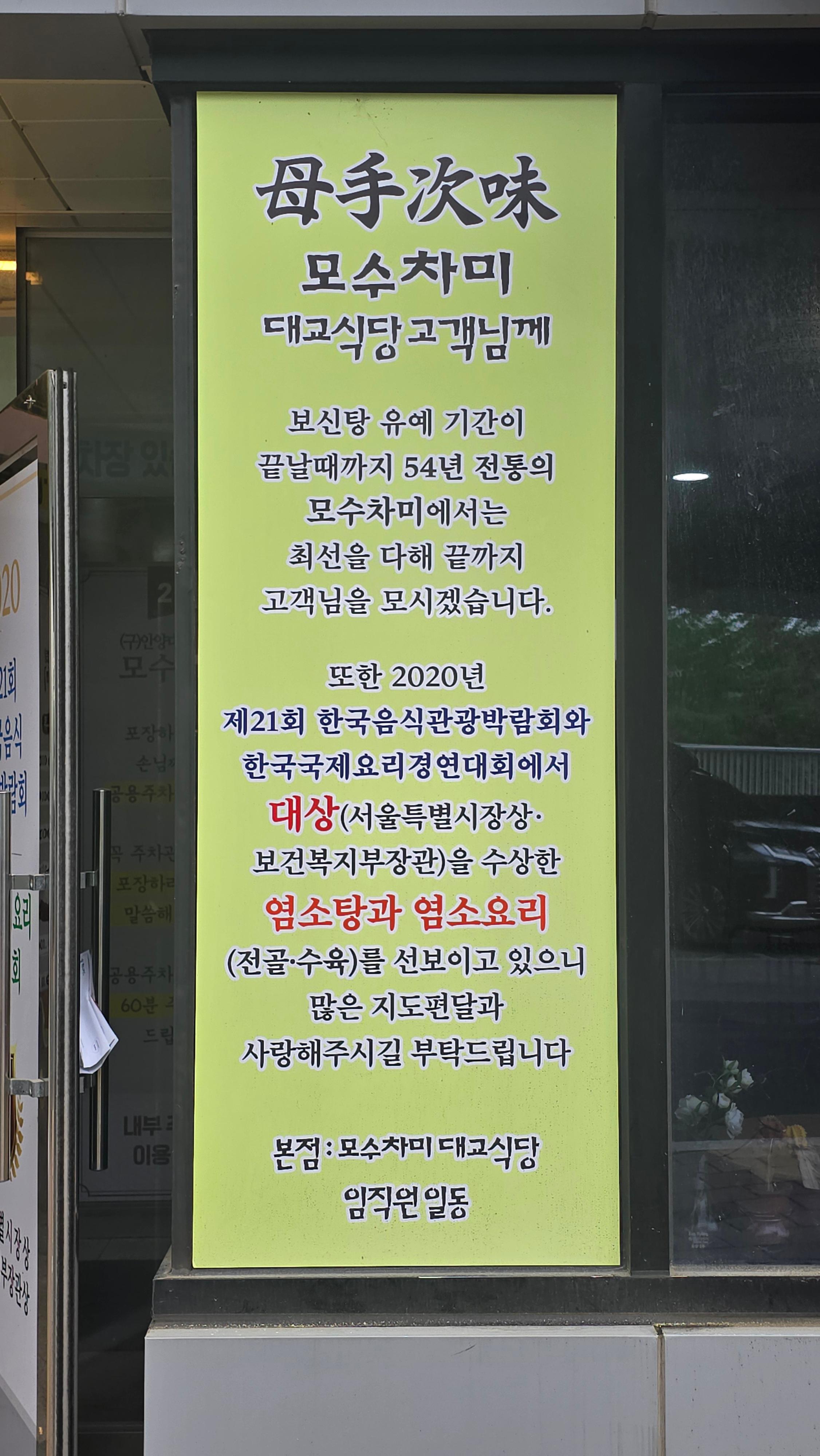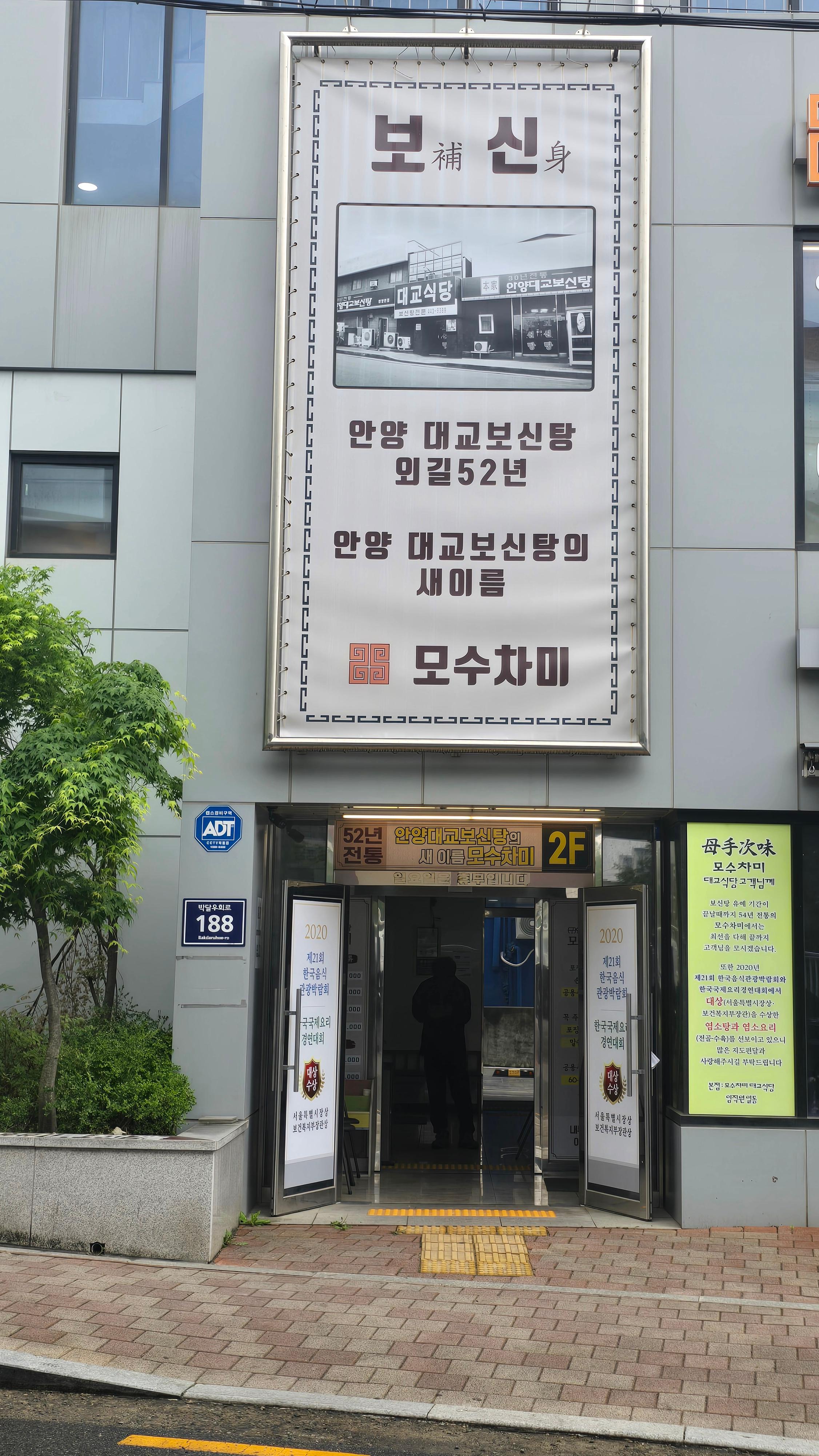 2025.05.15/ #보신 #안양 #노포 #대교보신탕 #모수차미 #since1969 / 안양에서 가장 유명한 음식점을 꼽으라면 어디를 지목할까. 안양사람뿐 아니라 타지 사람들에게도 유명한 곳이 바로 안양 대교보신탕 아닐까. 2000년 새 건물을 지으면서 모수차미로 간판을 바꿨다.1969년에 문을 열었으니 오래됐다. 우슷개 소리로 까스 폭발사고 이후 안양뿐 아니라 전국에서 대교보신탕 모르면 간첩이라 할 정도가 됐다.