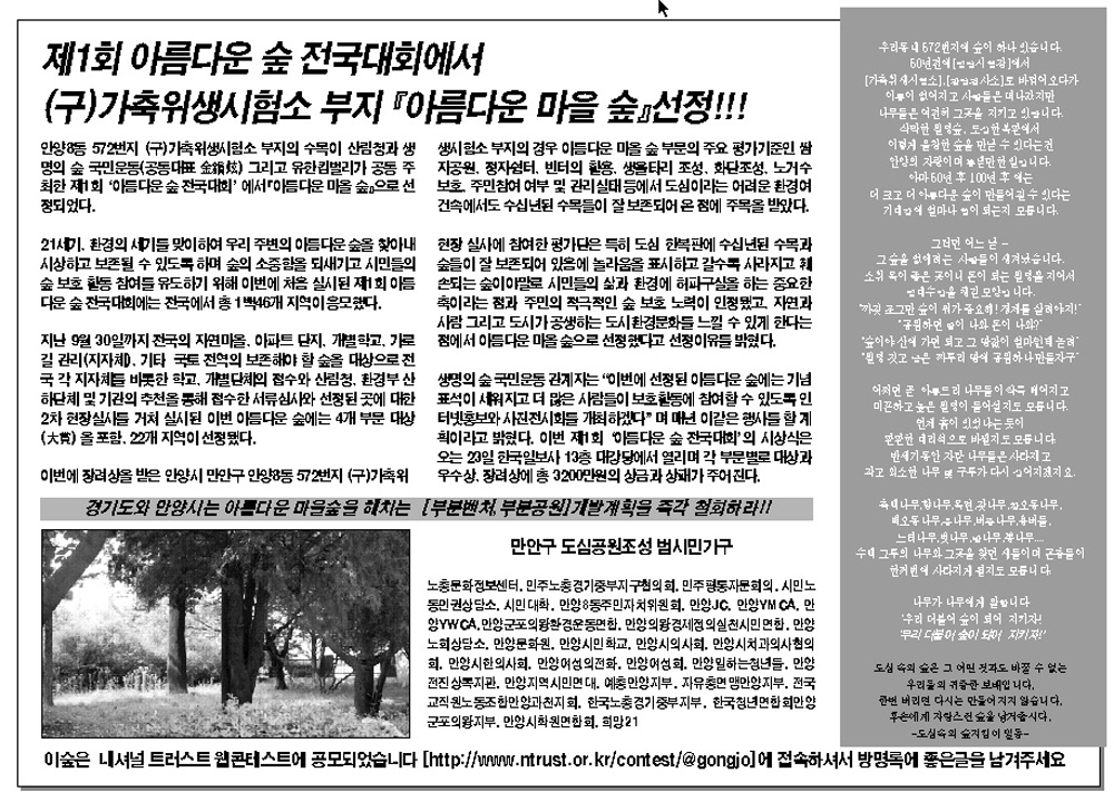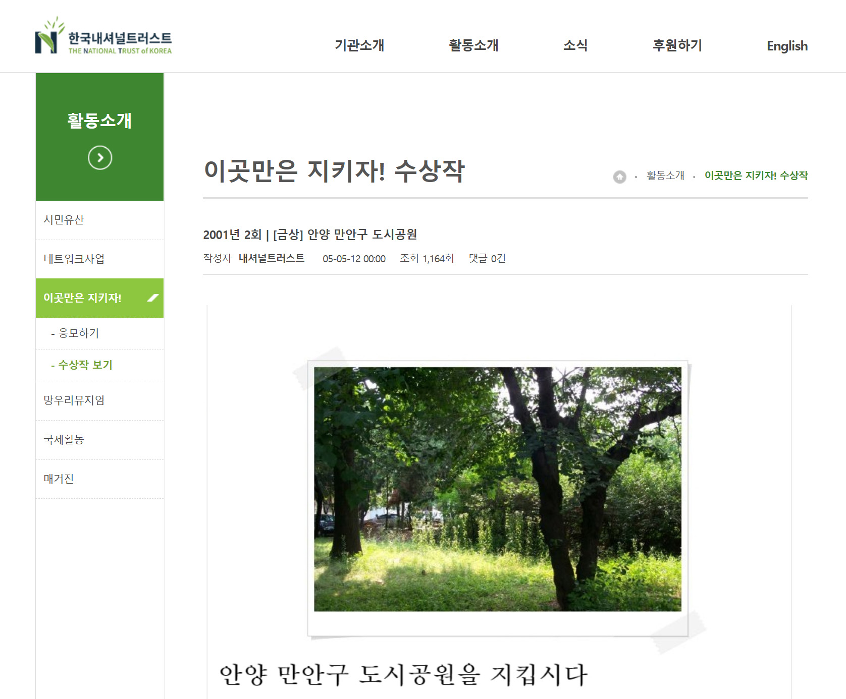 2025.05.15/ #아카이브 #자료 #기록 #since2001/ 한국내셔널트러스트가 주최한 제2회 "이곳만은 지키자" 대회에서 <안양 만안구 도시공원을 지킵시다>로 금상(환경부장관상)을 수상했던 안양8동 (구) 경기도 가축위생시험소 부지(현 명학공원)에 대한 수상 자료를 인터넷(한국내셔널트러스트 홈페이지)에서 발견하면서 외장하드에서 엣 기록과 자료들을 꺼내 정리해 본다.