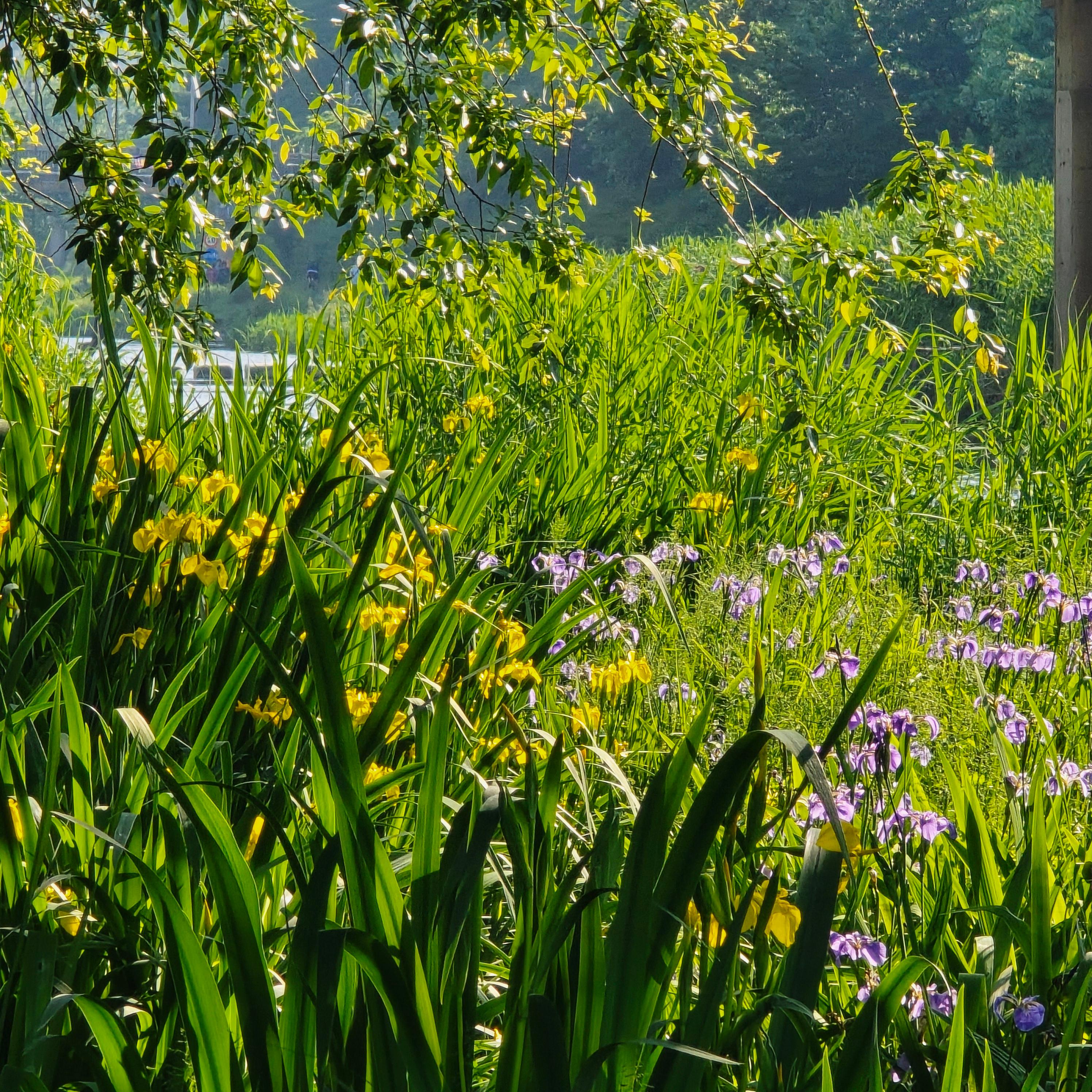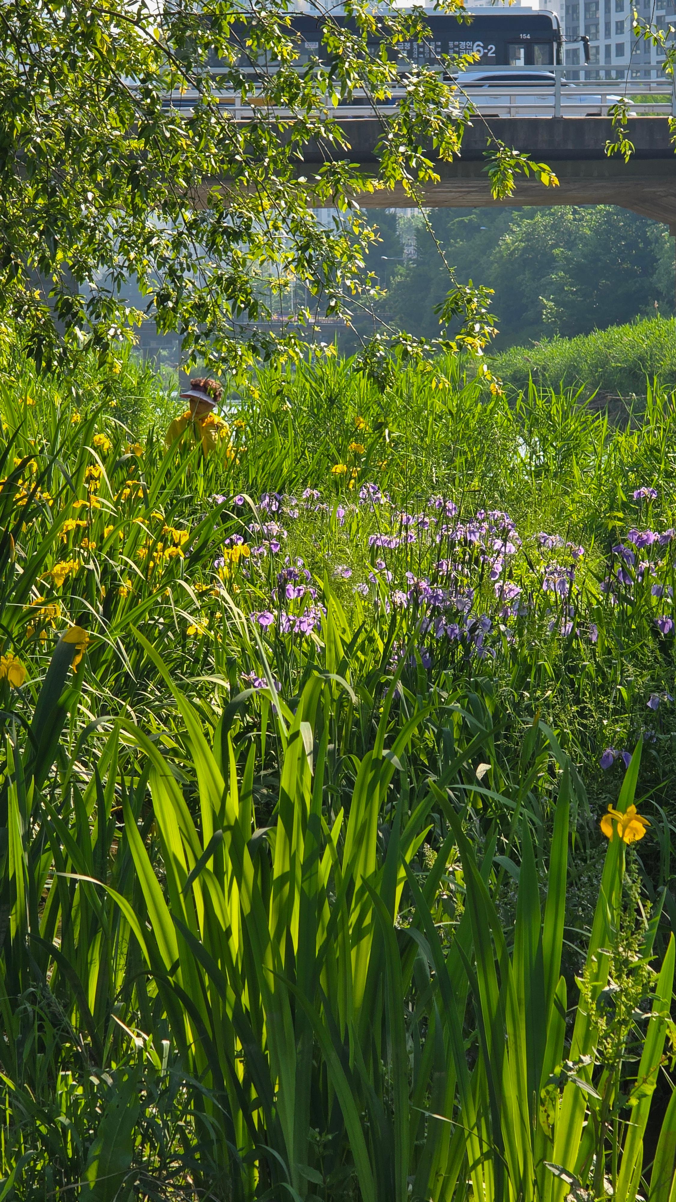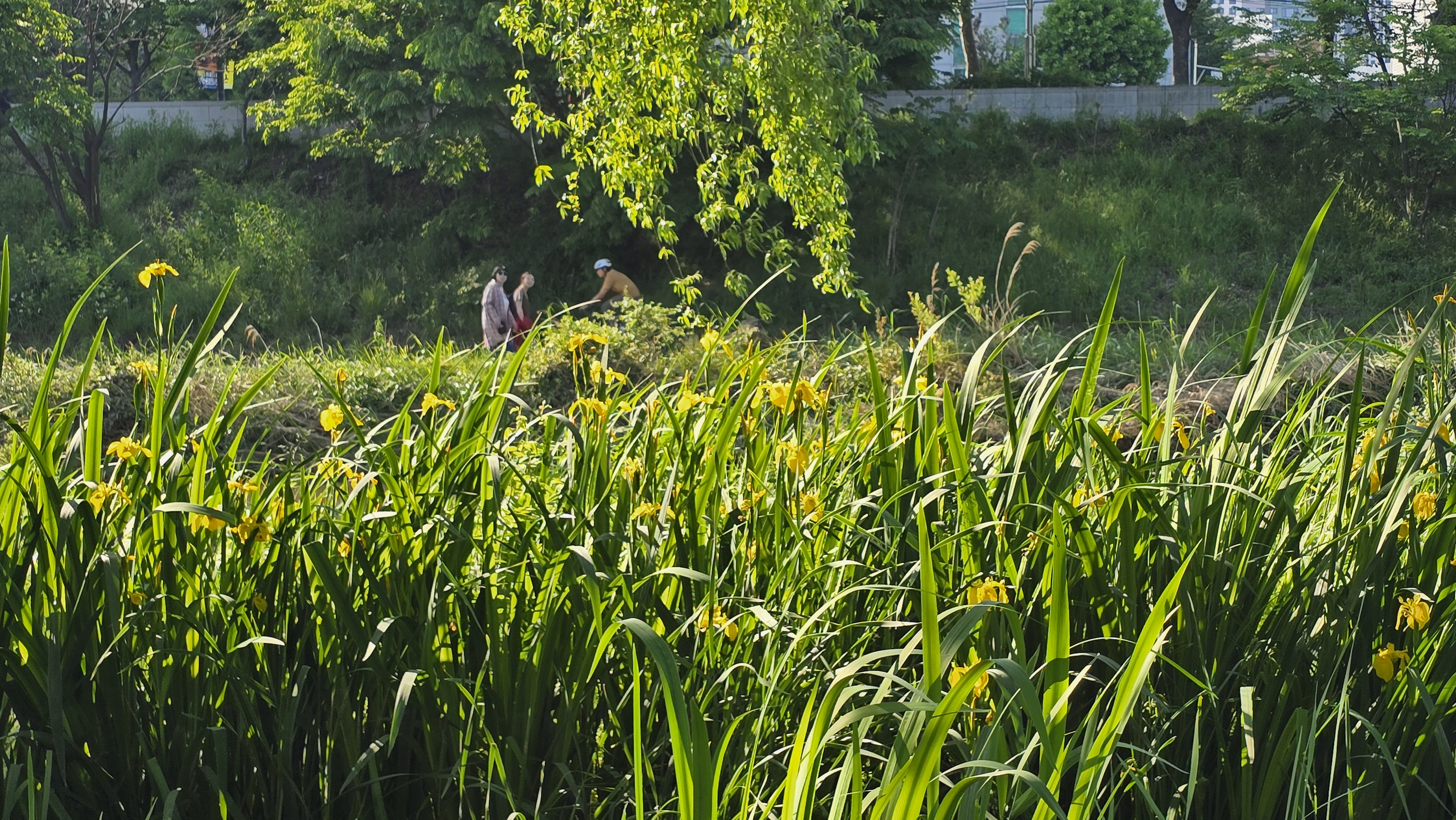 2025.05.18/ #도시기록 #안양 #학의천 #학운습지/ 붓꽃과 노랑창포꽃 피고, 참개구리 울어대고, 새 소리 들리고, 산들바람 불면 녹색의 수양버들 가지 출렁이는 가장 예쁜 시기로 습지 물가 자그마한 의자에 앉아있으면 바람과 소리 그리고 햇빛 멍 때리기 굿이다.