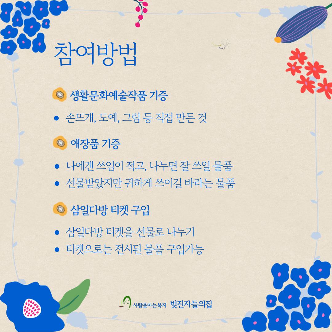 이를위해 빚진자들의집에서는 지금은 작품, 애장품을 받고 있다. 그림, 도예, 사진, 방짜유기, 조각, 서예, 등 직접 만든 작품, 또는 선물받았는데 사용하지 않은 물건이나 나누고싶은 물건을 기증받고 있다.(문의: 031-441-2888)