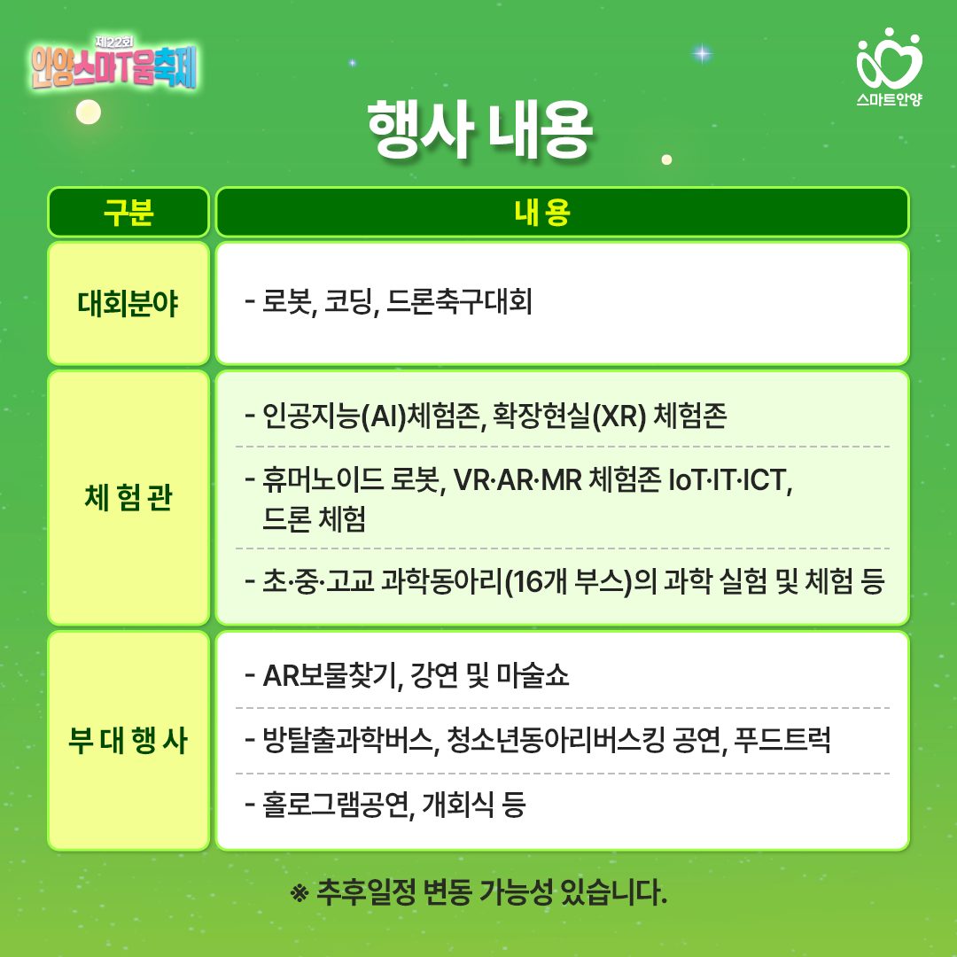 <안양스마T움축제>는 글로벌 ICT 전문가 및 과학 인재 양성과 더불어 빠르게 변화하는 사회 흐름에 따라 과학 분야를 발전시키려는 취지로 시작되었고 경진대회, 정보화 체험관, 초중고교 과학동아리 부스 운영 등 다양한 부대행사로 구성된 대규모 과학축제다.