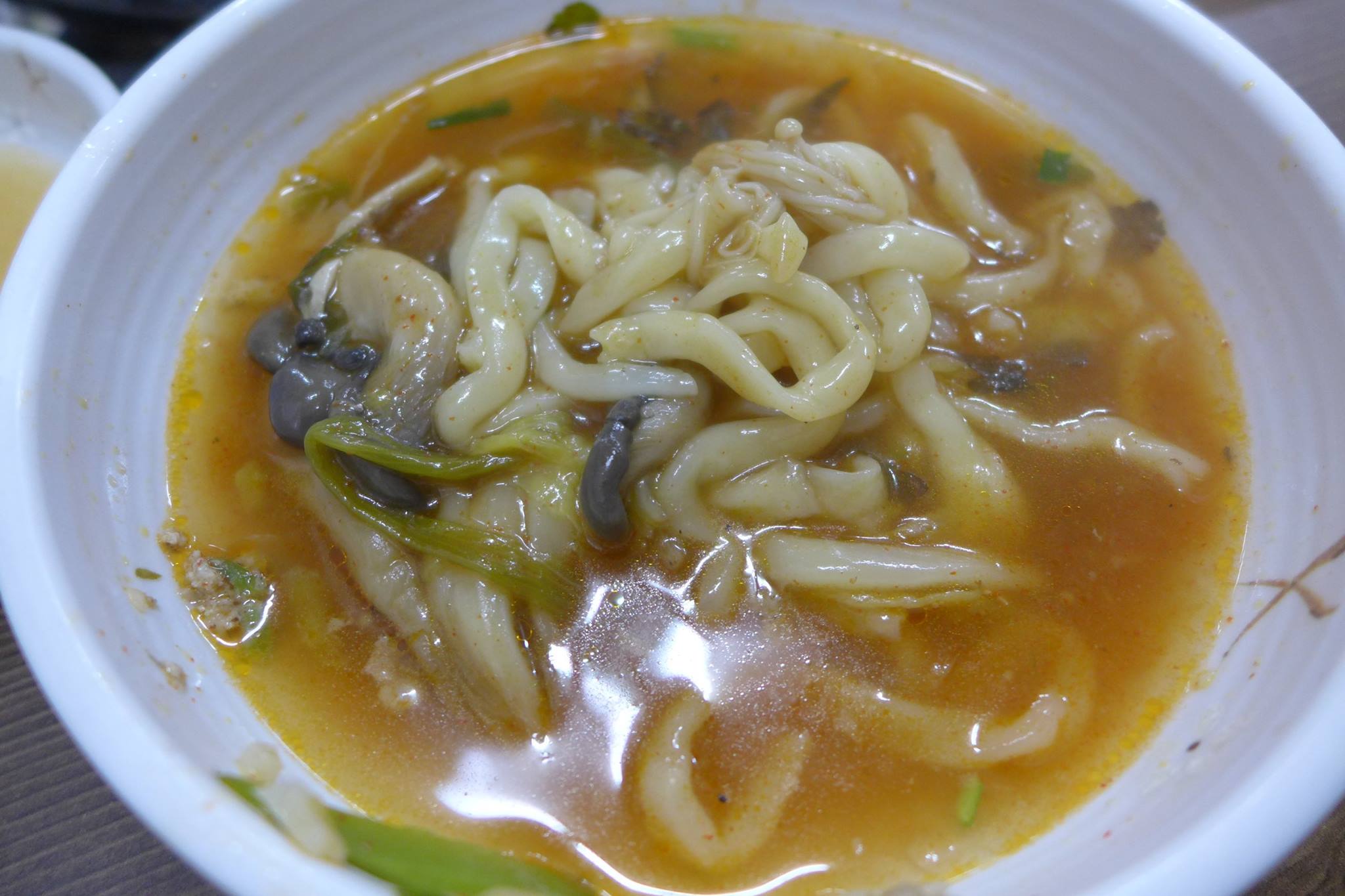 만두전골에는 만두에 숙주나물, 느타리버섯, 그리고 부추도 있고, 2인분을 기준으로 만두전골 안에 만두는 고기만두 두 개, 김치만두 두 개 들어있다. 육수는 약간 붉은색이지만 생각보다 맵지 않다.