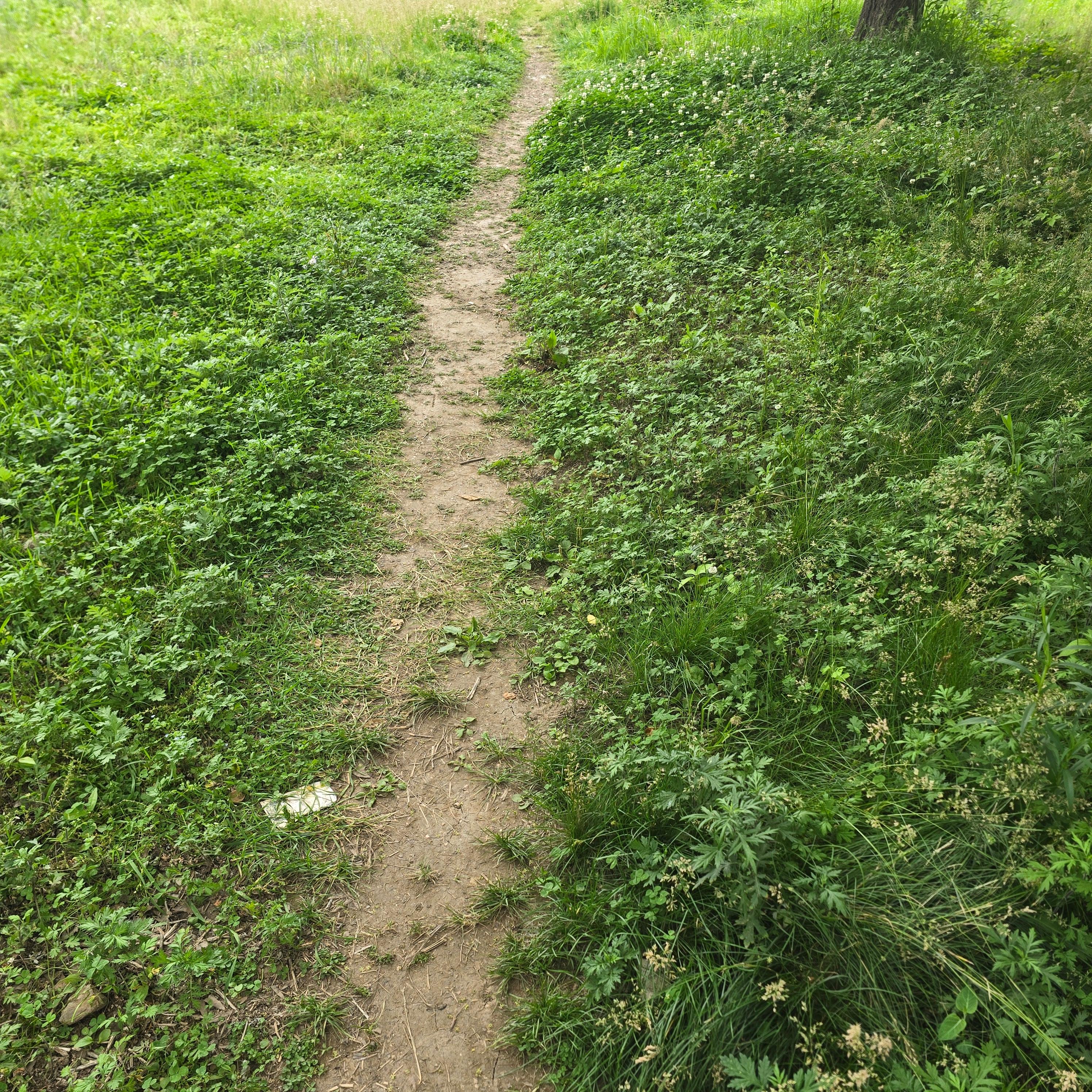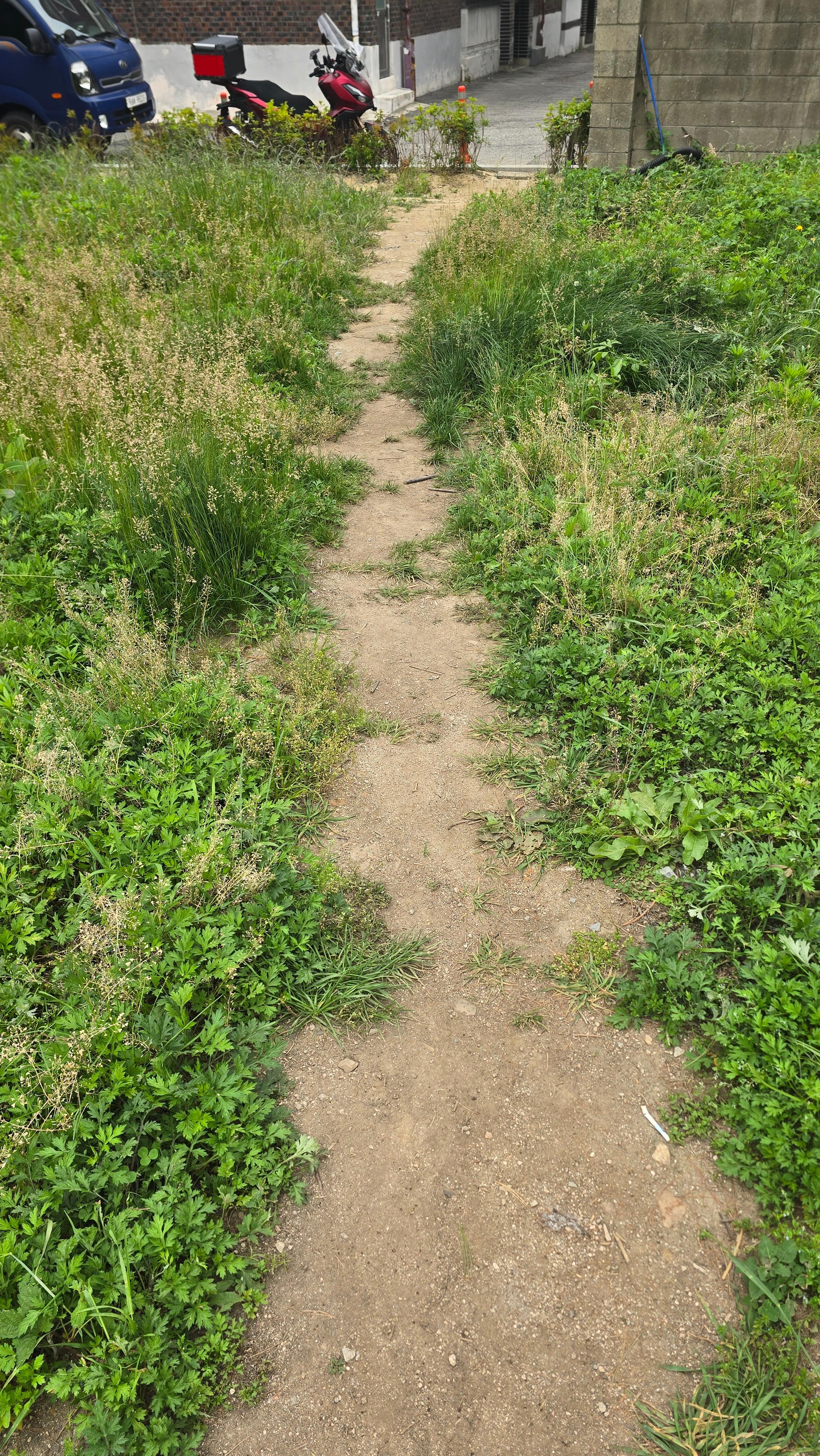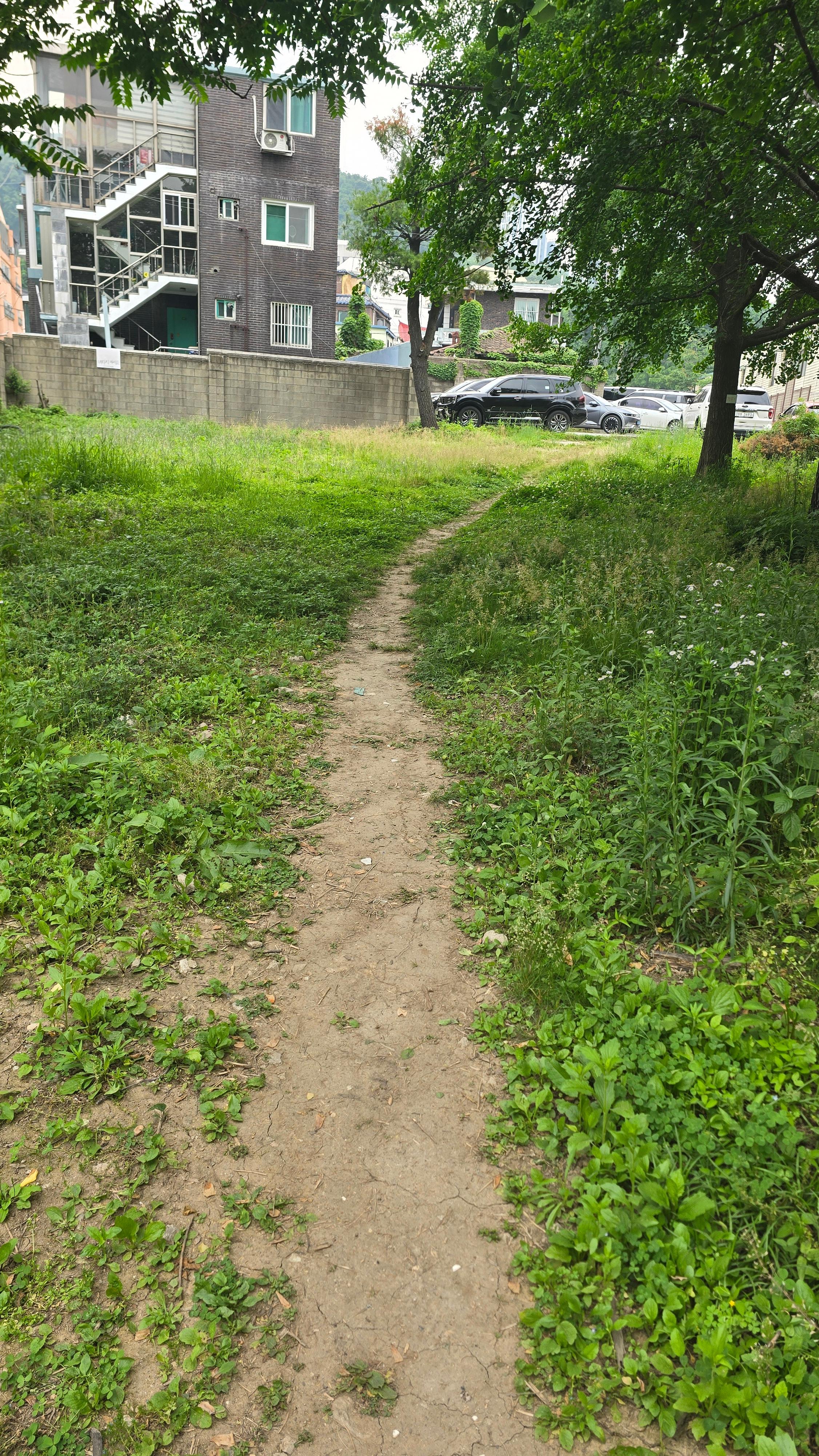 2025.06.02/ #도시기록 #안양 #길 #엣검역원/ 안양6동 옛검역원내 정원에 맨발걷기 열풍으로 반들반들한 흙길이 생기고 담장 일부가 철거된 이후 수풀을 가로지르는 지름길이 생겼다.