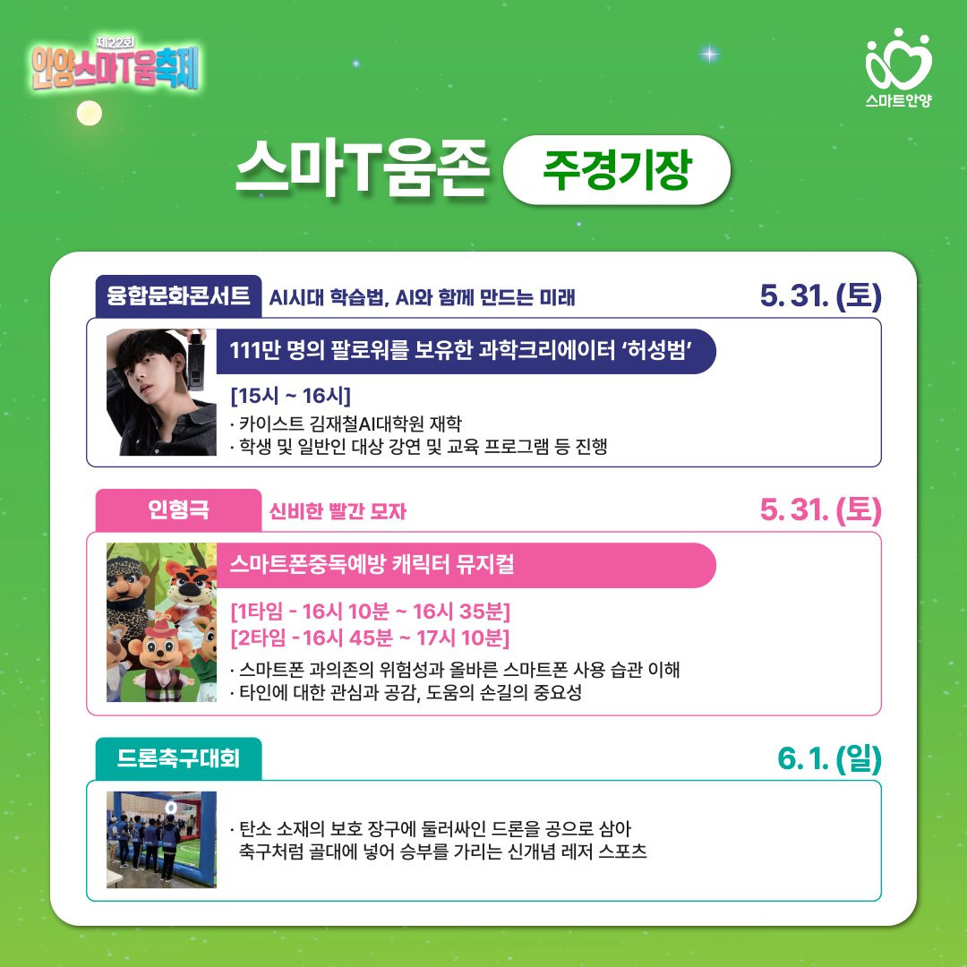 안양시 주최로 지난 5월 31일부터 6월 1일까지 이틀간 안양종합운동장 일원에서 열린 ‘제22회 안양스마T움축제’가 시민들의 큰 호응 속에 성황리에 마무리됐다.