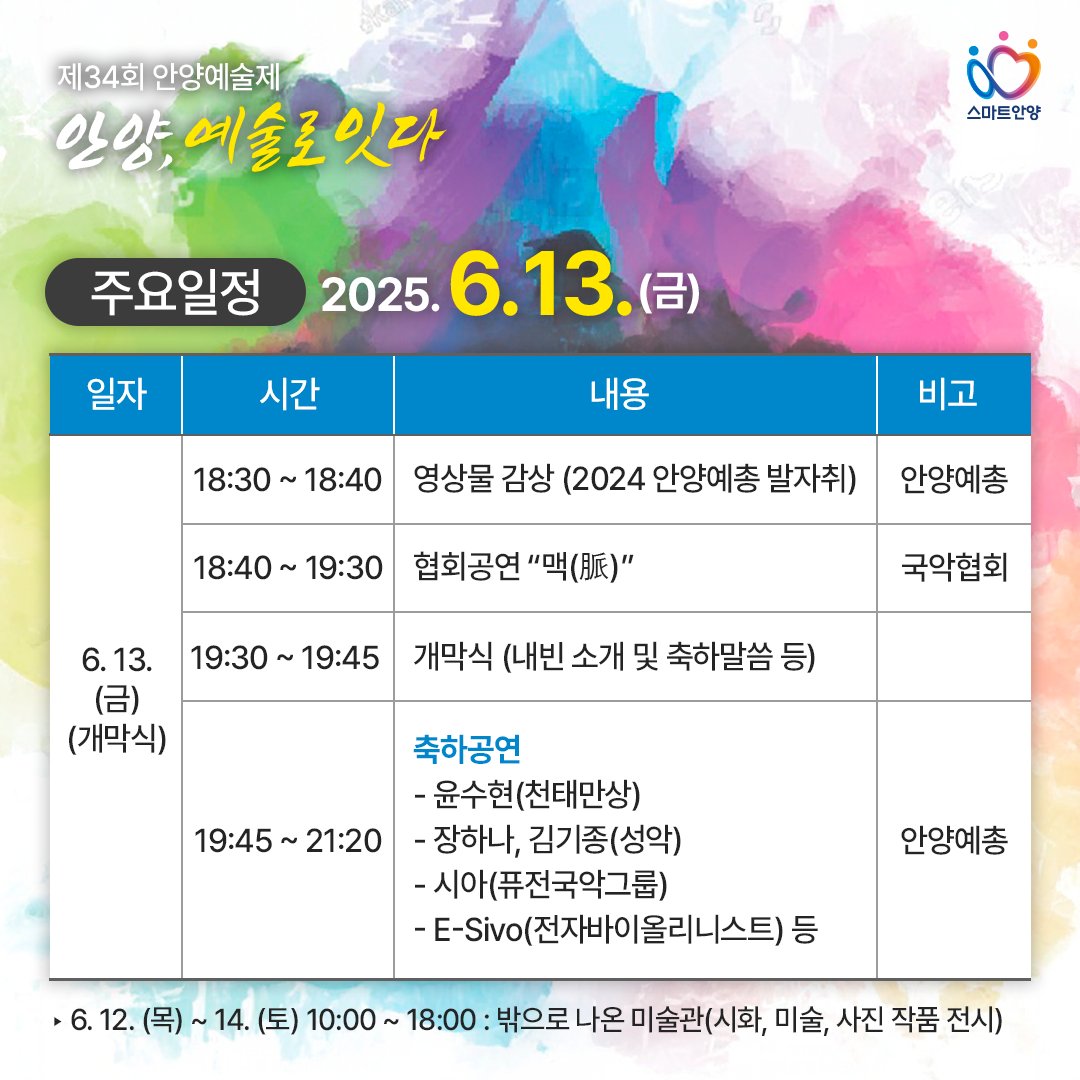 이번 축제는 사단법인 한국예총 안양지회가 주최하며, 13일 오후 6시30분 영상물 상영과 국악공연 ‘맥(脈)’을 시작으로 공식 개막한다. 오후 7시30분 개막식 후에는 윤수현(천태만상), 장하나·김기종(성악), 퓨전국악팀 시아, 전자바이올리니스트 E-Sivo의 축하공연이 무대에 오른다.