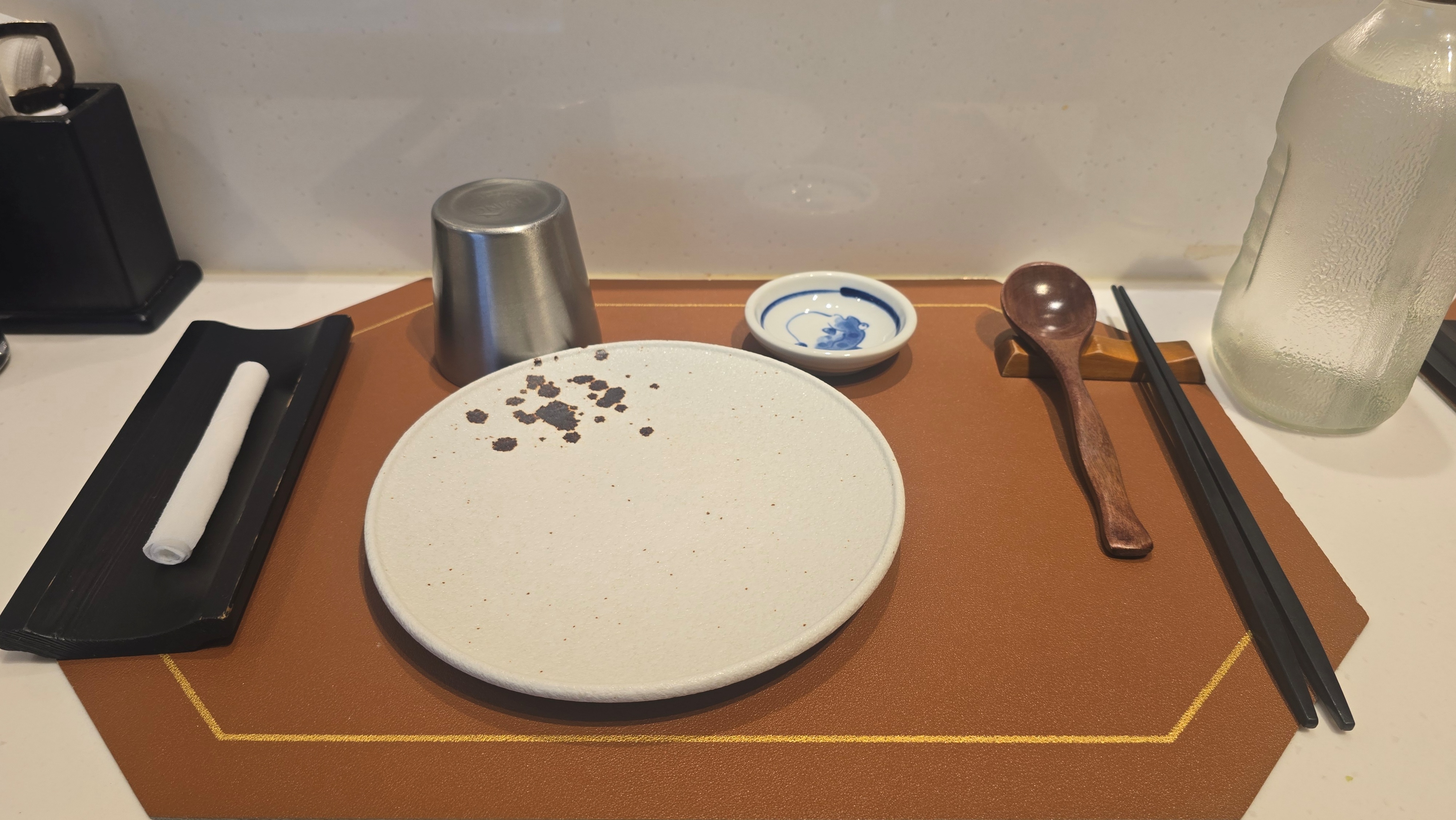 테이블에는 락교, 생강, 와사비가 세팅되어 있다. 손님들이 모두 자리에 착석하면 쉐프가 시작을 안내한다. 미소된장국을 내주면서 알레르기라던지, 못 드시는 재료들이 있으면 이야기를 해달라고 한다, 이때 음료 또는 술 주문을 받는다.