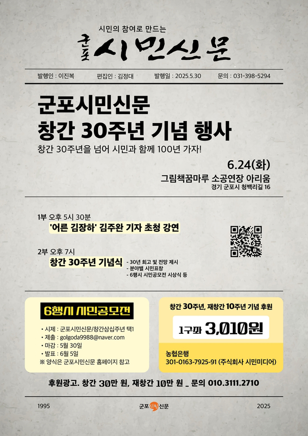 시민 참여 언론, 지역정론지를 모토로 내세우는 군포시민신문이 창간 30주년을 맞아 오는 6월 24일(화) 그림책꿈마루(군포시 청백리길 16) 소공연장 아리움에서 기념행사를 개최한다.