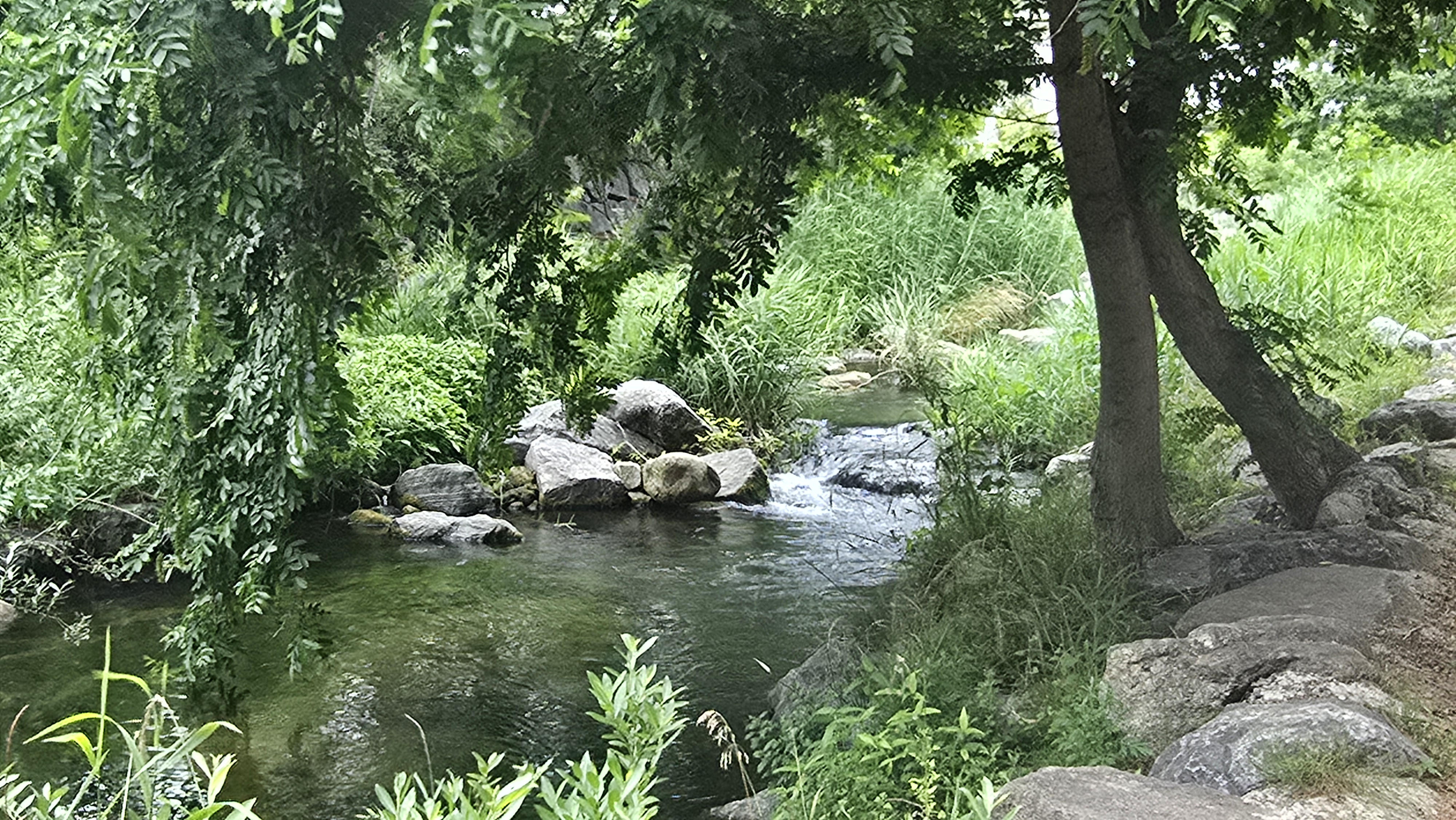 2025.06.15/ #도시기록 #안양 #삼성천 / 경수대로~중초사교~마애종교~예술공원교 구간 삼성천 풍경. 녹음 짙은 나무 그늘의 천변 산책길이 아름다운 곳. 하천 물 깊이가 제법 깊다. 온갖 물고기들이 바글바글하다.