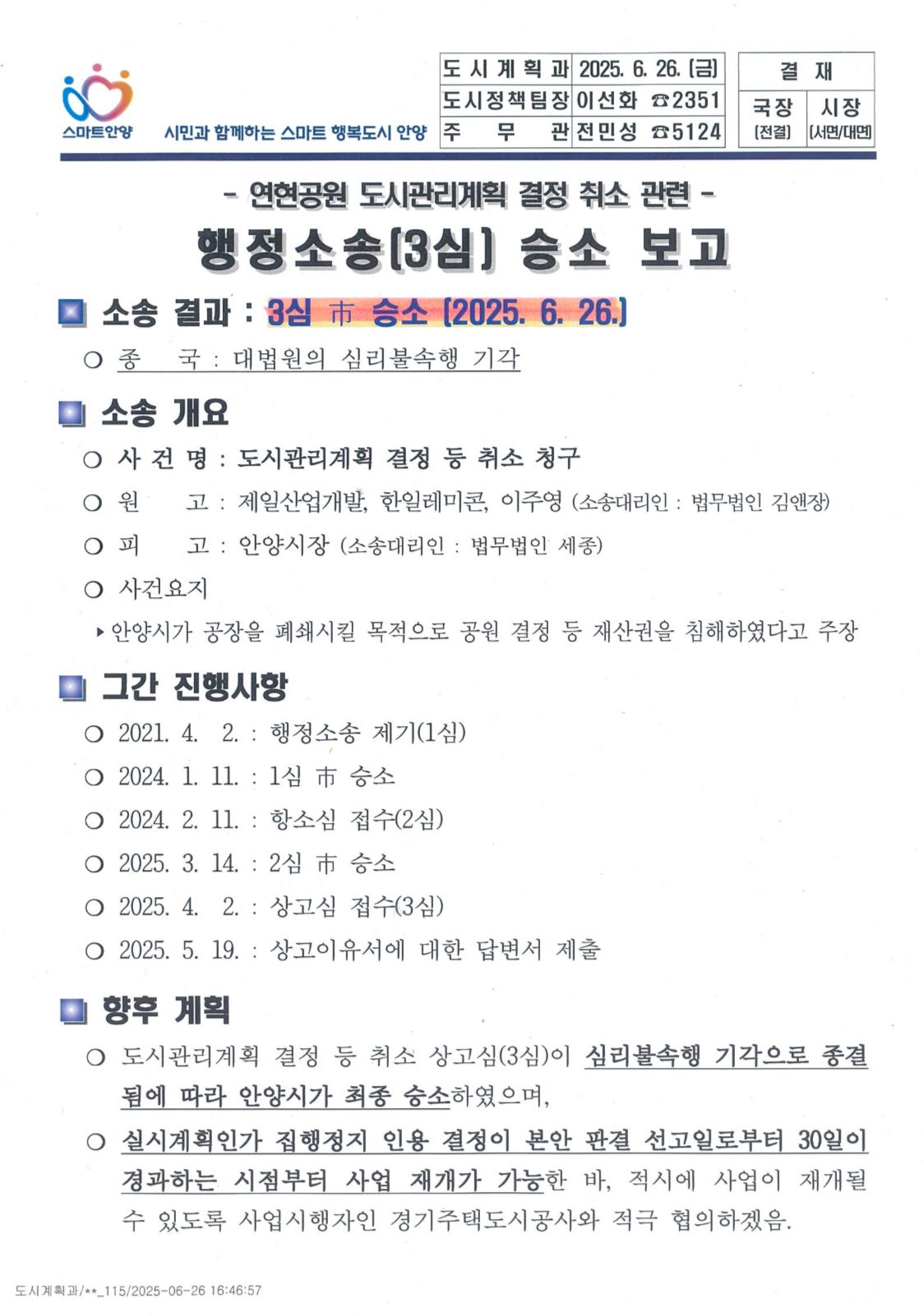 아스콘 제조업체인 제일산업개발 등이 안양시를 상대로 제기한 연현공원 도시관리계획결정 등 취소 소송 3심에서 대법원이 심리불속행으로 상고를 기각하며 안양시의 승소가 확정됐다.