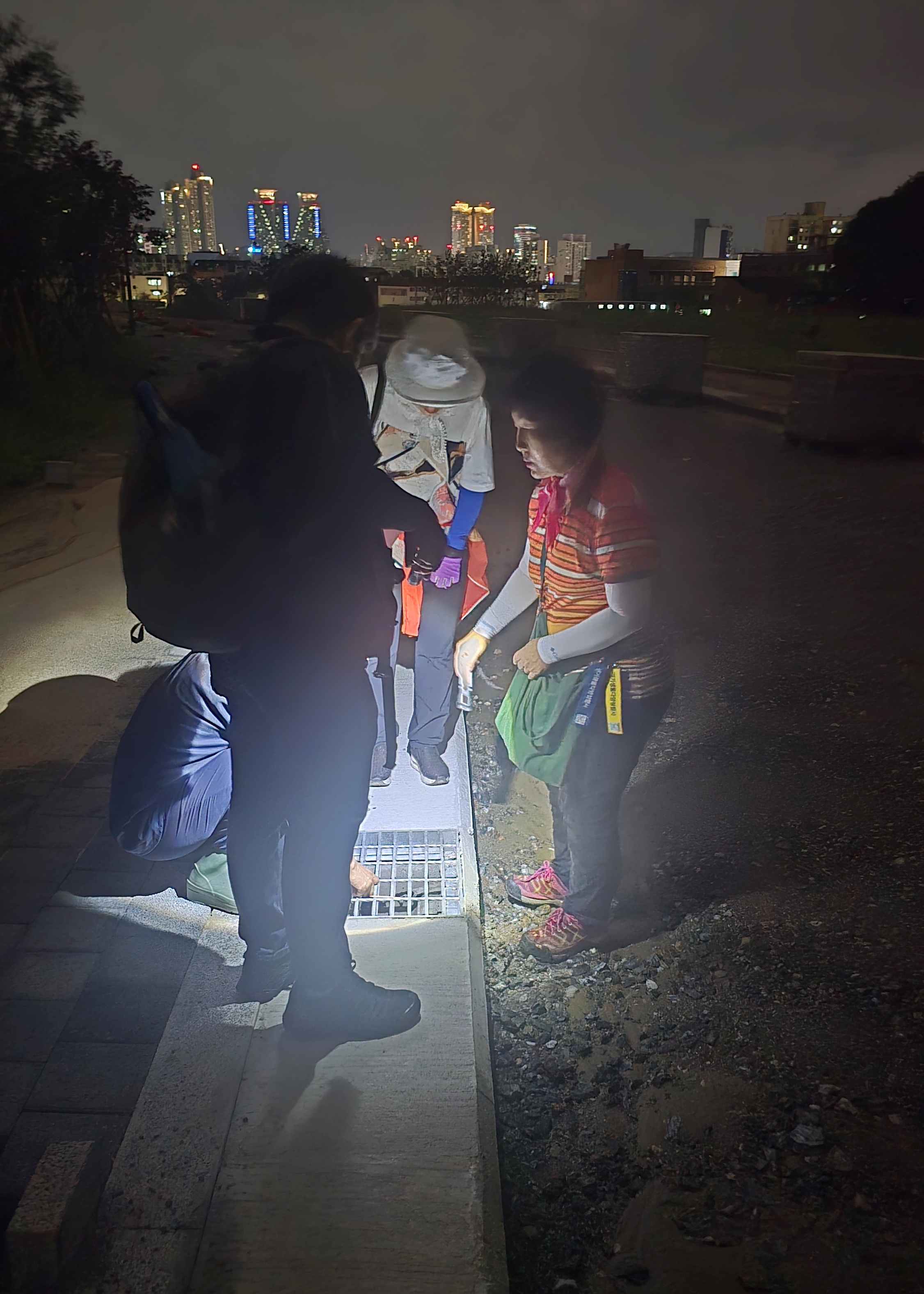 폭우가 쏟아진 날씨를 틈타 긴급 번개공지를 통해 저녁 9시 관양고교앞에 모인 팀사팀은 안양 관양동 그리니시티예정지내에서 들려오는 맹꽁이 소리를 청음하며 탐색하던중 하수관로 안과 마분산천 물길 수로에서 20-30개체의 맹꽁이를 청음하고 발견했다.