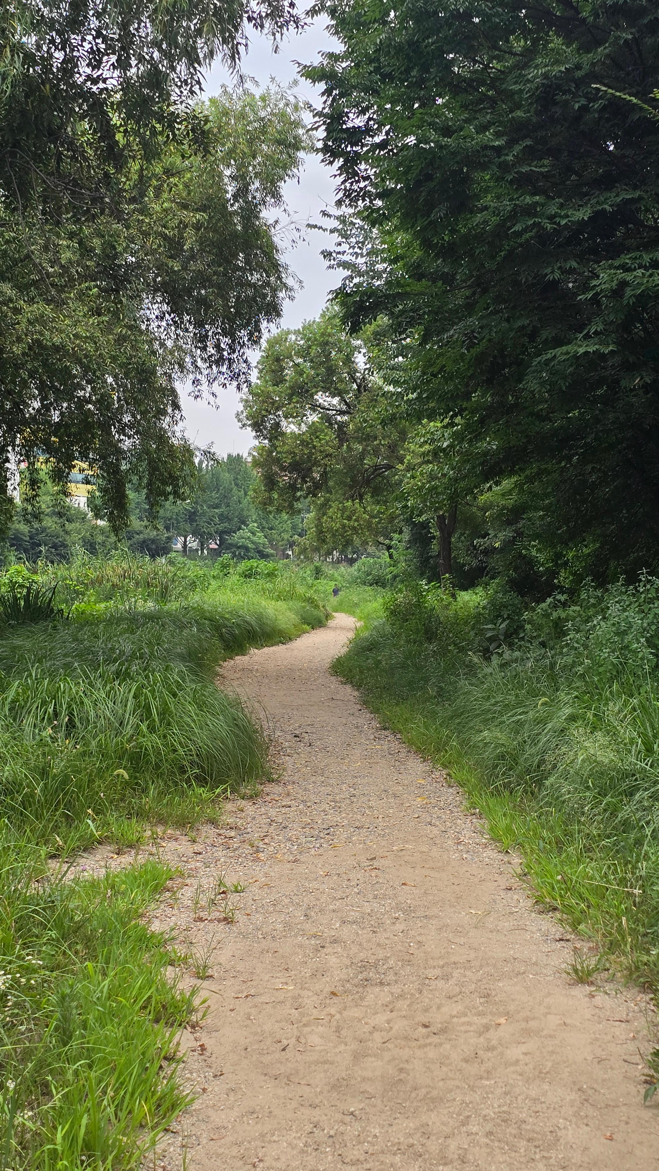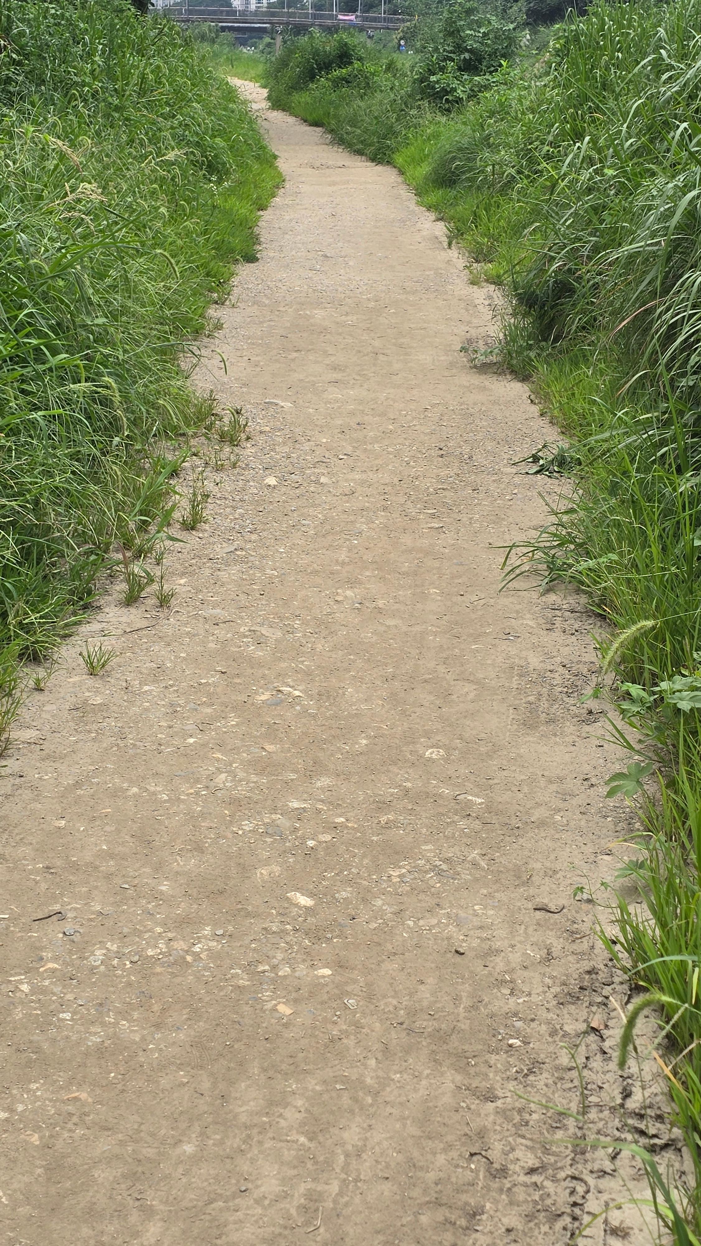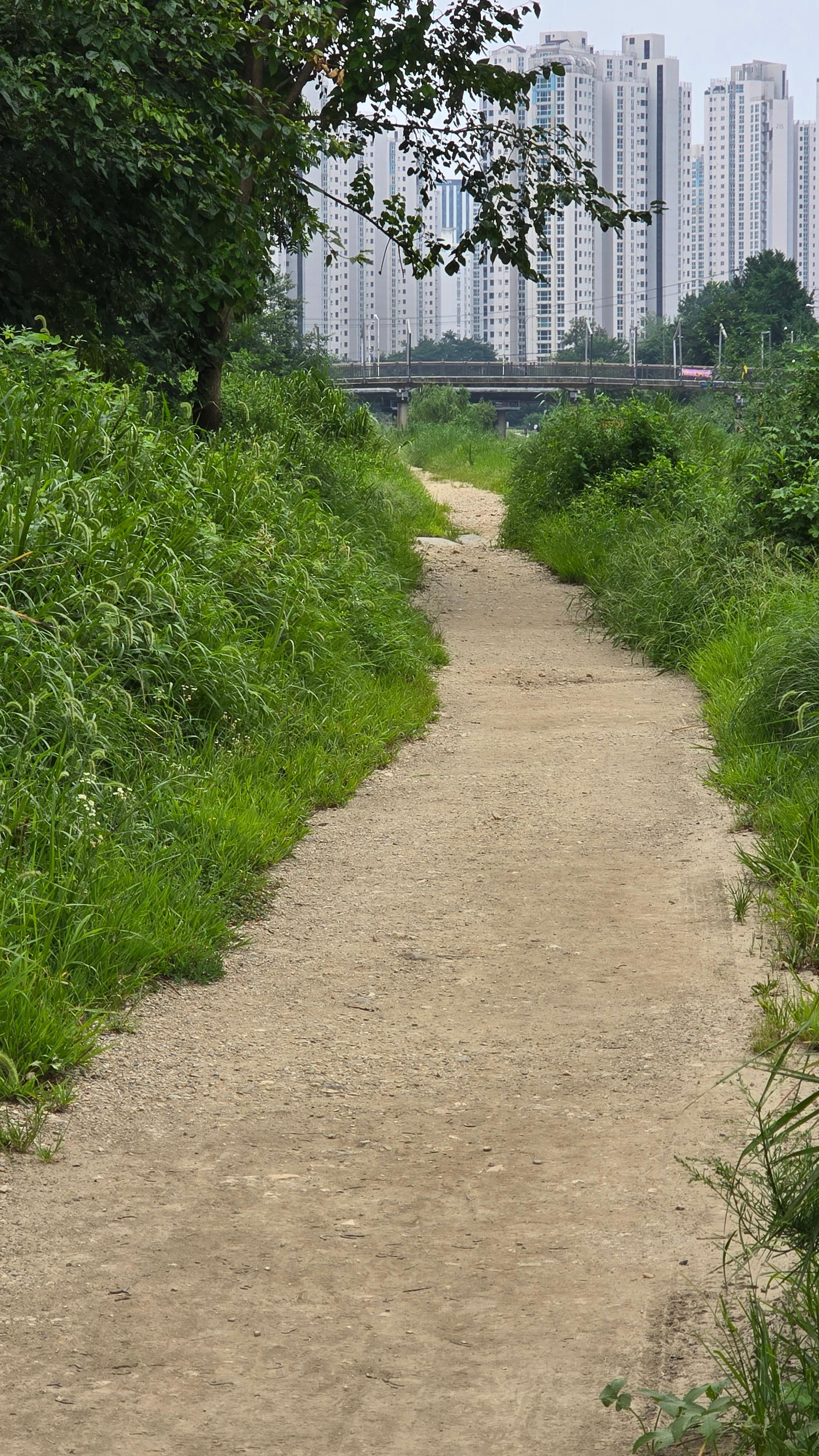 2025.08.03/ #도시기록 #안양 #학의천 #흙길/ 1999년 안양천살리기 사업을 통해 생태하천으로 조성하면서 흙길을 그대로 둔 학의천 남쪽 둔치 산책로. 사람과 자연(동식물)이 공존하는 구역이다.
