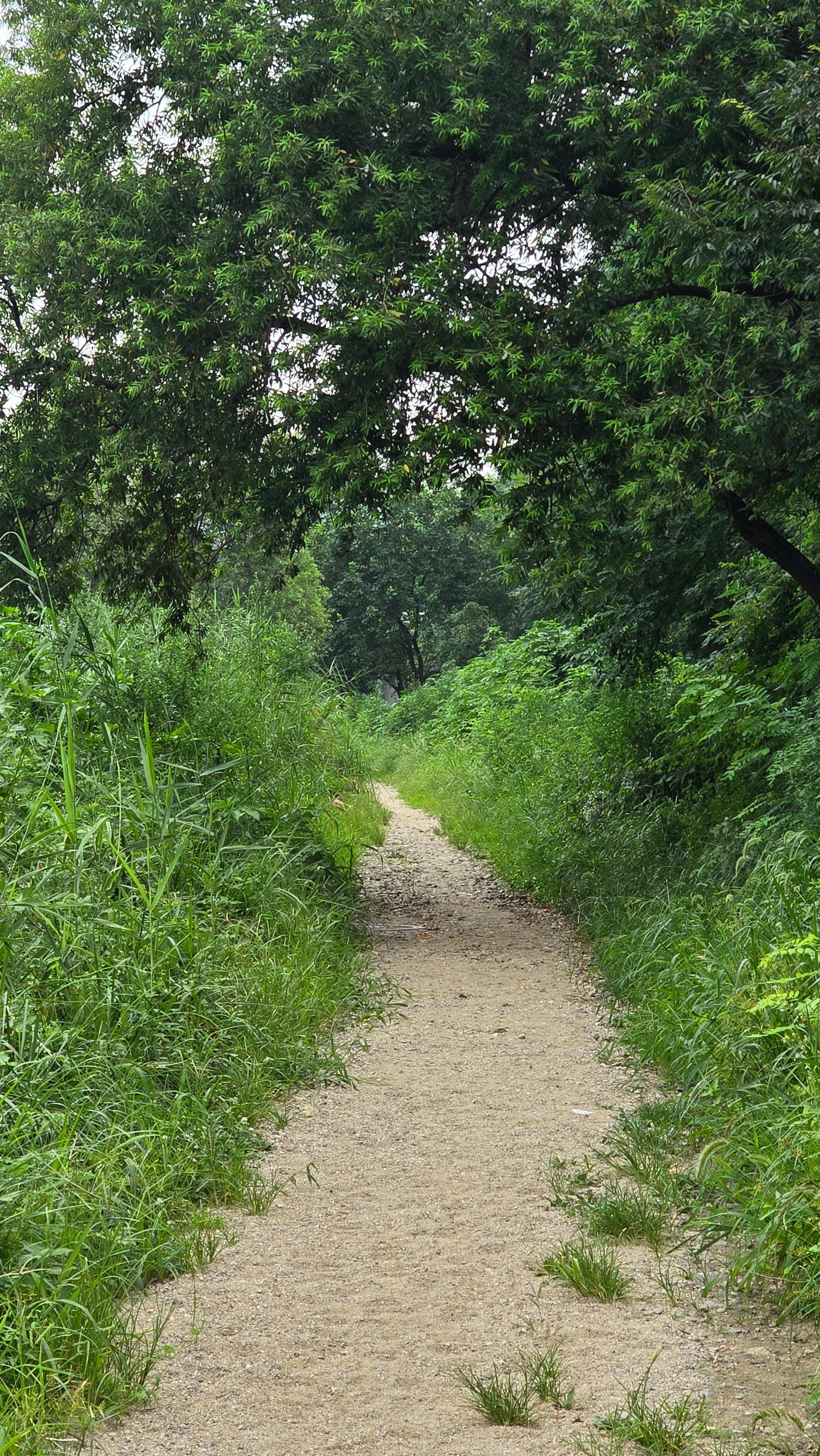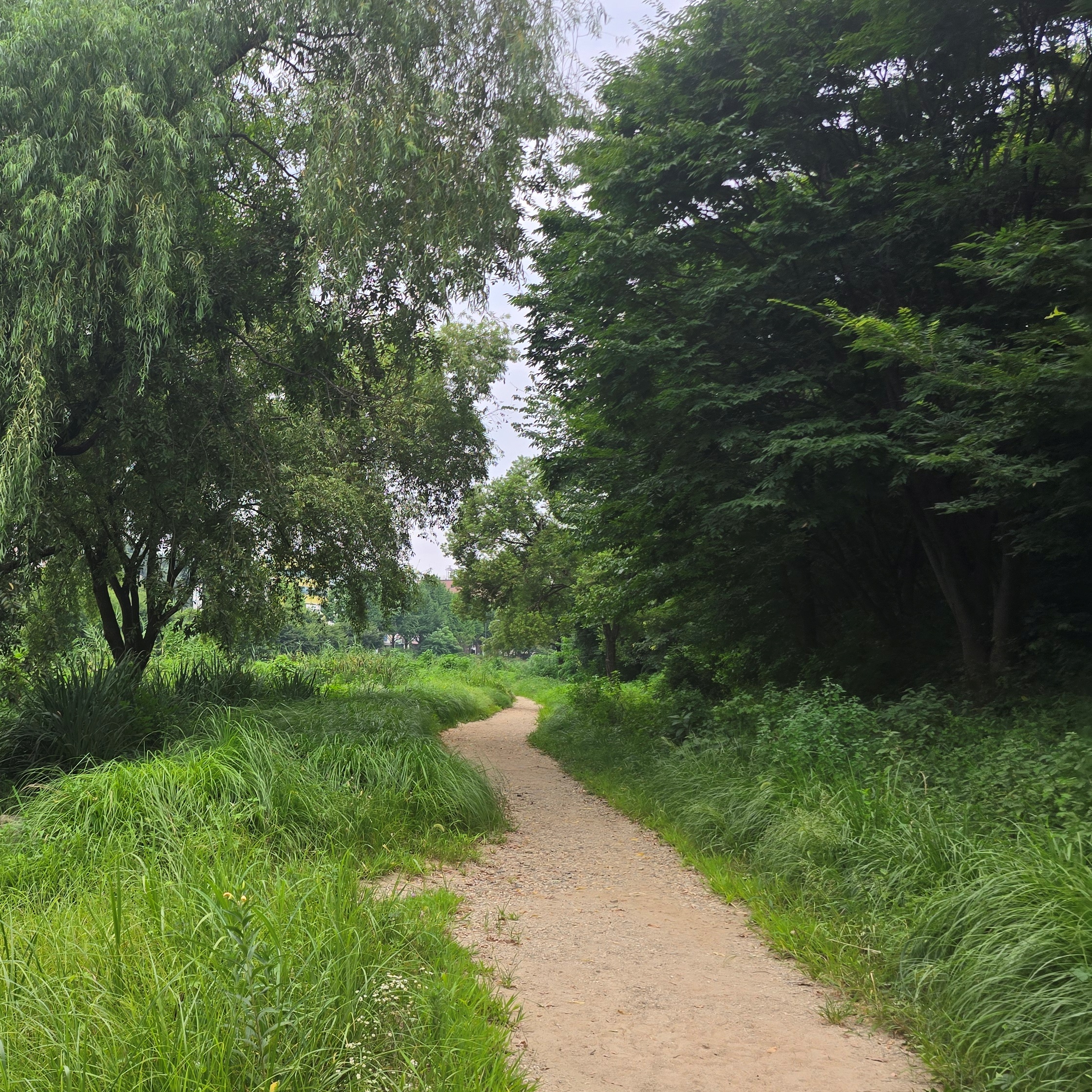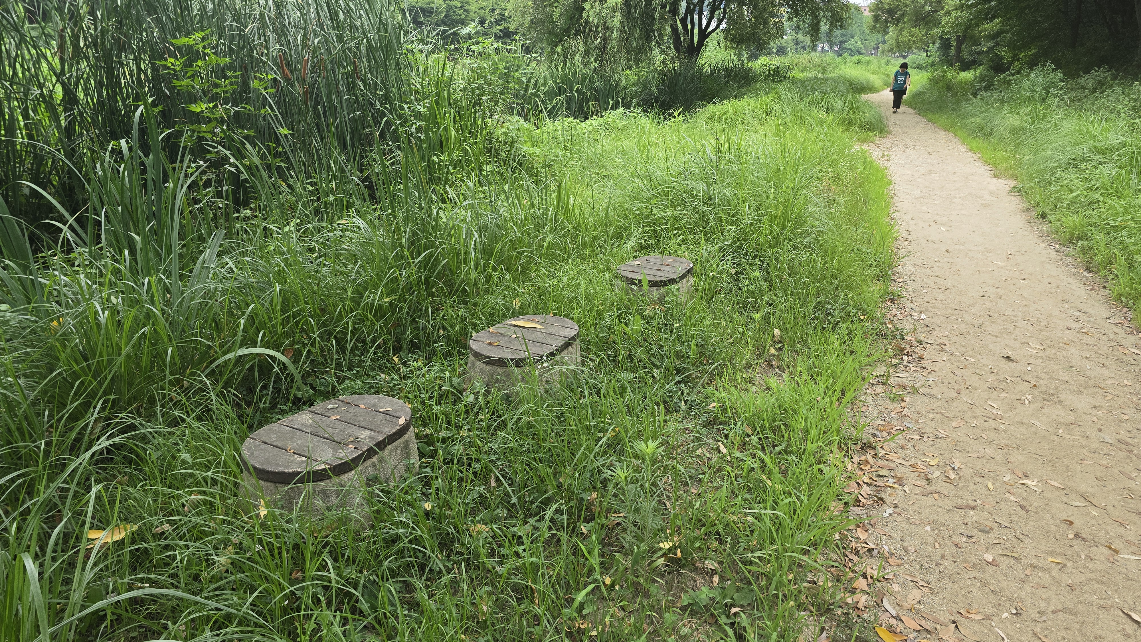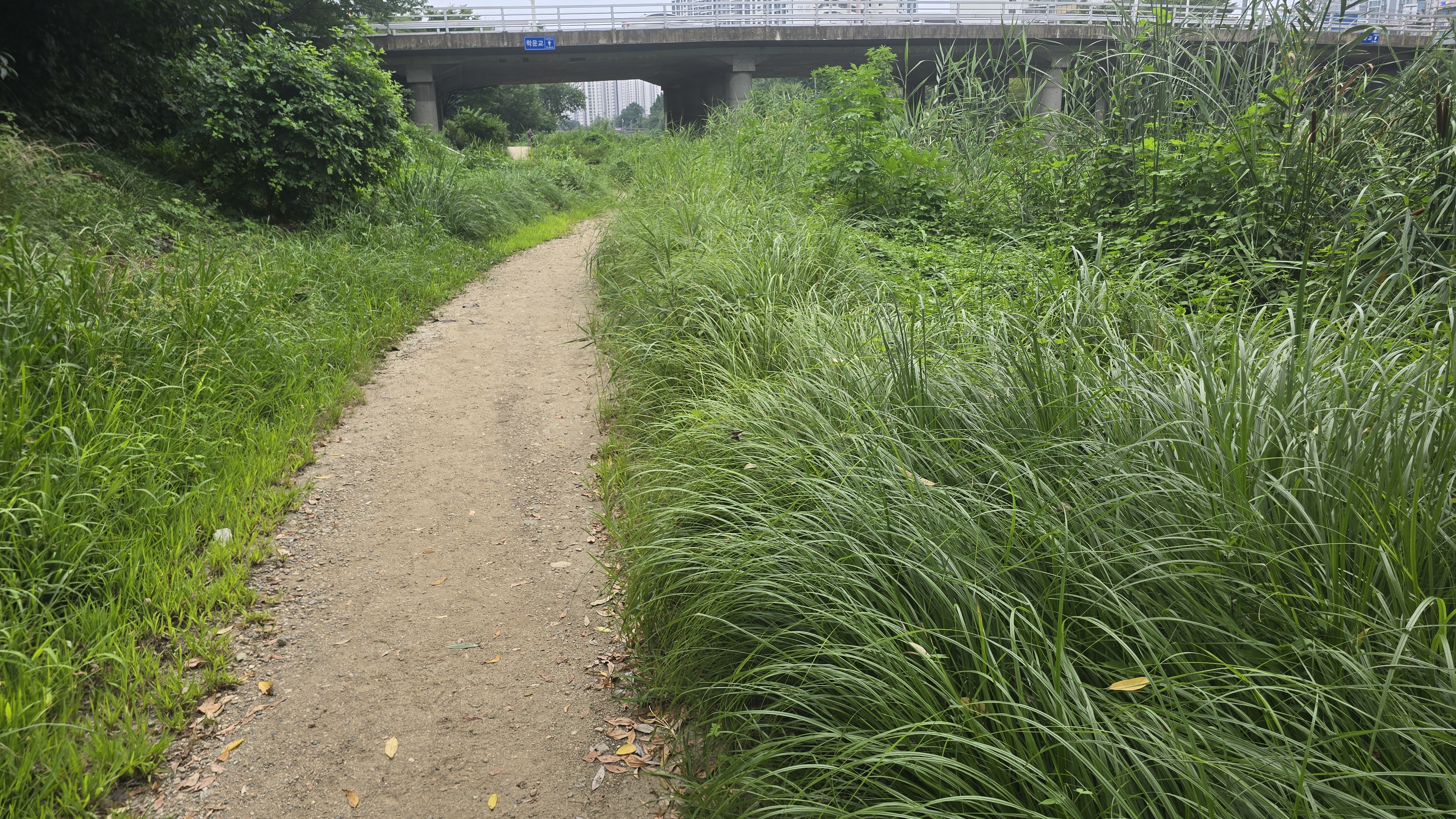 2025.08.03/ #도시기록 #안양 #학의천 #흙길/ 1999년 안양천살리기 사업을 통해 생태하천으로 조성하면서 흙길을 그대로 둔 학의천 남쪽 둔치 산책로. 사람과 자연(동식물)이 공존하는 구역이다.