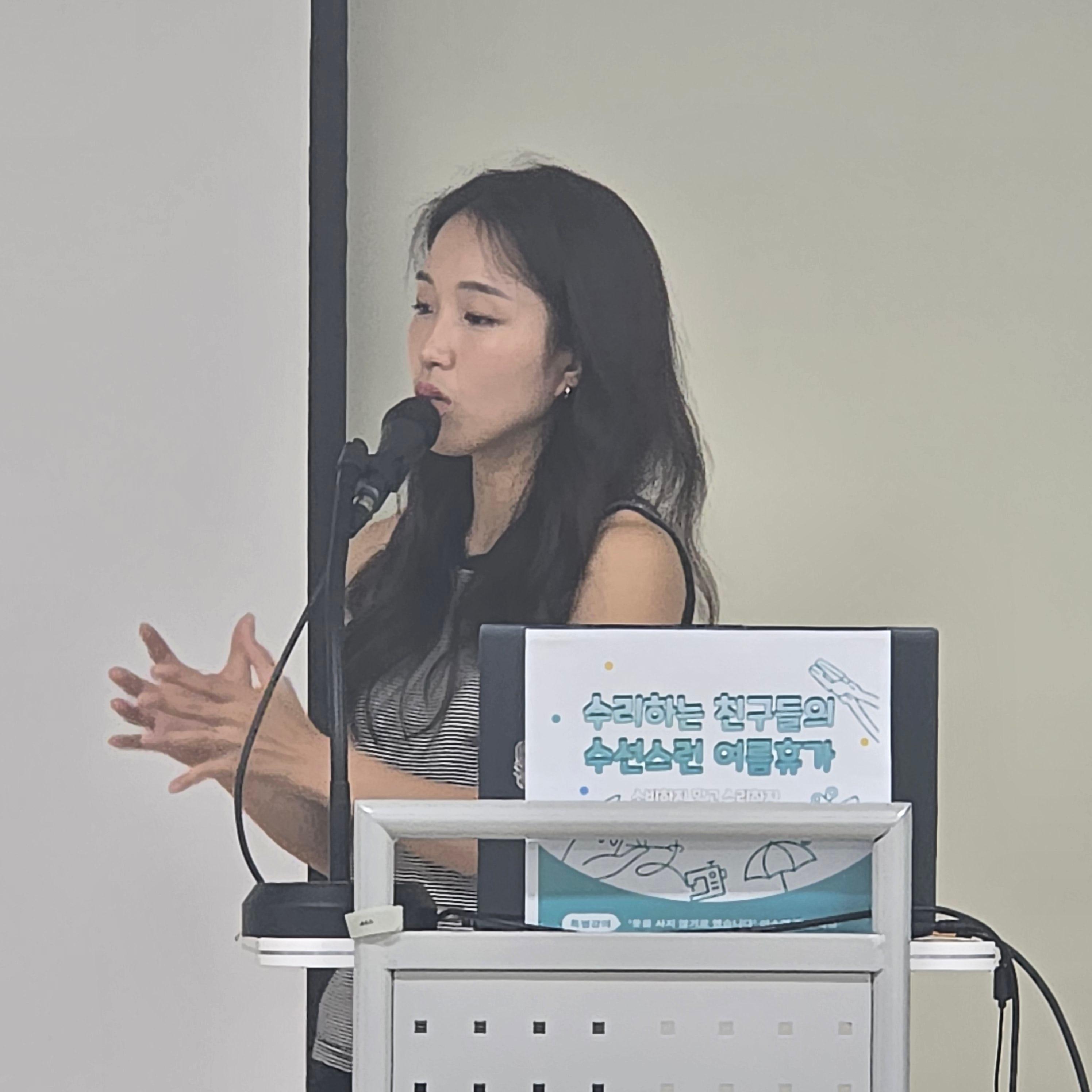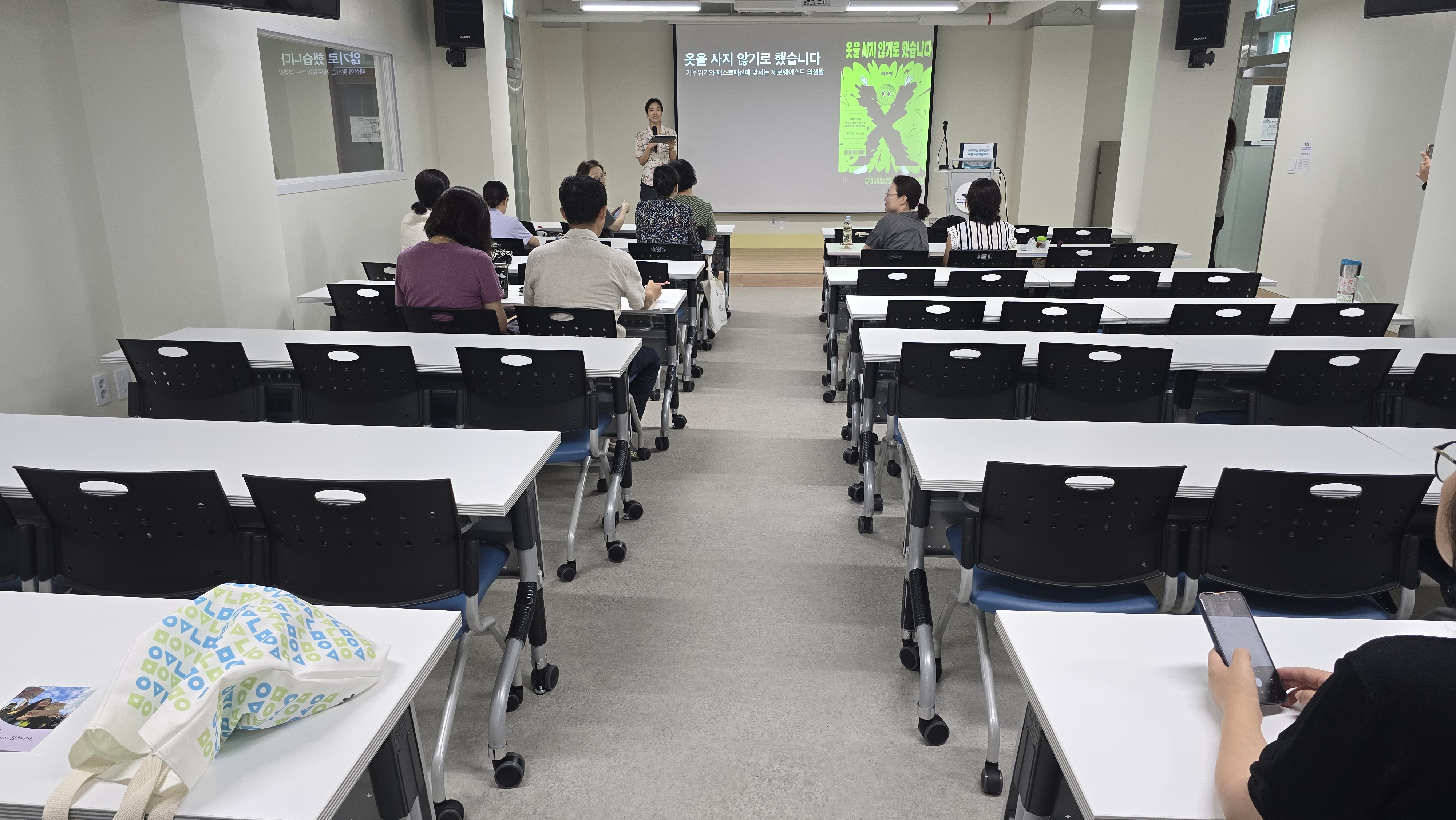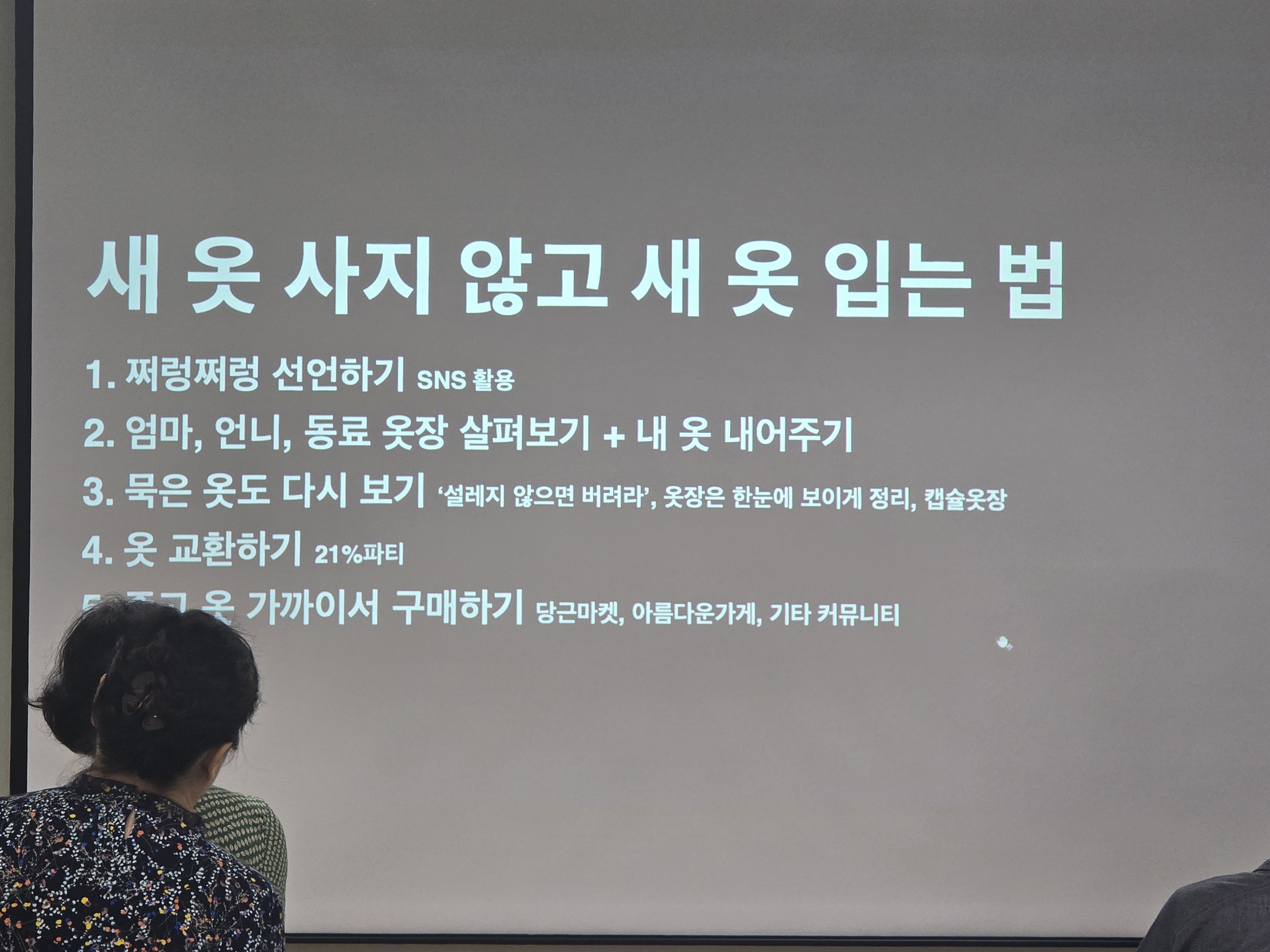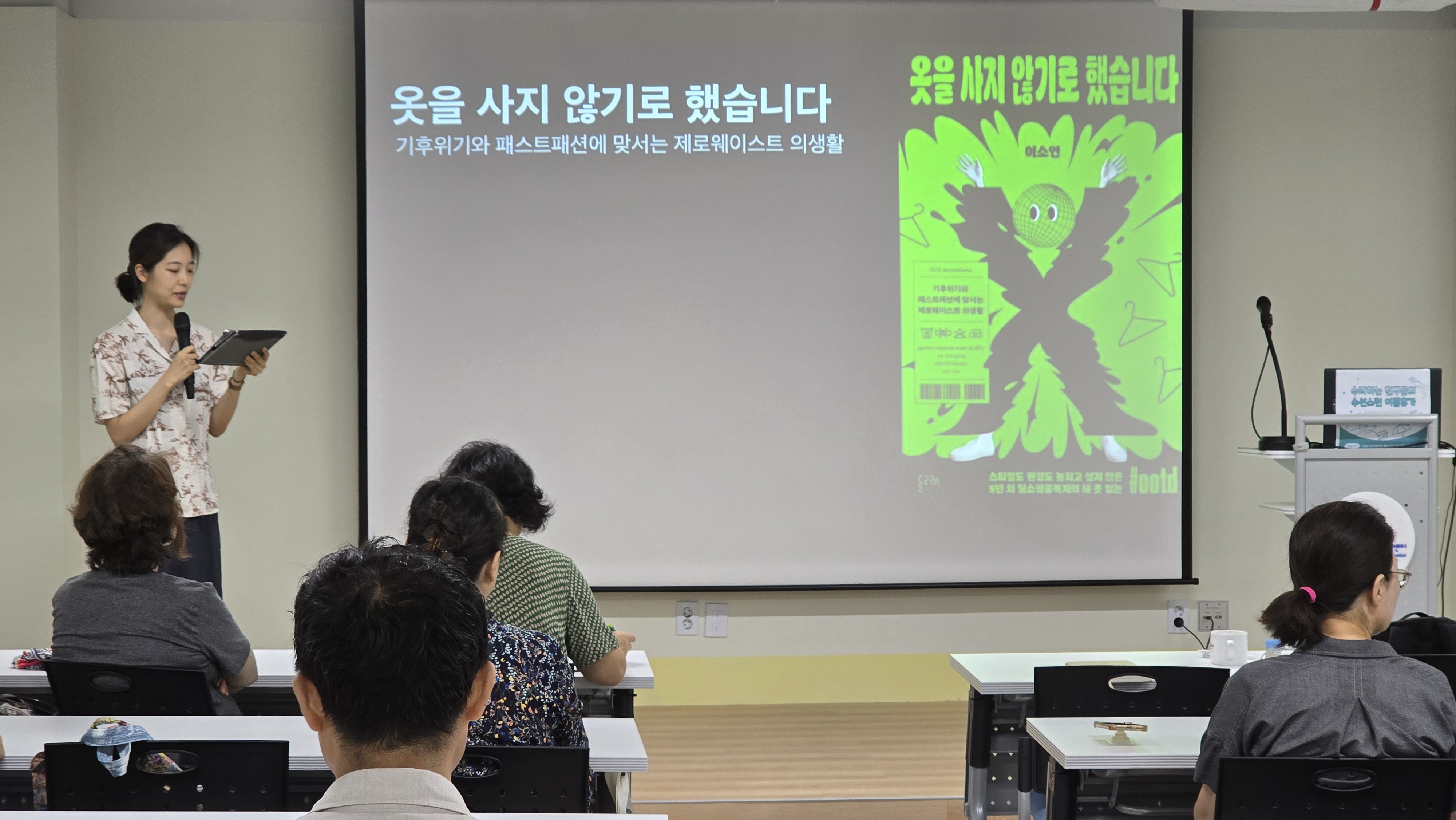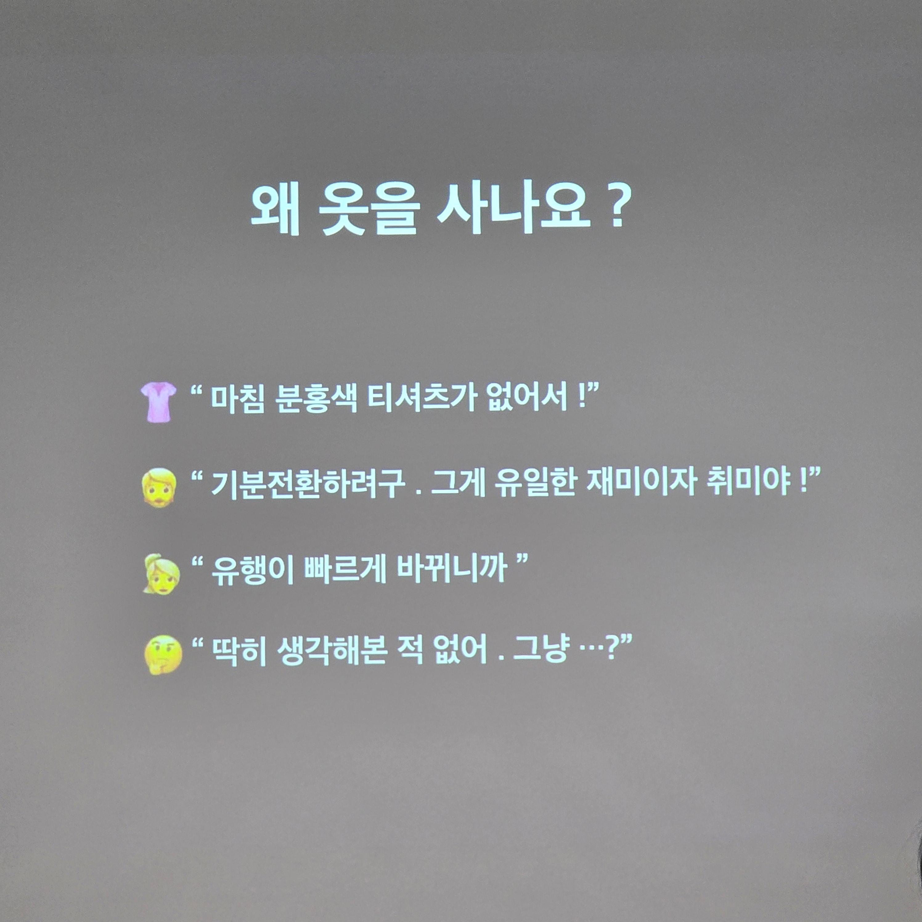 먼저 이날 오전에는 『옷을 사지 않기로 했습니다』의 저자 이소연 작가의 강연이 진행되었다. 이소연 작가는 7년째 옷을 사고 있지 않는 환경운동가다. 패스트패션, 그린워싱, 빈티지 소비 등 기후위기 시대 ‘지속가능한 의생활’에 대한 깊이 있는 이야기를 나누며 큰 공감을 얻었다.