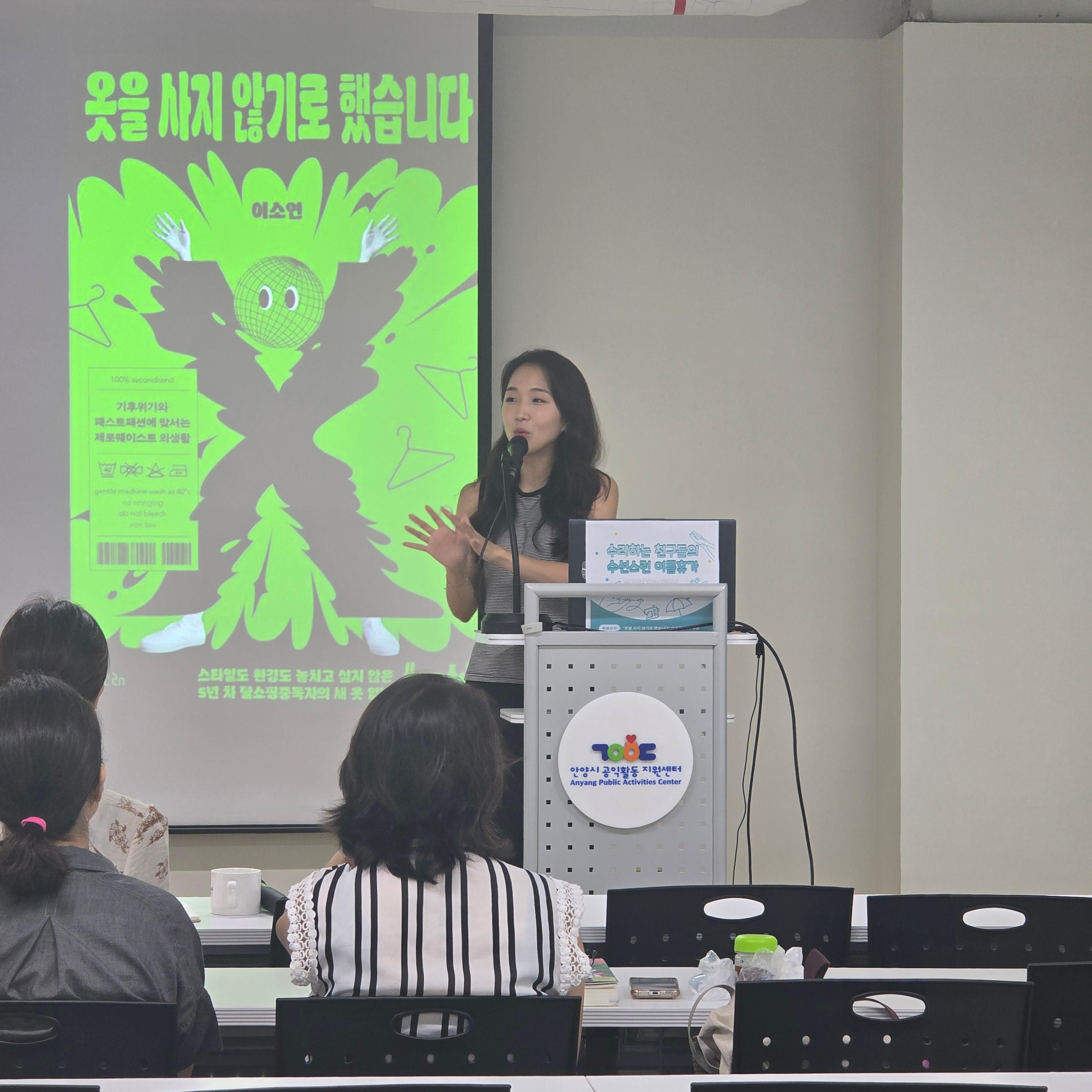 먼저 이날 오전에는 『옷을 사지 않기로 했습니다』의 저자 이소연 작가의 강연이 진행되었다. 이소연 작가는 7년째 옷을 사고 있지 않는 환경운동가다. 패스트패션, 그린워싱, 빈티지 소비 등 기후위기 시대 ‘지속가능한 의생활’에 대한 깊이 있는 이야기를 나누며 큰 공감을 얻었다.