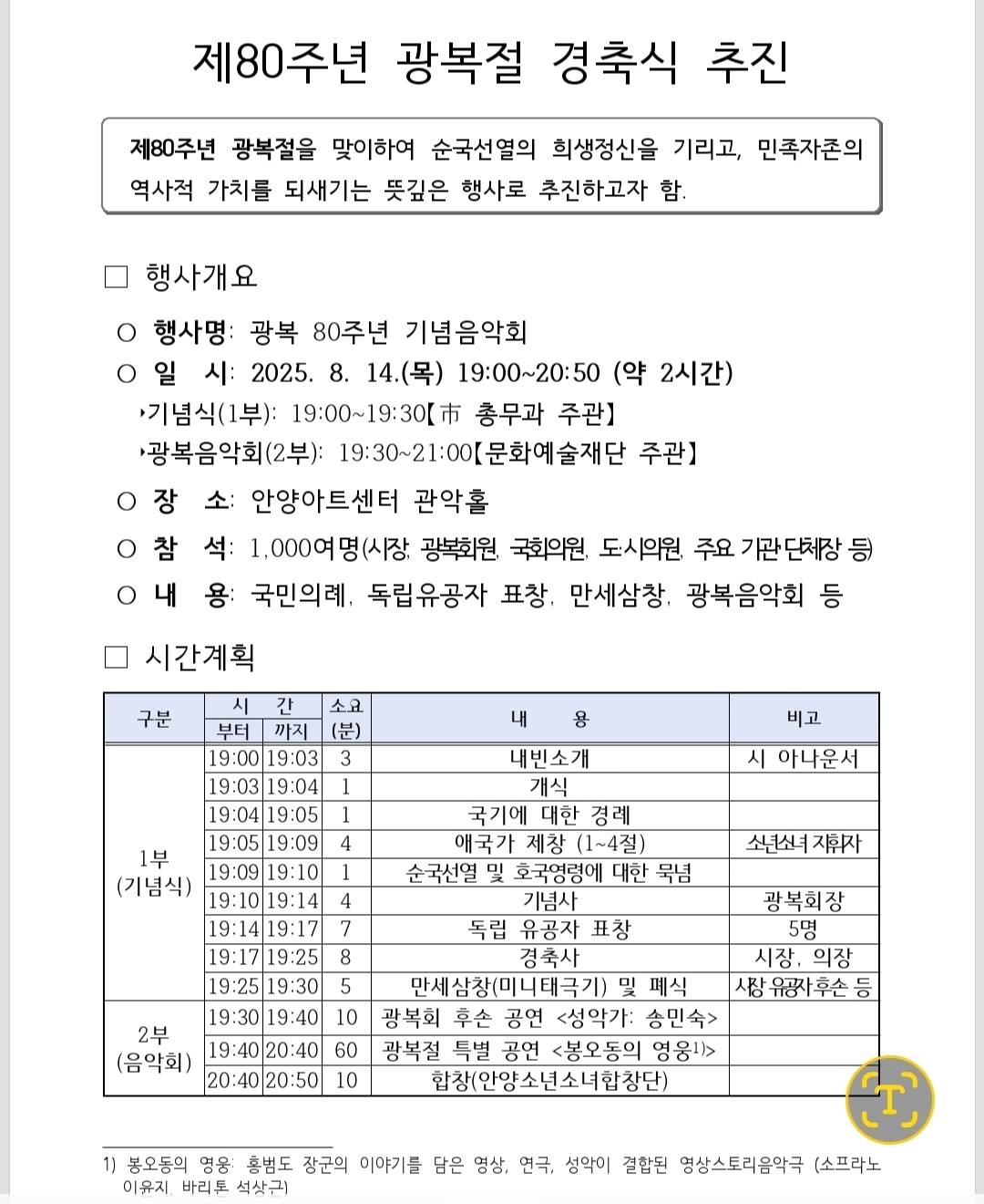 최대호 안양시장은 “광복 80주년의 뜻깊은 행사에 많은 시민이 참석해 역사적 의미를 담은 공연도 즐기고, 광복의 기쁨과 감동도 나누는 소중한 시간을 보내길 바란다”고 말했다.