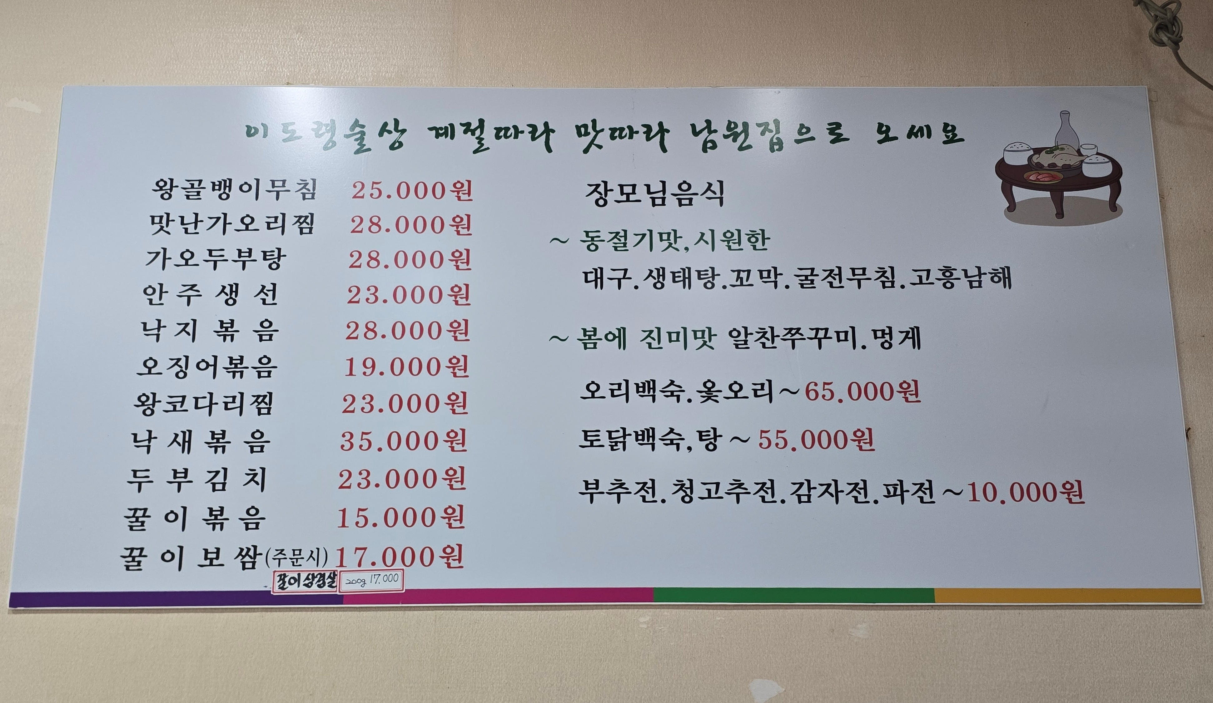 테이블이 다섯개 남짓한 자그마한 공간은 "밥집이냐? 술집이냐?" 주당들이 모이는 집합소란다. 욕쟁이 별명이 붙을 정도로 호불호가 강한 여사장님 혼자 운영하는 곳으로 사전 예약하지 않으면 자리 없을적이 많을 정도로 주당들에게는 유명한곳. 가오리찜.생선구이. 생선조림 인기메뉴.