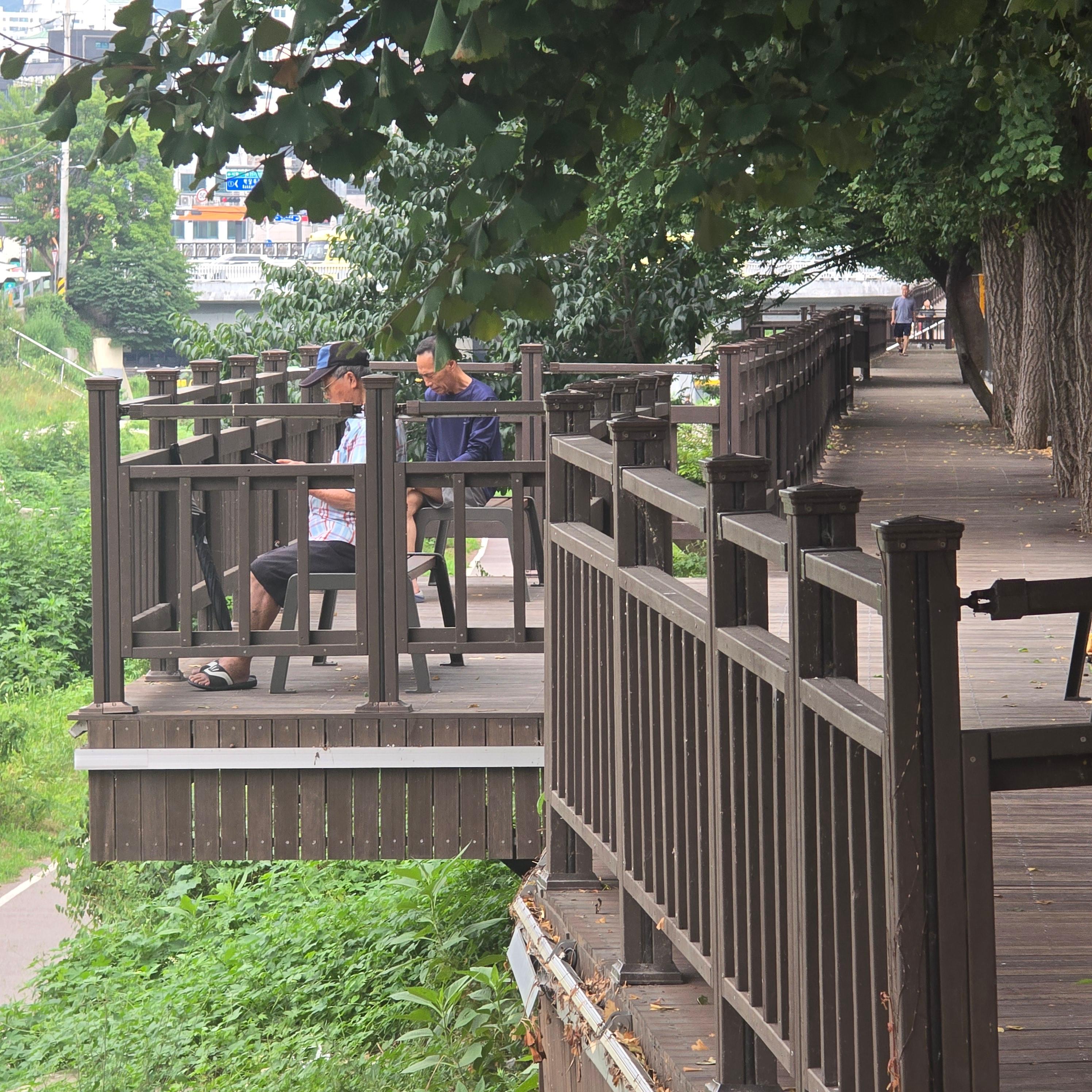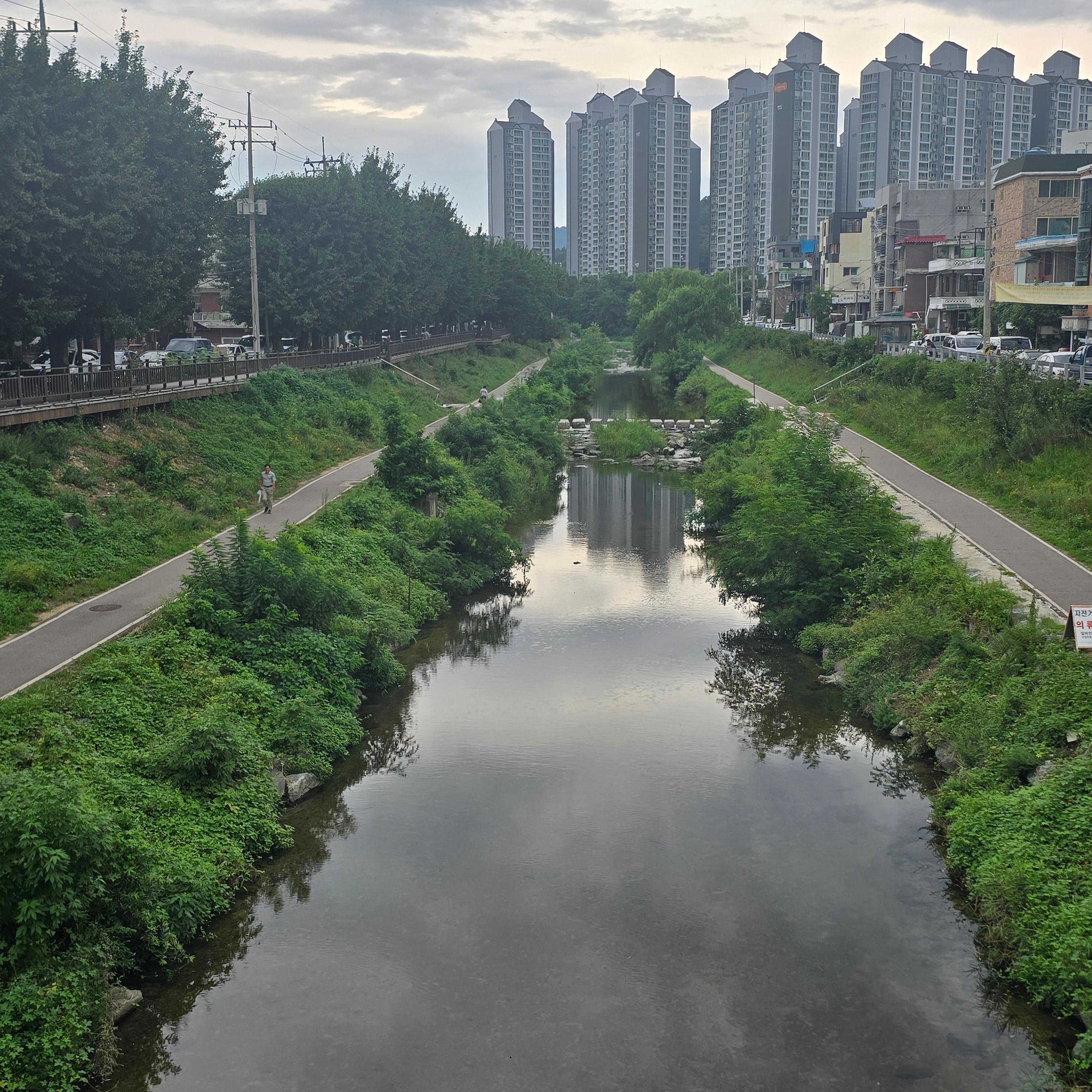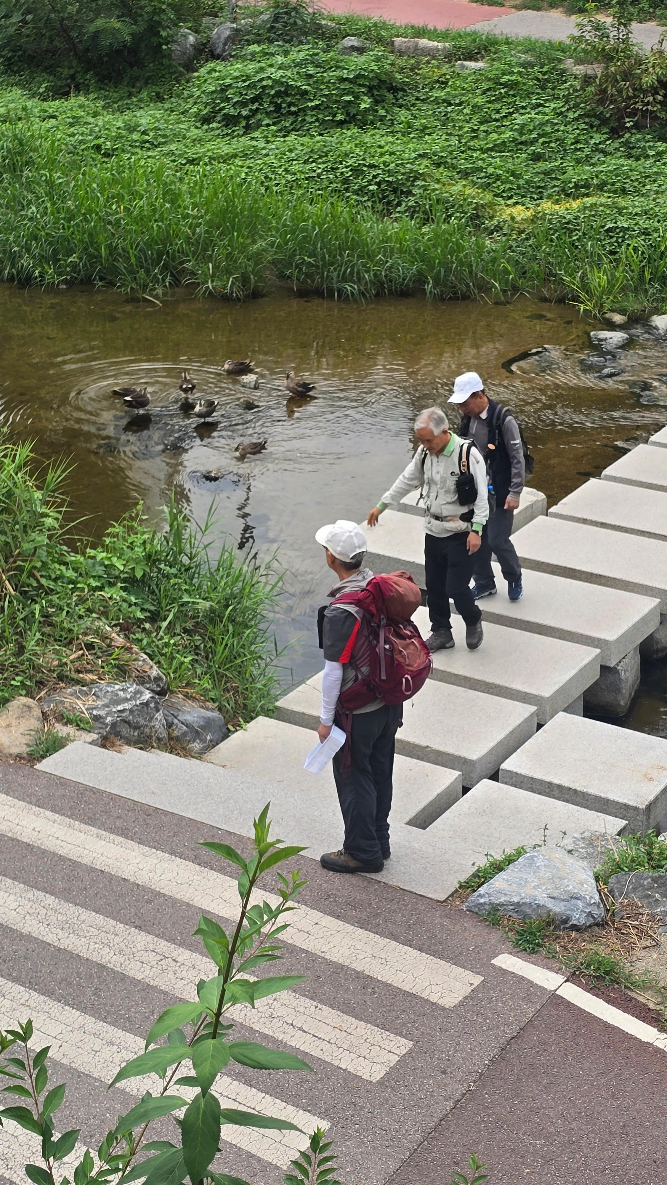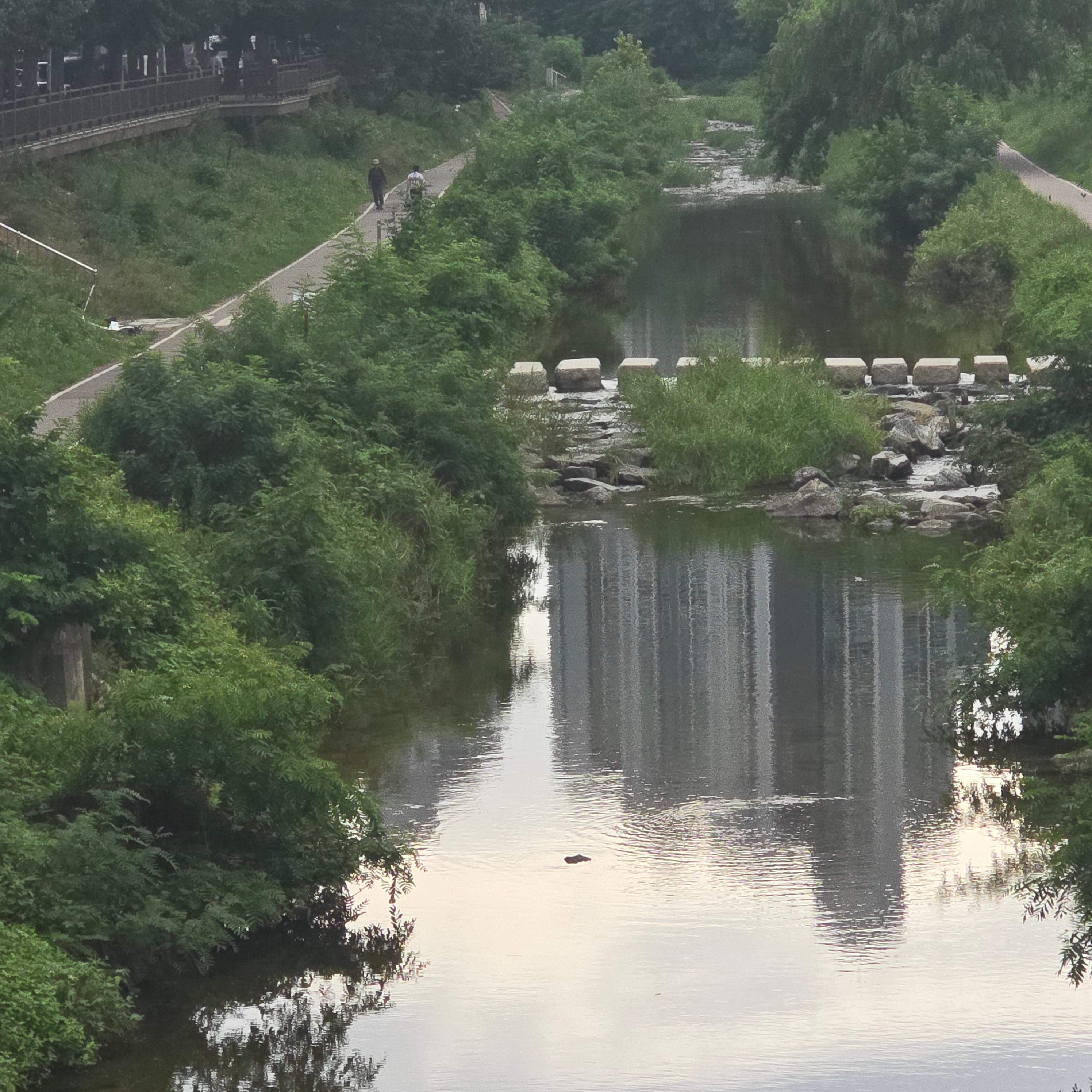2025.08.09/ #도시기록 #안양 #삼막천/ 정겨운 풍경들/ 안양천과 삼막천 합류부에서 은행나무 그늘이 좋은 하천 좌측 나무데크길 산책로를 따라 걷다보면 삼막천과 삼성천 합류부에 이른다. 이곳에는 여러 마리의 오리들이 노닐면서 관악산과 삼성산 등산후 안양예술공원부터 섬성천을 따라 걸어온 등산객들을 반겨준다. 합류지점 아래쪽으로는 물 낙차가 큰 돌여울이 있어 시원한 물소리를 들을수 있고, 검정 실잠자리들이 춤 추는것을 볼수 있다. 합류지점에서 삼성천 물길을 거슬러 오르면 만안교를 만난다.