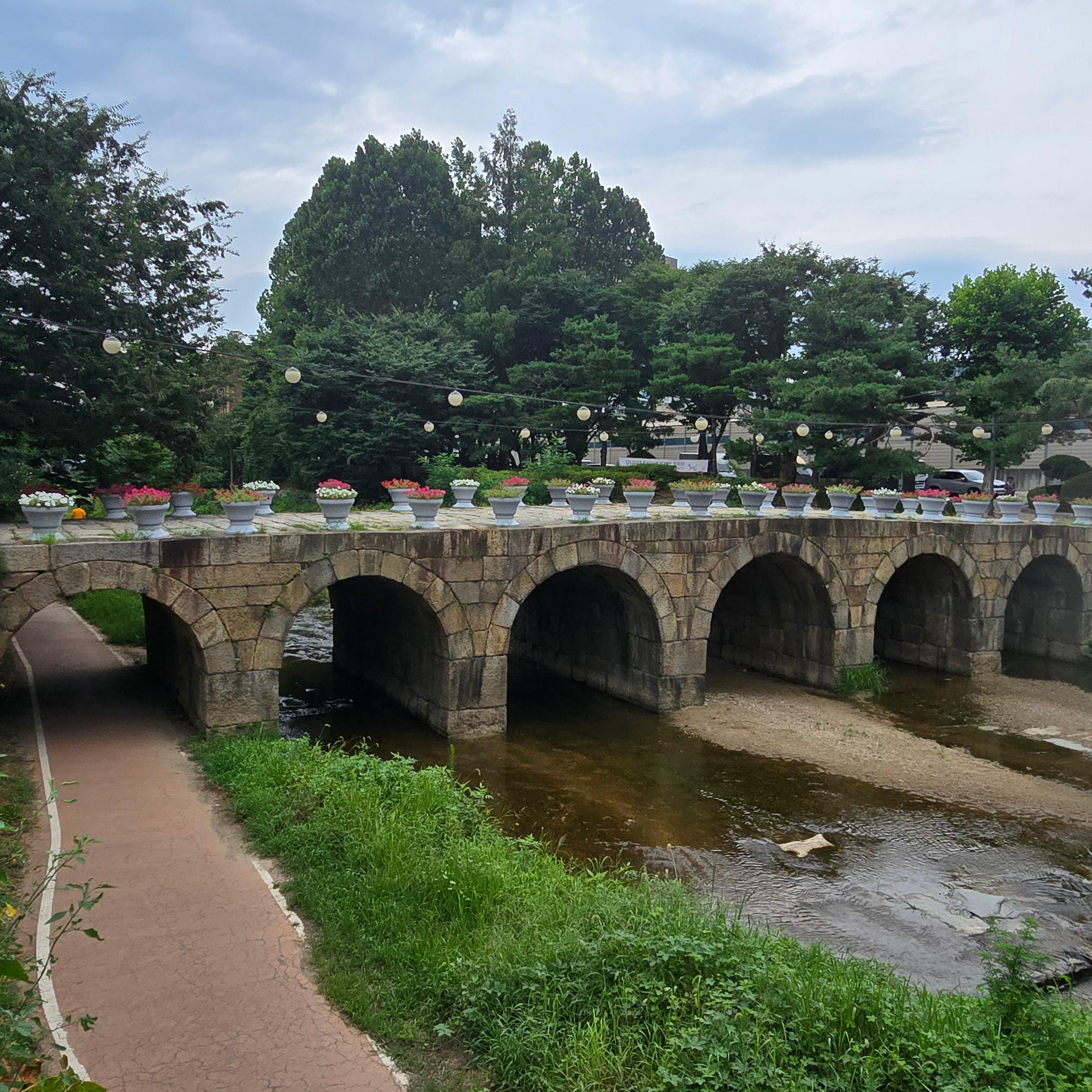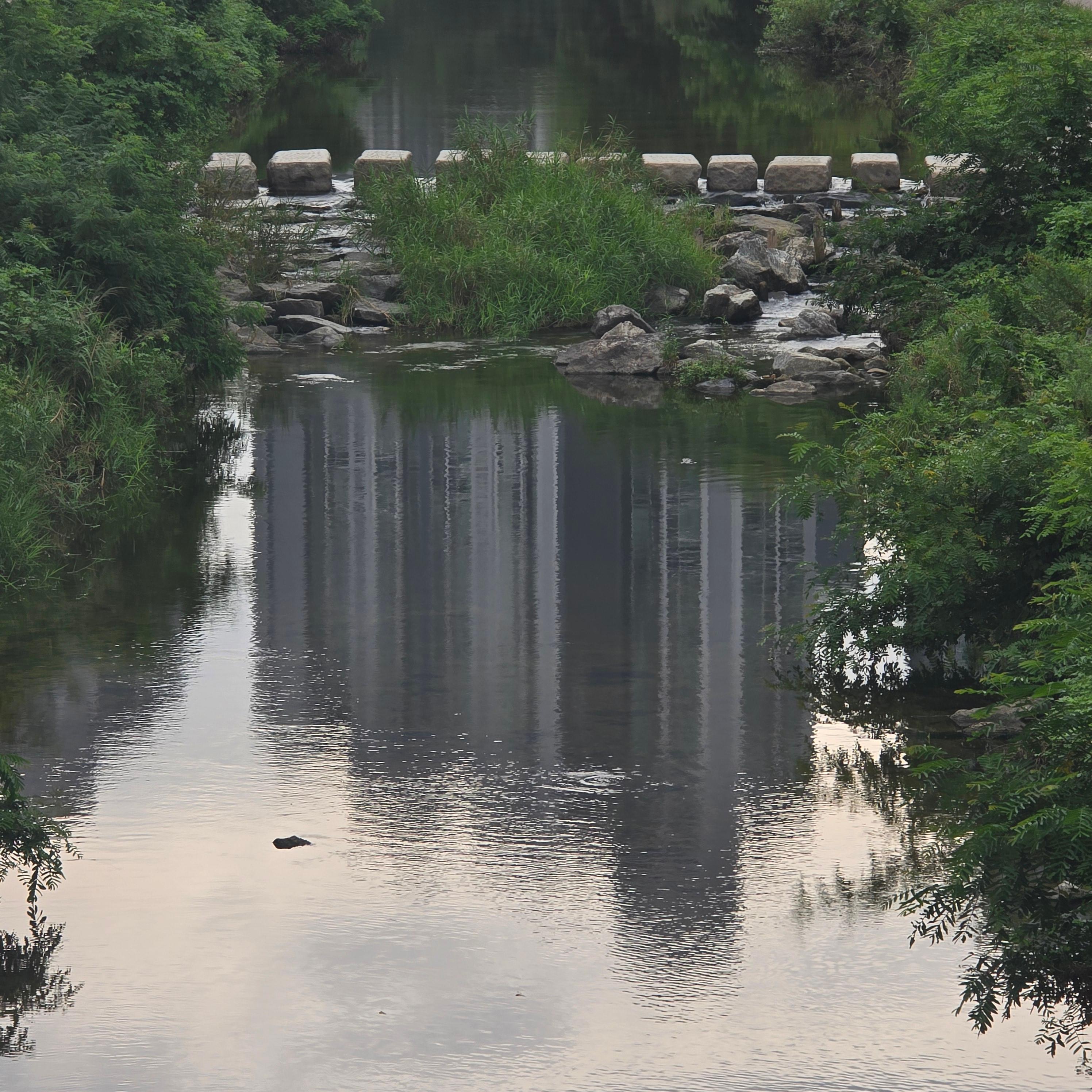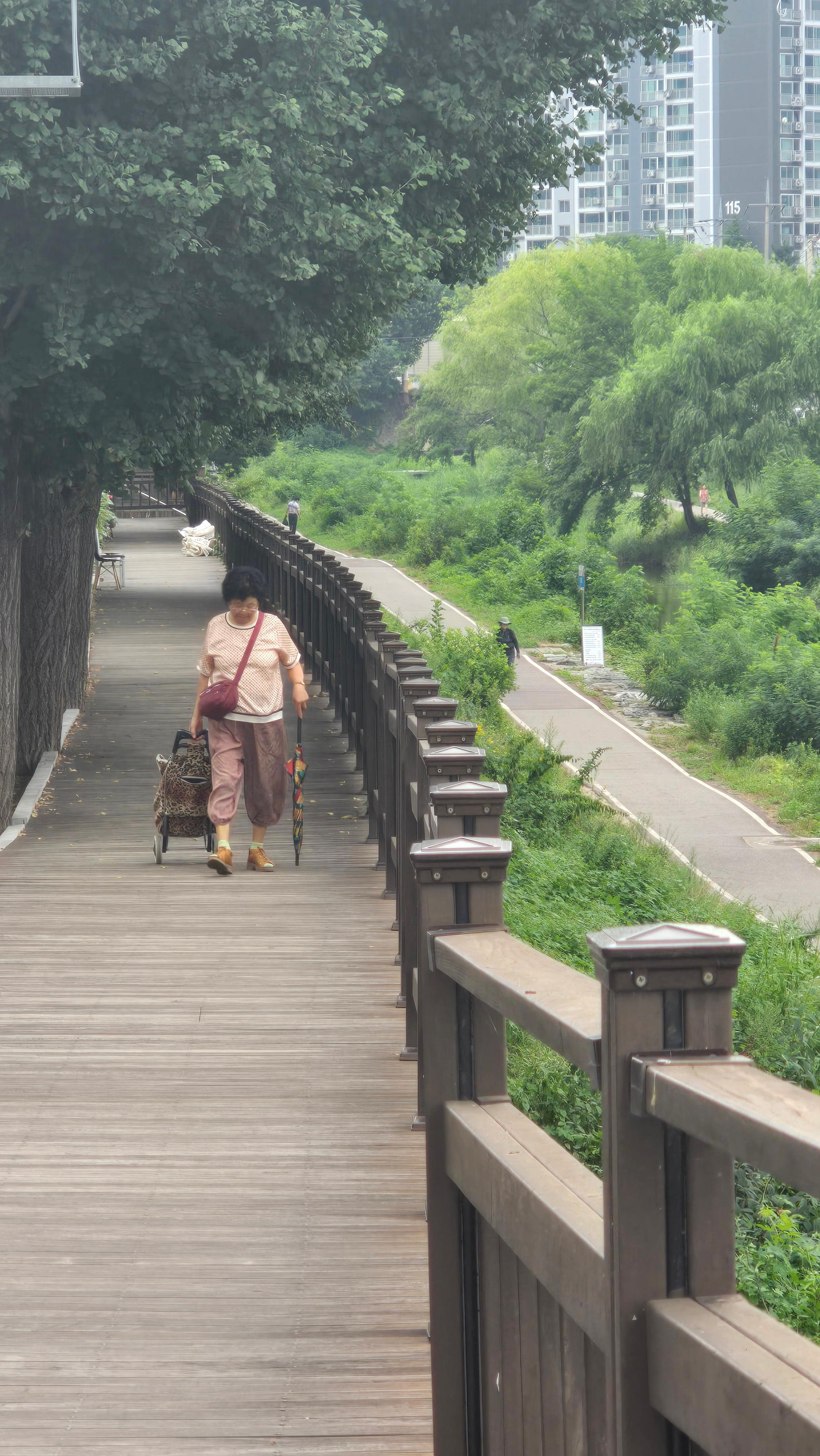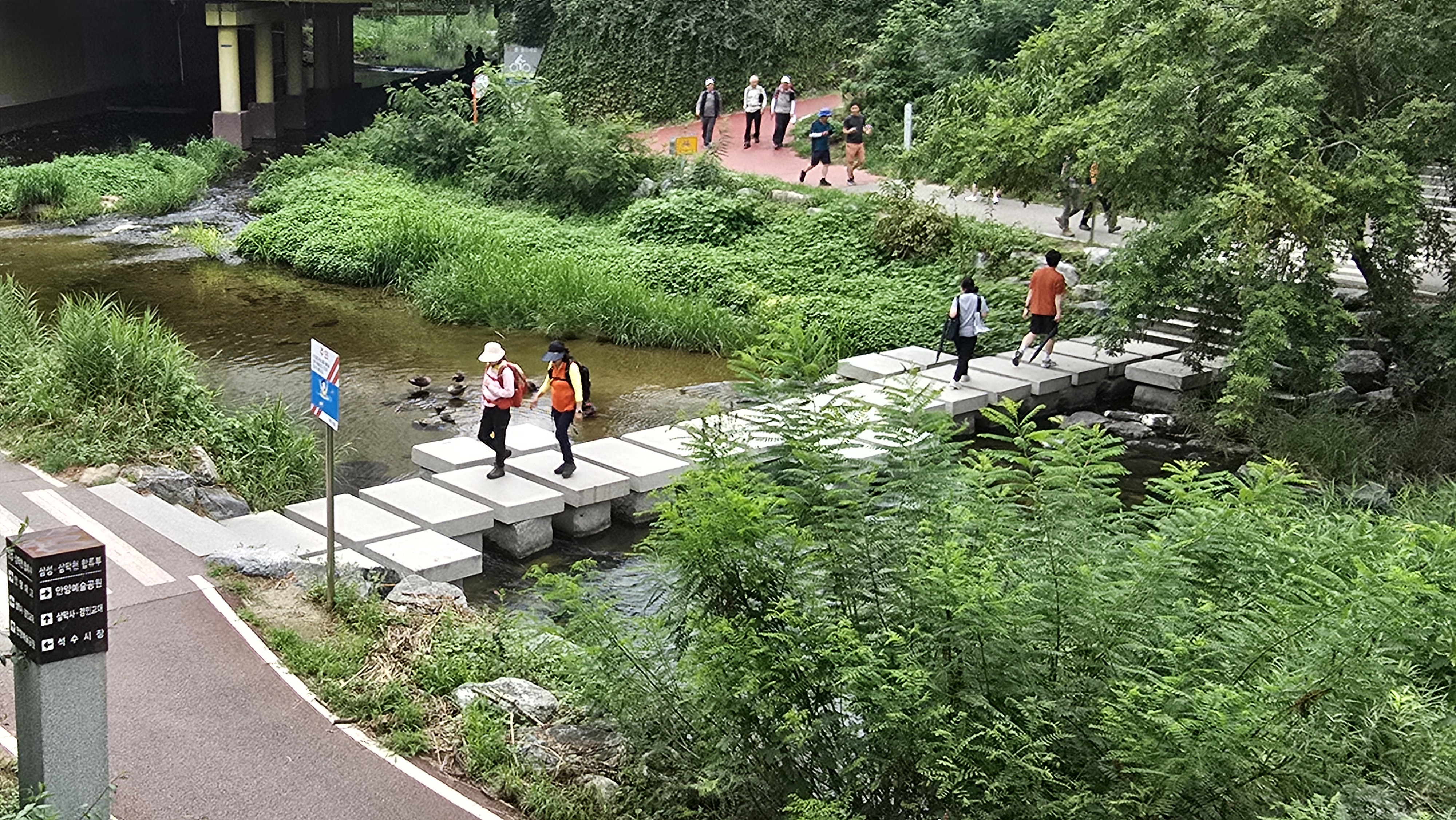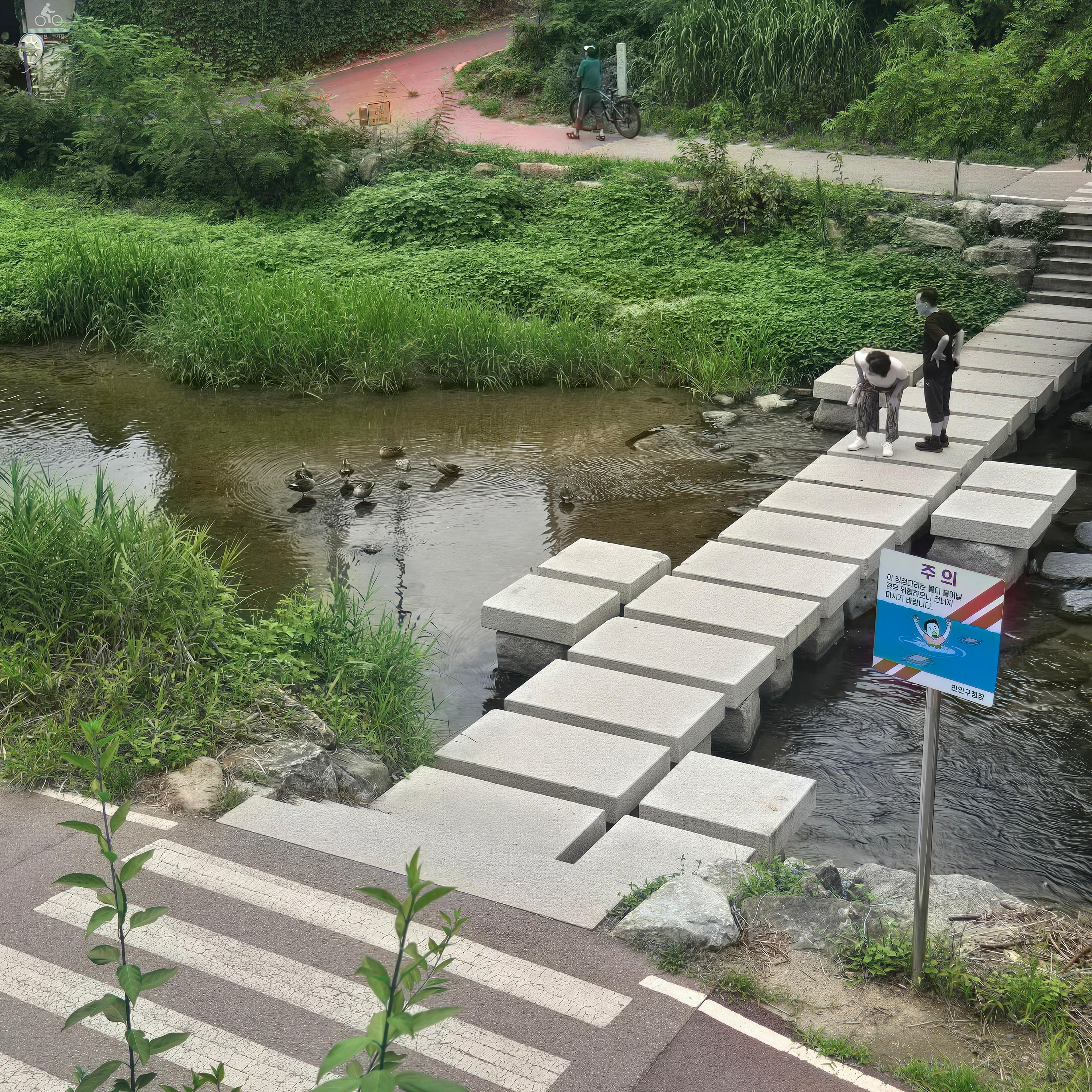 2025.08.09/ #도시기록 #안양 #삼막천/ 정겨운 풍경들/ 안양천과 삼막천 합류부에서 은행나무 그늘이 좋은 하천 좌측 나무데크길 산책로를 따라 걷다보면 삼막천과 삼성천 합류부에 이른다. 이곳에는 여러 마리의 오리들이 노닐면서 관악산과 삼성산 등산후 안양예술공원부터 섬성천을 따라 걸어온 등산객들을 반겨준다. 합류지점 아래쪽으로는 물 낙차가 큰 돌여울이 있어 시원한 물소리를 들을수 있고, 검정 실잠자리들이 춤 추는것을 볼수 있다. 합류지점에서 삼성천 물길을 거슬러 오르면 만안교를 만난다.