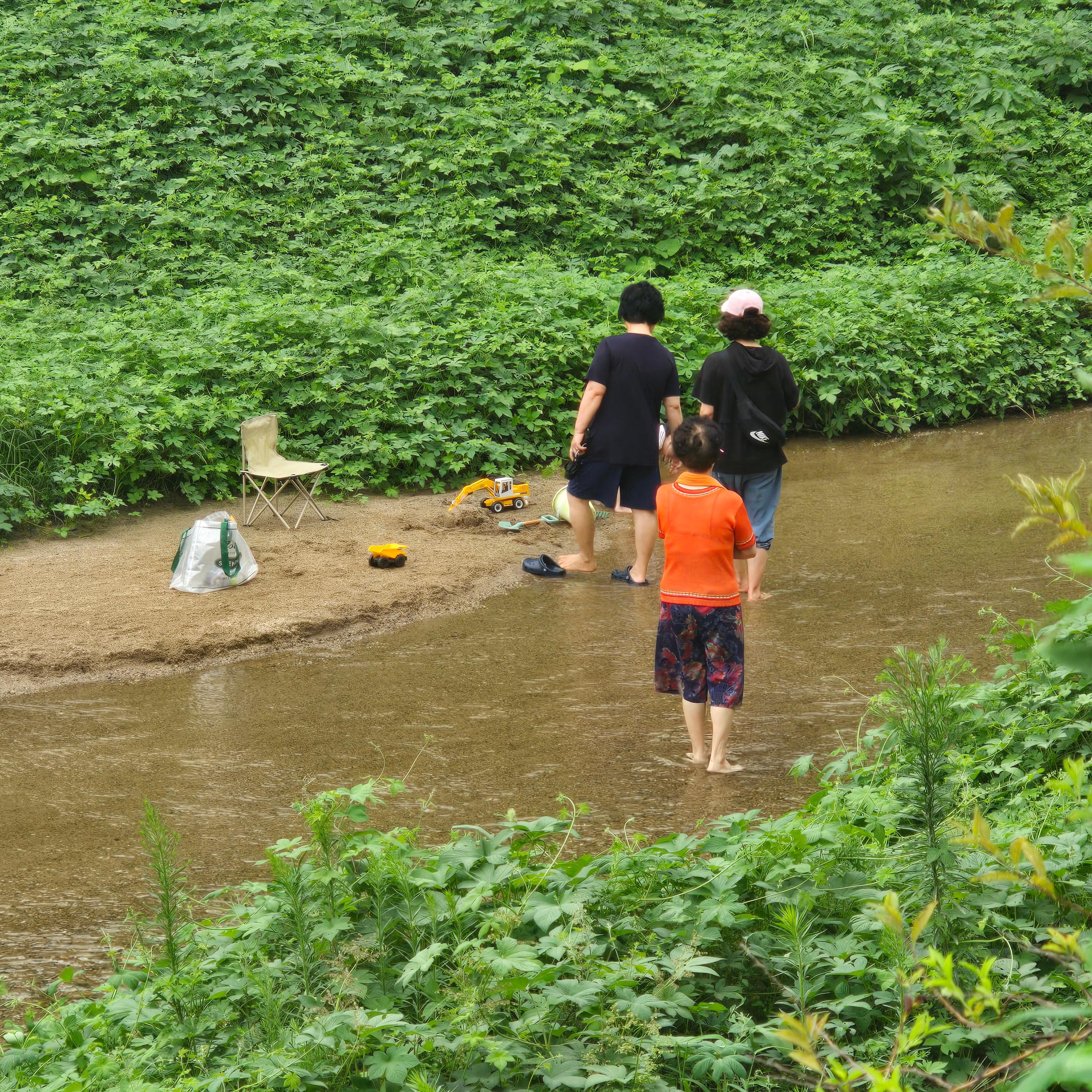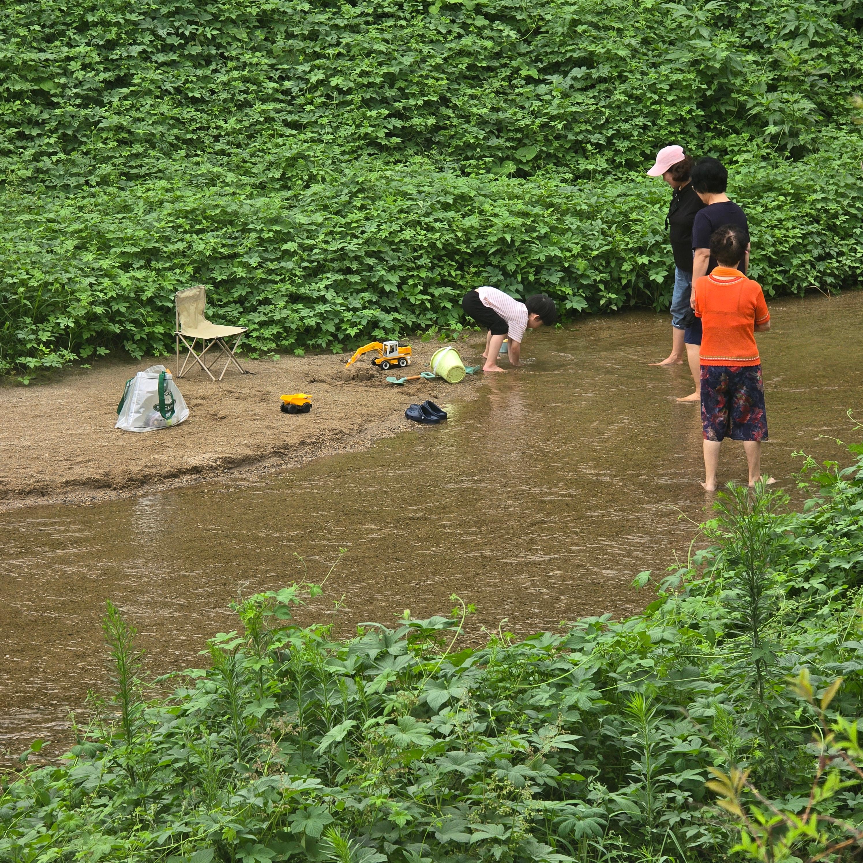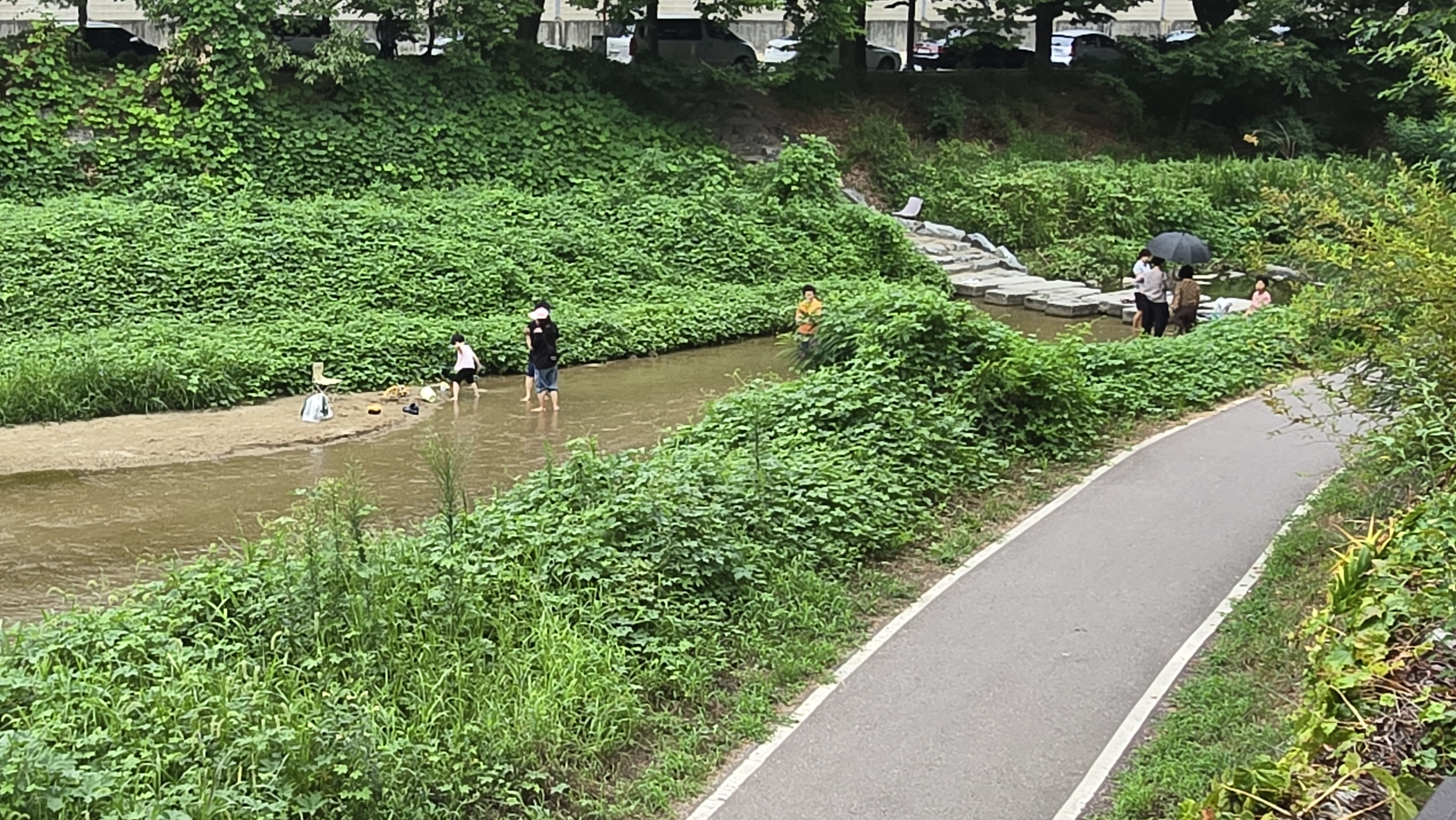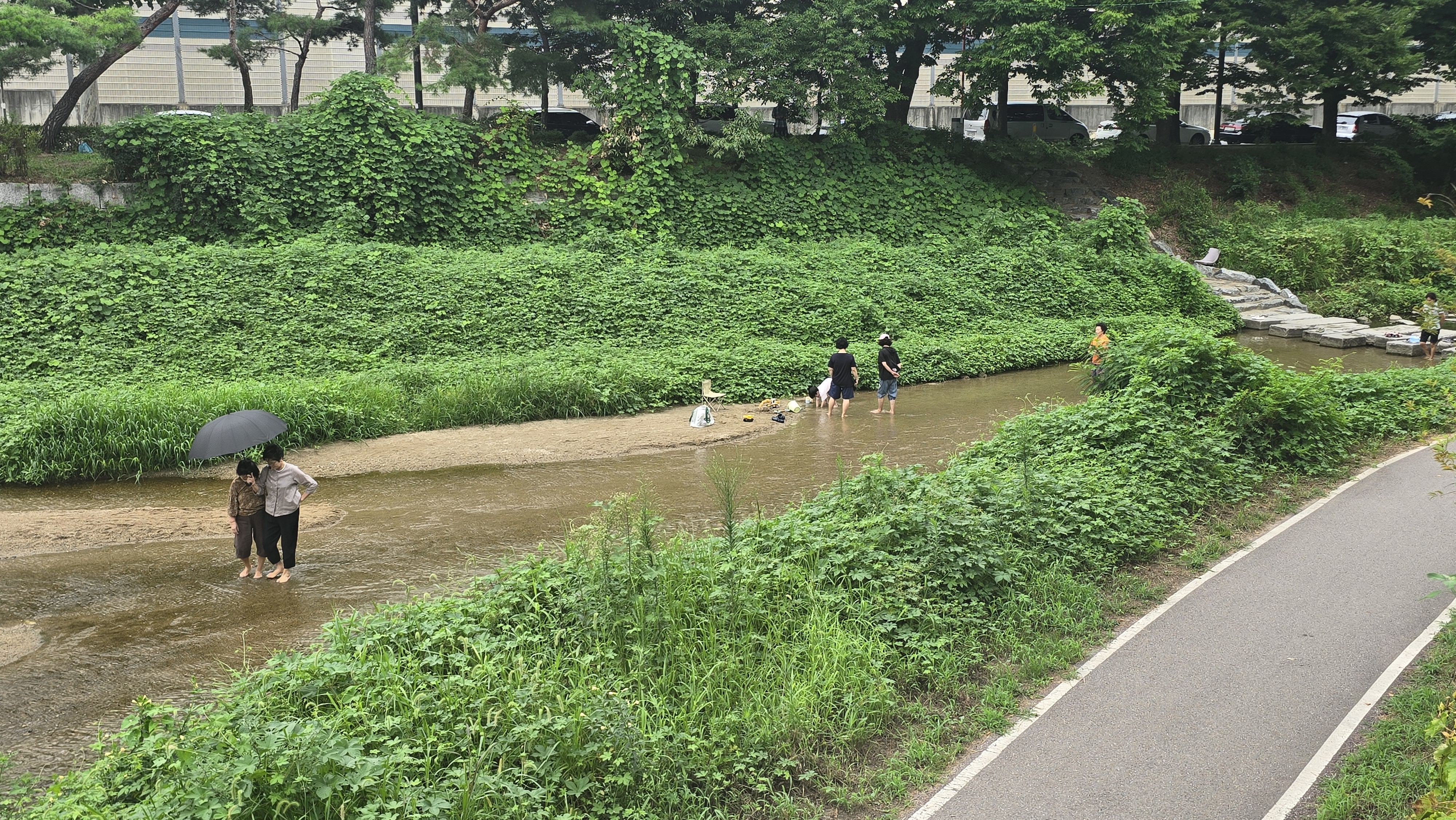 삼막천 만안교 아래 모래톱 물속에서 맨발 걷는 모습은 한달전인 지난 6월 한두명을 보았는데 오늘(8월 9일)은 장남감을 갖고온 아이가 모래로 놀이를 하고, 성인 여성 10여명은 모래톱이 깔린 물속에서 맨발로 걸으며 이야기 나누고 있었다. 그야말로 동네 사랑방 같은 모습이 보기 좋았다. 안양은 안양천과 연결되는 지천이 많기에 다른곳에서도 하천 물속을 걷는 시민 모습을 볼수 있을듯 싶다.