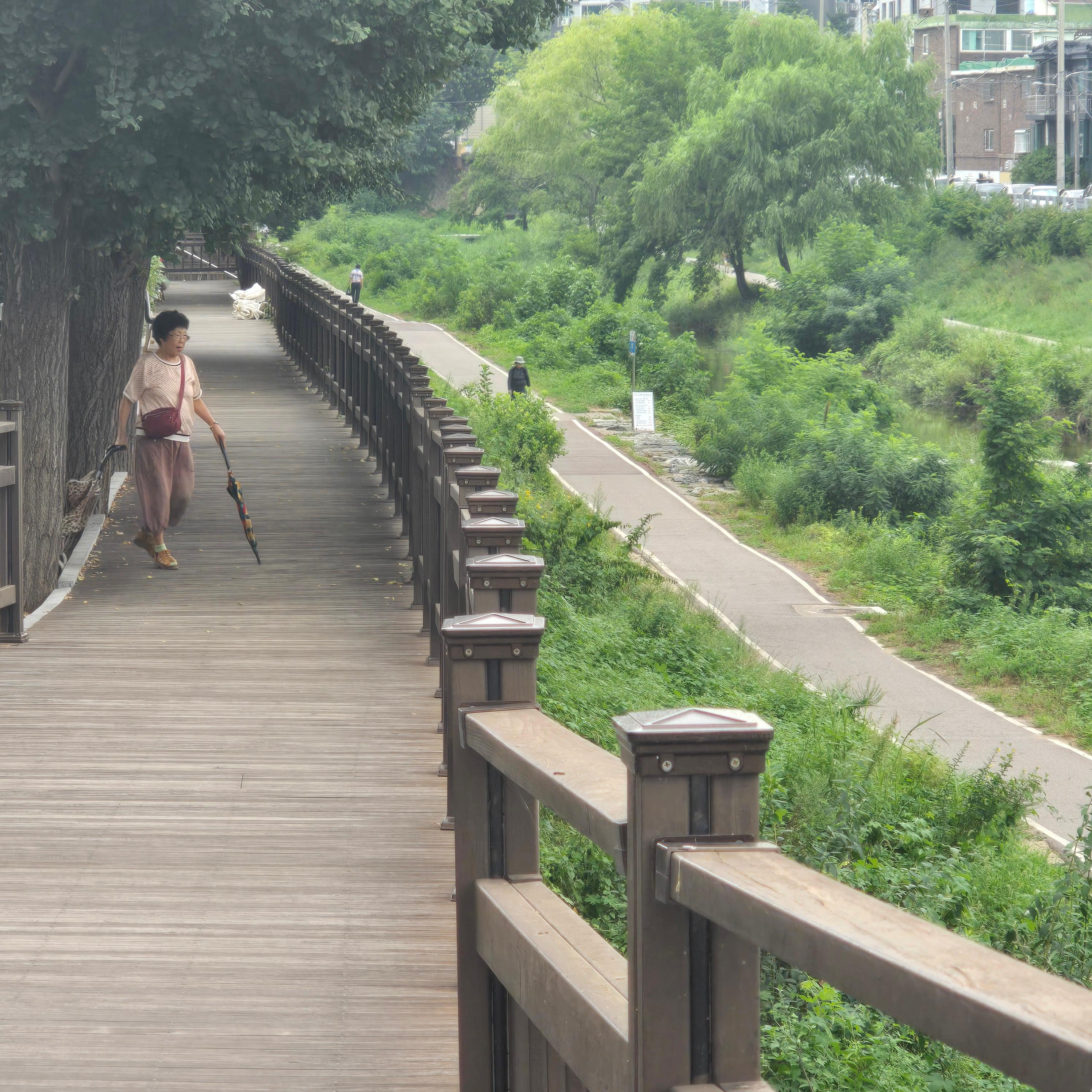 2025.08.09/ #도시기록 #안양 #삼막천/ 정겨운 풍경들/ 안양천과 삼막천 합류부에서 은행나무 그늘이 좋은 하천 좌측 나무데크길 산책로를 따라 걷다보면 삼막천과 삼성천 합류부에 이른다. 이곳에는 여러 마리의 오리들이 노닐면서 관악산과 삼성산 등산후 안양예술공원부터 섬성천을 따라 걸어온 등산객들을 반겨준다. 합류지점 아래쪽으로는 물 낙차가 큰 돌여울이 있어 시원한 물소리를 들을수 있고, 검정 실잠자리들이 춤 추는것을 볼수 있다. 합류지점에서 삼성천 물길을 거슬러 오르면 만안교를 만난다.