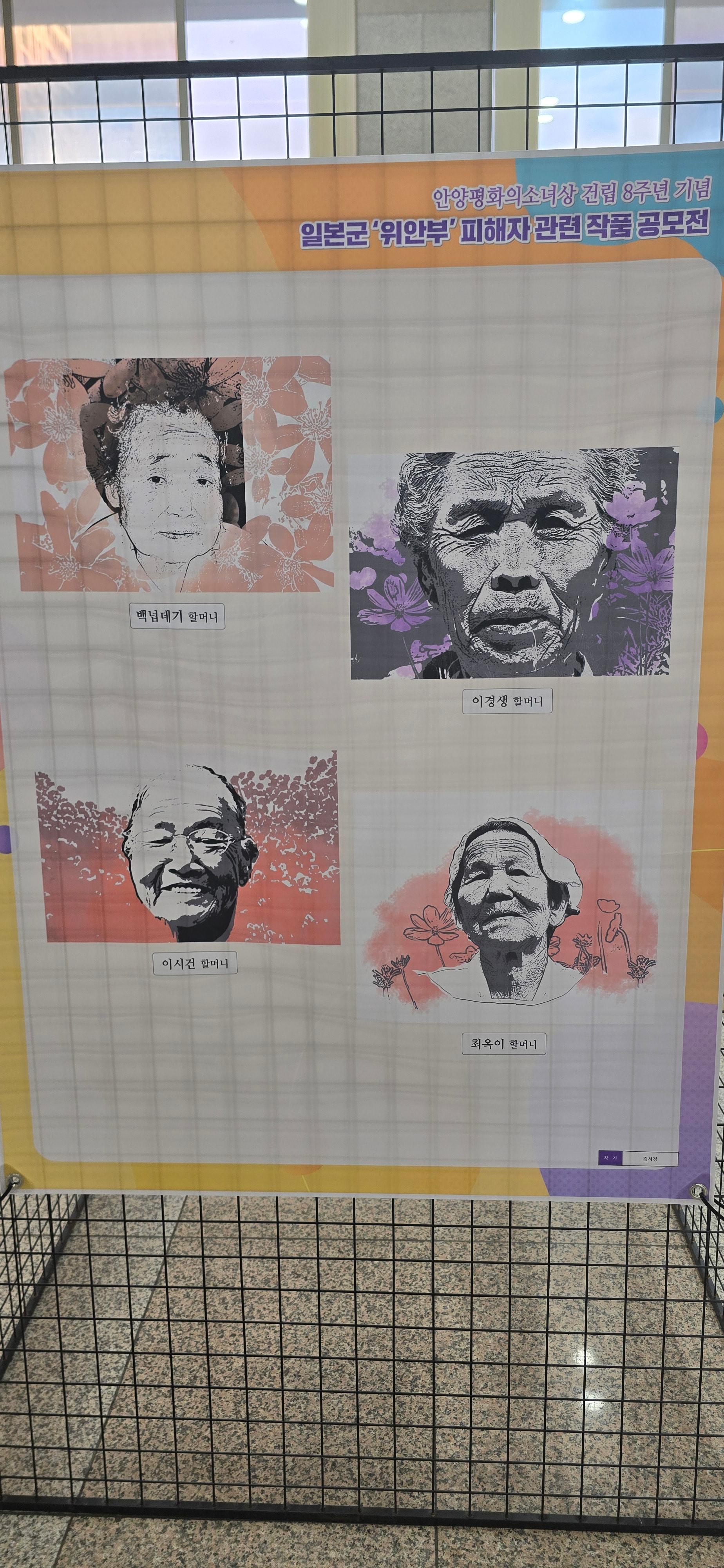 전시회에는 공모전을 통해 뽑힌 포스터(일러스트 분야) 작품으로 ‘김복동 할머니상’을 받은 안양시민학교 등 6명의 작품과 공모전의 수상 작품 및 출품작을 만나볼 수 있다.