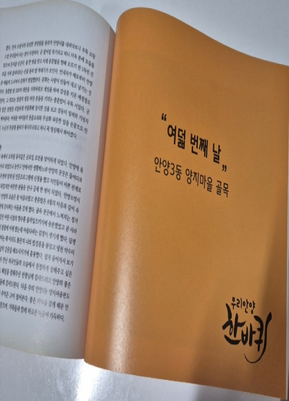 2017년이니까 벌써 8년이나 됐다. 안양시 인문학프로젝트 참여작가로 시민들과 함께 안양의 골목골목을 누비며 <우리안양 한바퀴>라는 책을 펴낸 게. 최근 출범한 안양작가회의의 눈 밝은 편집자가 누렇게 바랜 종이책에 갇혀 있던 글을 끄집어내 이쁜 새 책 <안양작가>에 담아 새 숨빛을 입혀주었다.