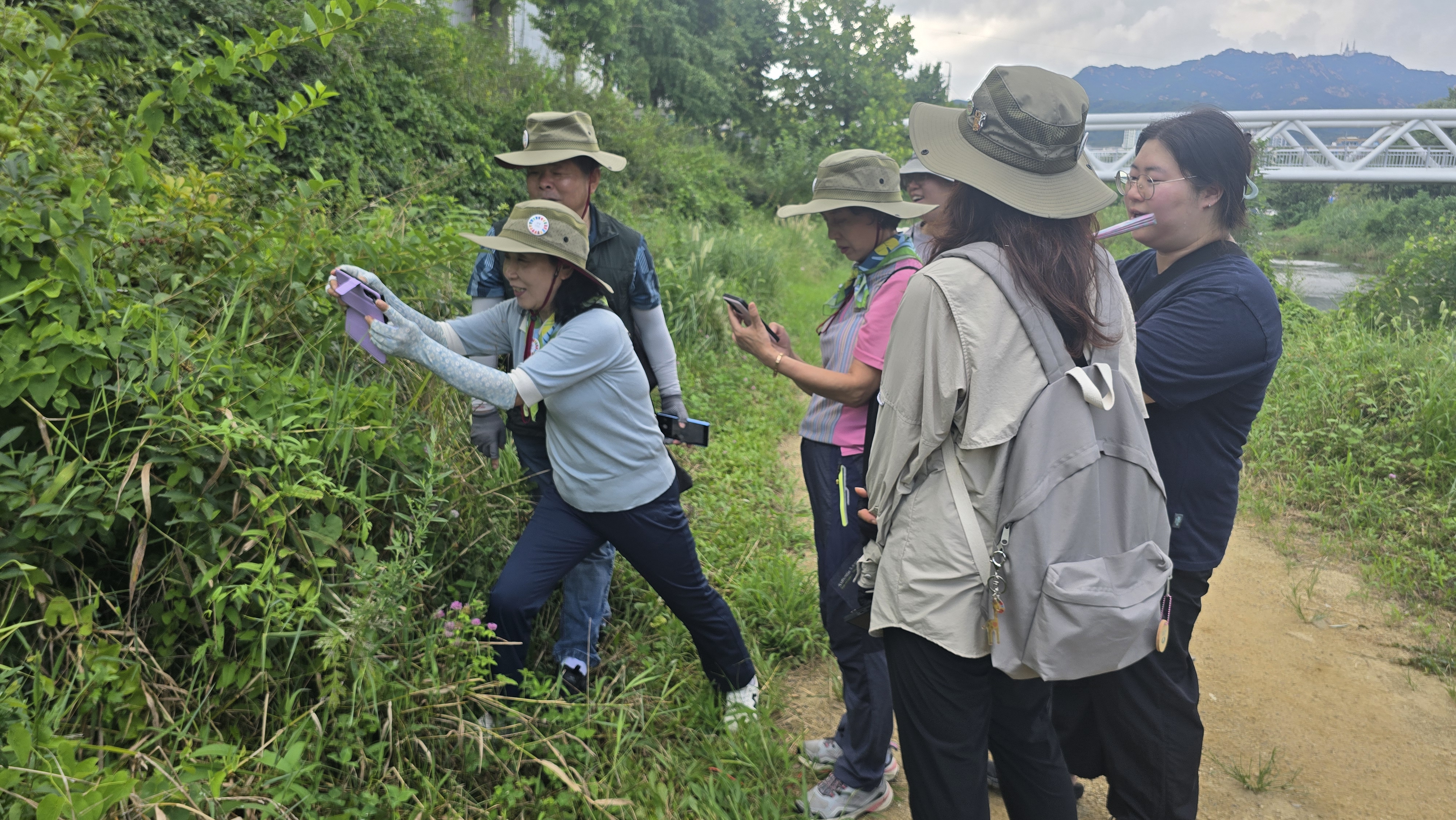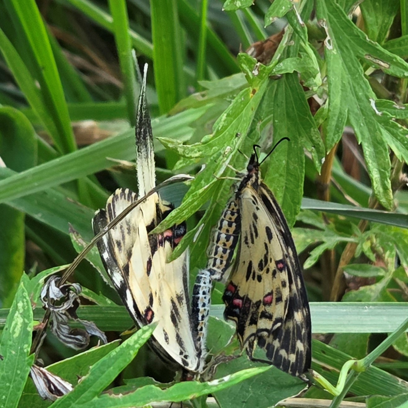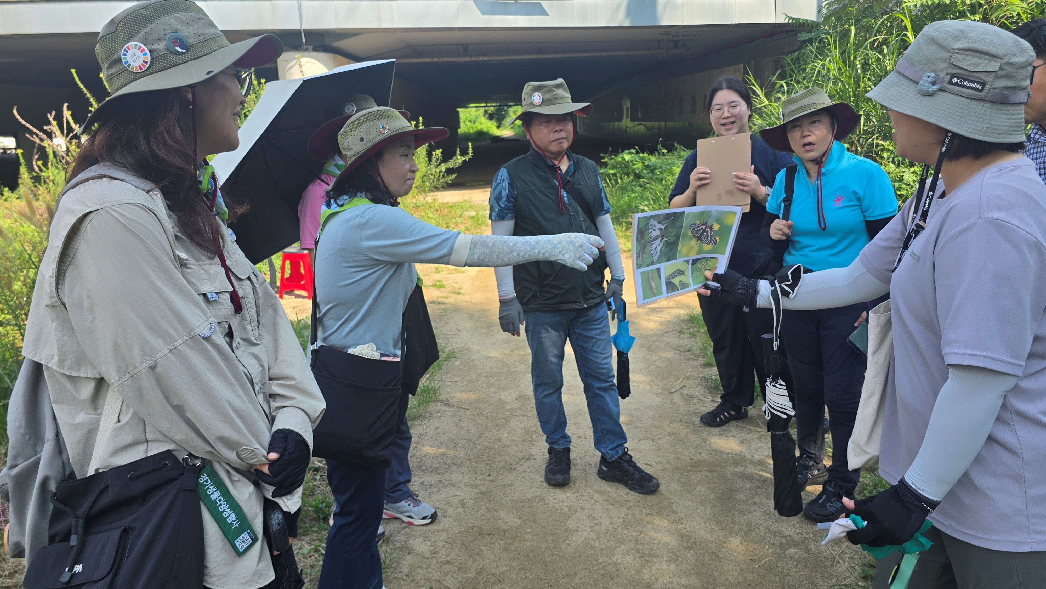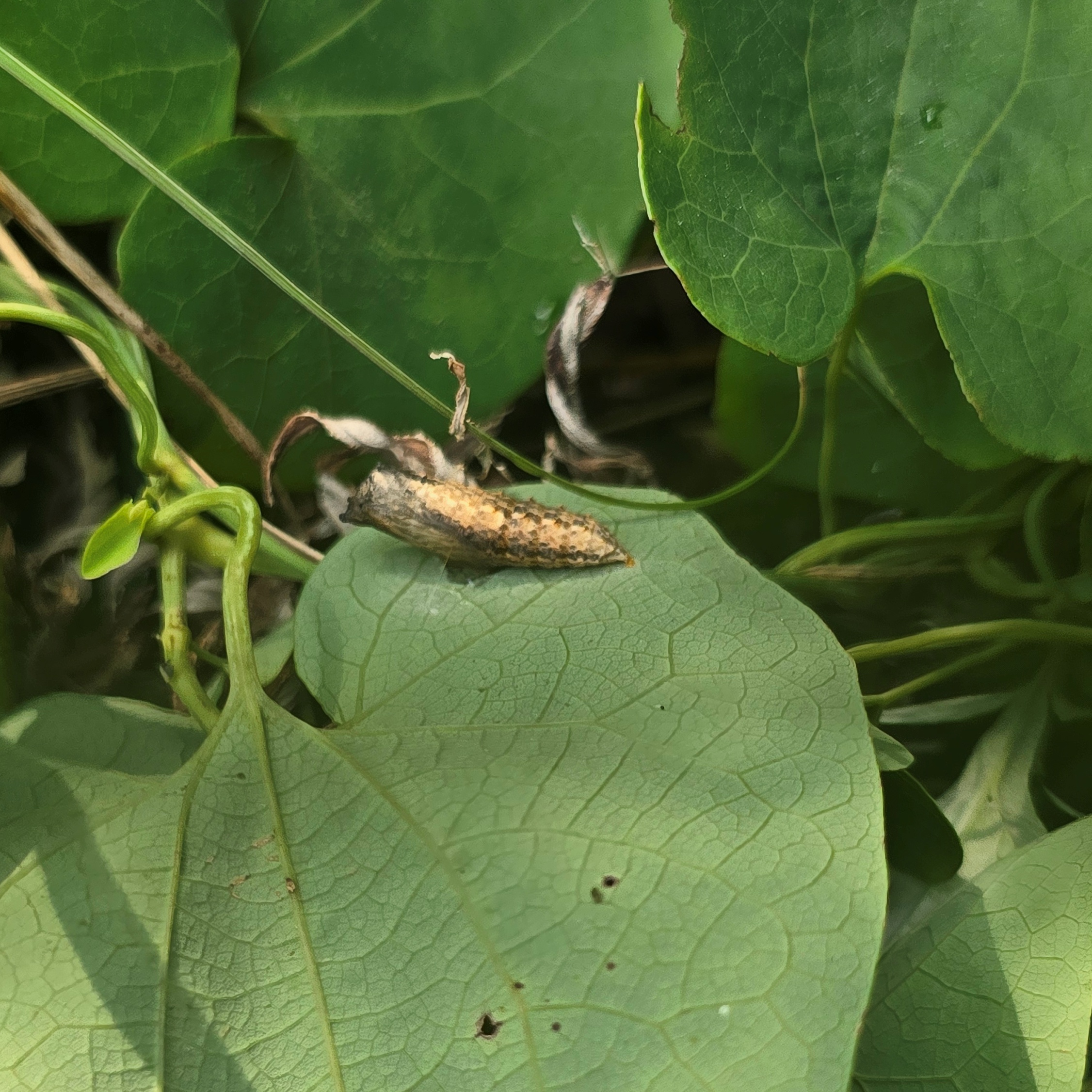 안양시지속가능발젼협의회 생태전환분과의 꼬리명주나비 자생지 모니터링. 안양 인덕원 학의천(인덕원~관양교 구간) 쥐방울덩굴 군락지에서. 여러 사람이 돋보기 같은 눈으로 탐색을 하니 역시 발견되는 것들이 많았다. 꼬리명주나비알과 번데기, 쥐방울덩굴 꽃과 열매, 꼬리명주나비 암캇과 수컷에 짝짓기까지. 애벌레만 빼고 다 보았다.