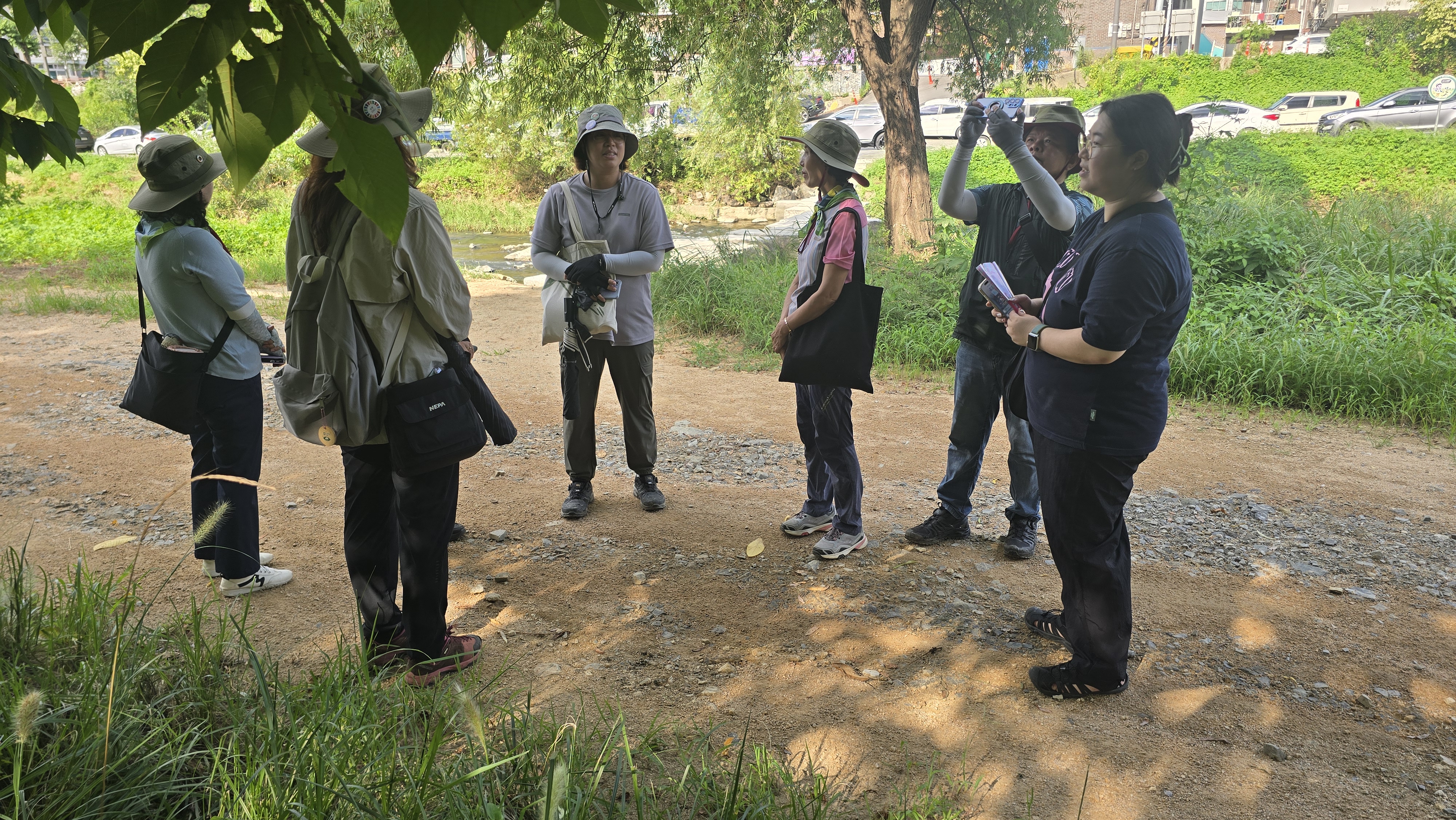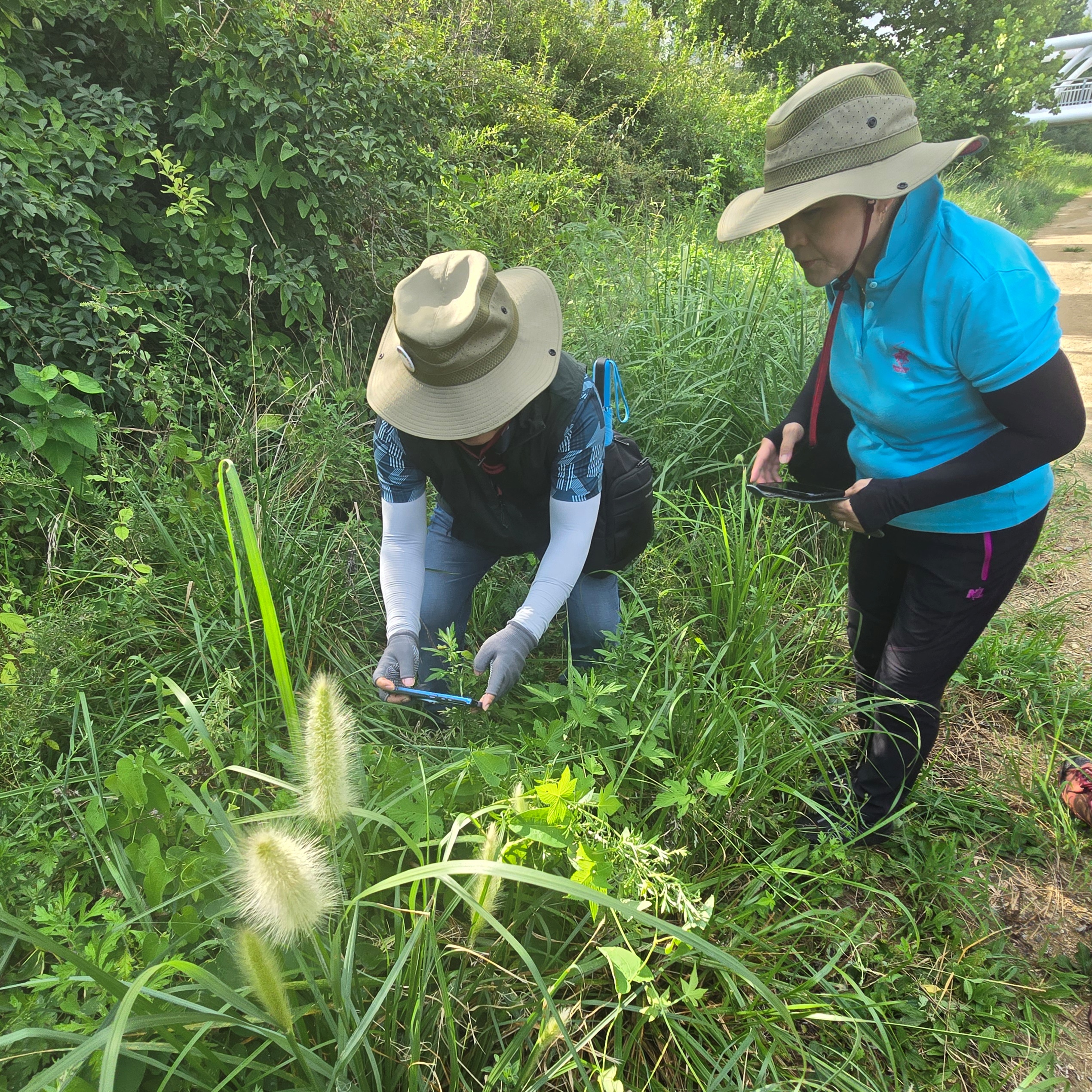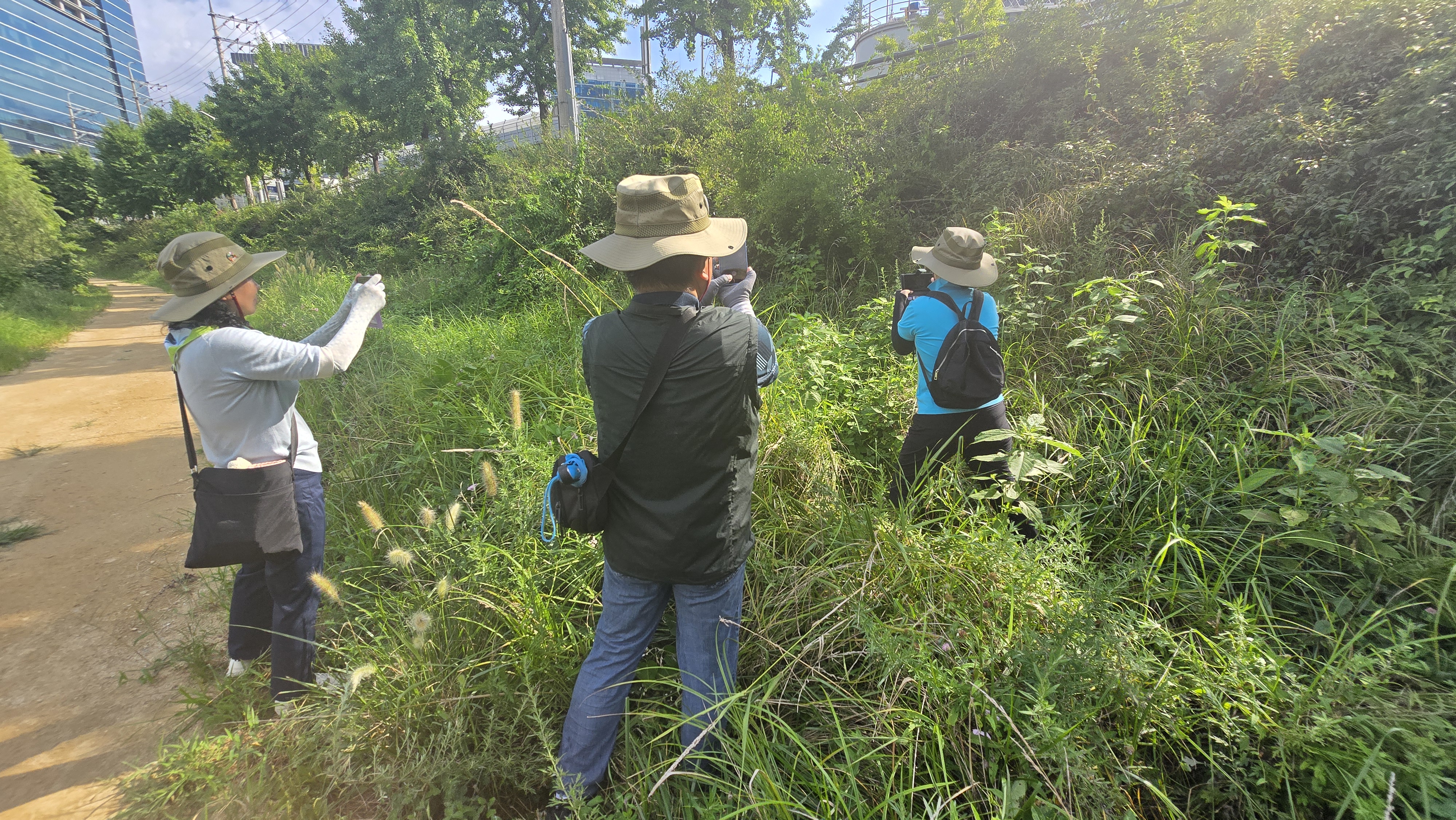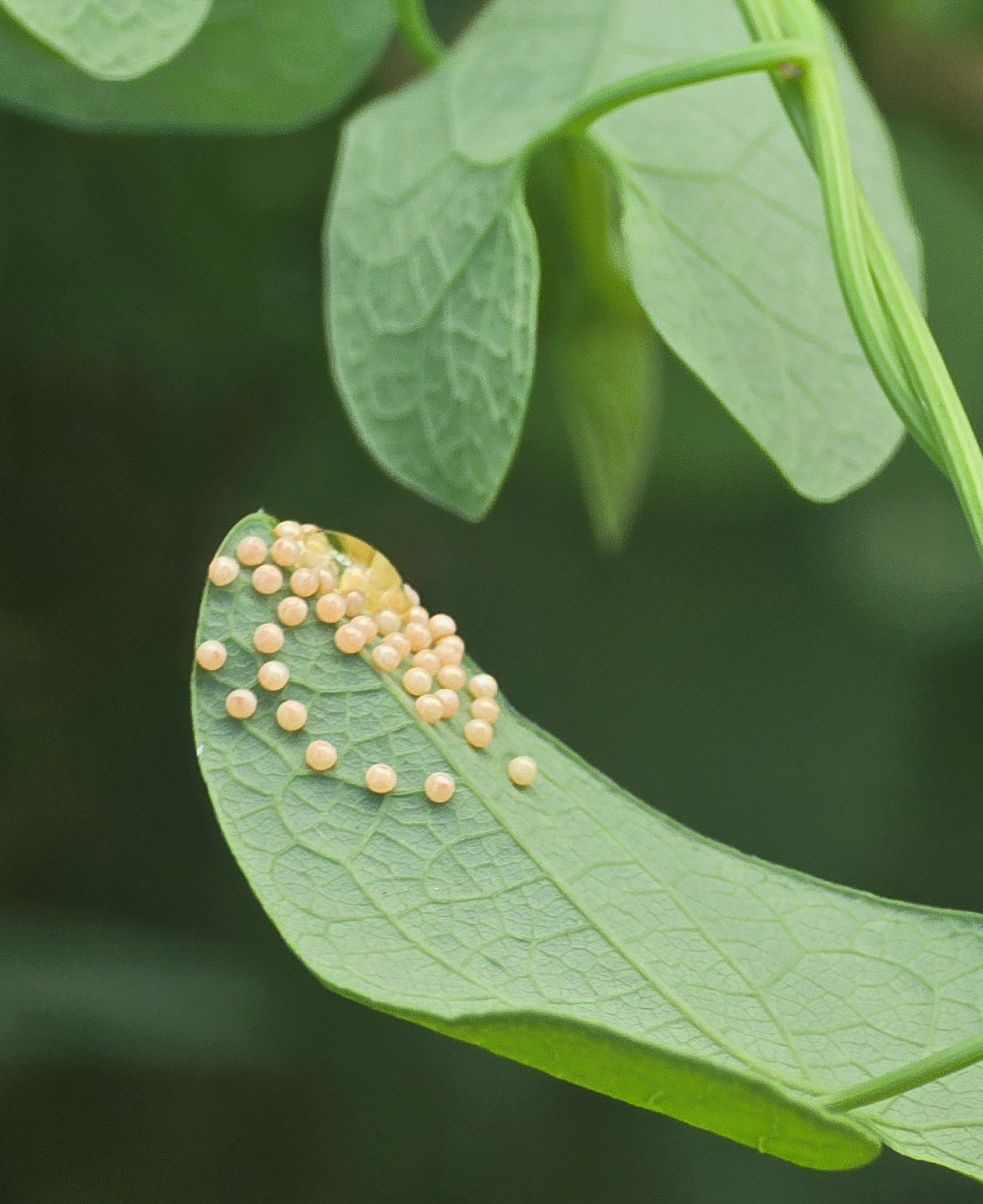 안양시지속가능발젼협의회 생태전환분과의 꼬리명주나비 자생지 모니터링. 안양 인덕원 학의천(인덕원~관양교 구간) 쥐방울덩굴 군락지에서. 여러 사람이 돋보기 같은 눈으로 탐색을 하니 역시 발견되는 것들이 많았다. 꼬리명주나비알과 번데기, 쥐방울덩굴 꽃과 열매, 꼬리명주나비 암캇과 수컷에 짝짓기까지. 애벌레만 빼고 다 보았다.
