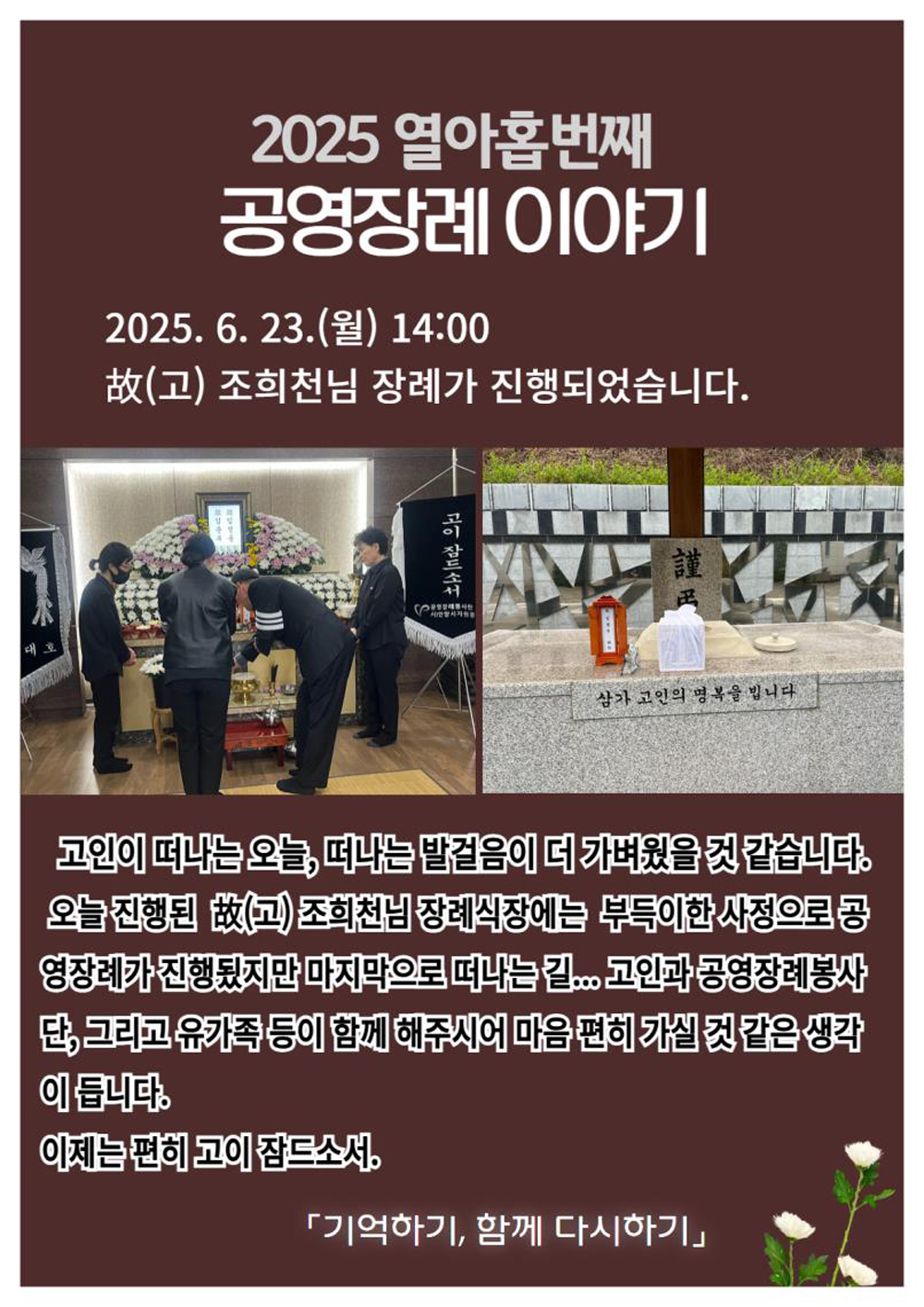 2021년 발족한 '우리동네 공영장례봉사단 리멤버(ReMember)'는 대리 상주 역할을 맡아 장례부터 봉안·안치·산골까지 동행하며 고인의 마지막 길을 존엄하게 지킨다. 현재 5기 34명의 봉사단이 활동 중이며, 발족 이후 올해 8월 말까지 총 87회의 장례를 치렀다. 또한 자원봉사센터 홈페이지에 무연고 사망자 부고를 게시해 유가족이나 친지를 찾을 기회를 제공하고, 시민 누구나 추모에 참여할 수 있도록 하는 등 따뜻한 장례 문화를 만들어가고 있다.