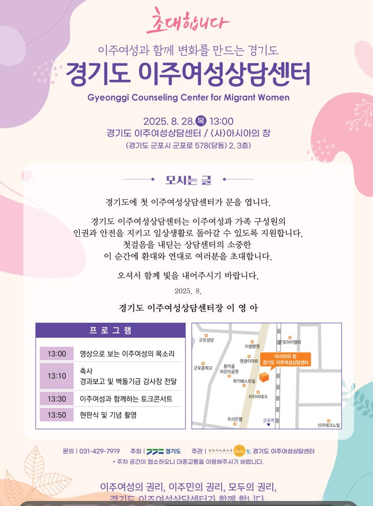 경기도 이주여성상담센터가 군포시(군포로 578)에 등지를 마련하고 지난 28일 개소식을 가졌다.